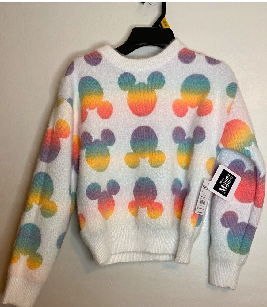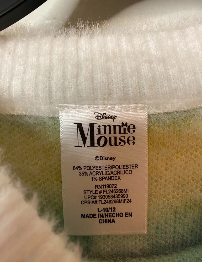 I offer combined shipping. Ask for details before you order! 😊 This Disney Minnie Mouse sweater in girls' size L features Minnie Mouse ears pattern, long sleeves, a pullover style with a crew neck, and is made of a super soft polyester blend fabric. The sweater is machine washable and suitable for casual occasions. It is colorful and stretchy, perfect for winter, fall, and spring. The design includes Minnie Mouse, Disney, and Mickey & Friends theme.