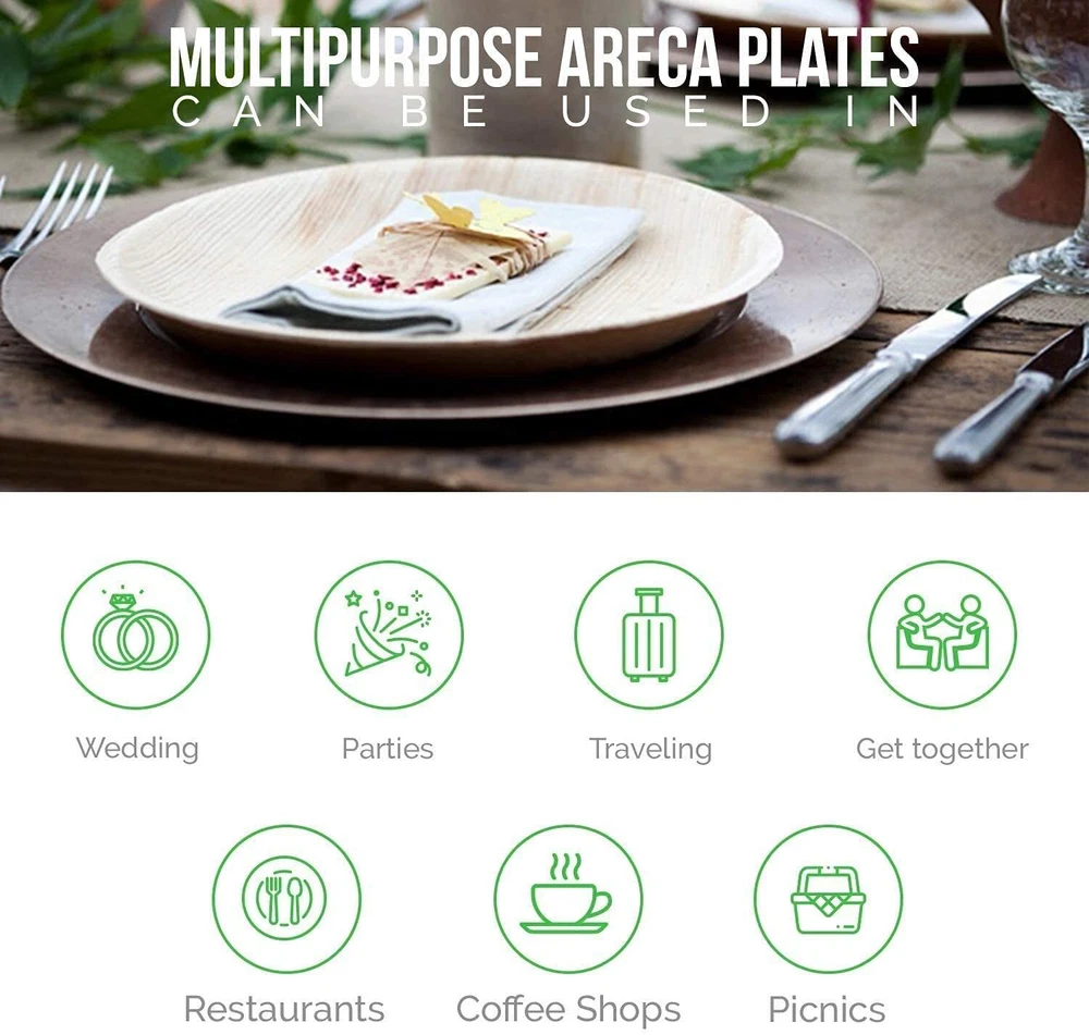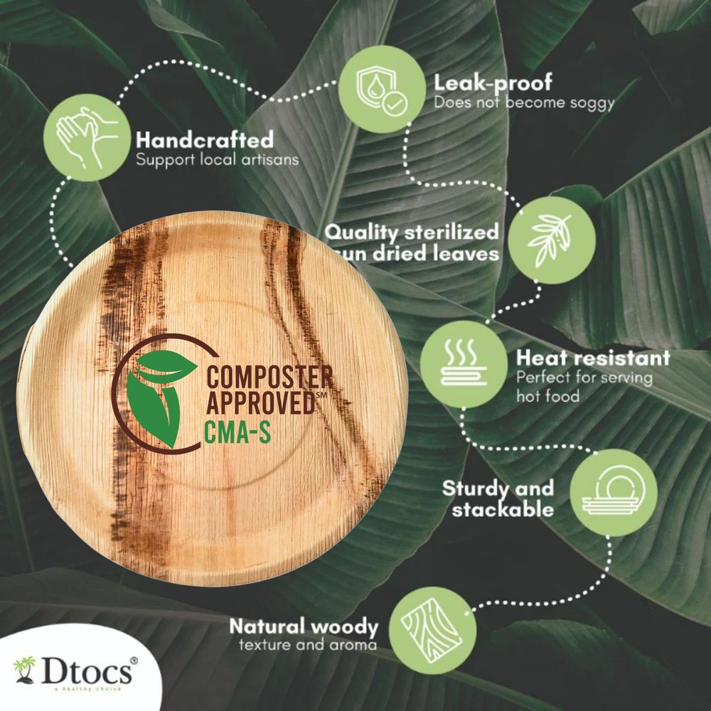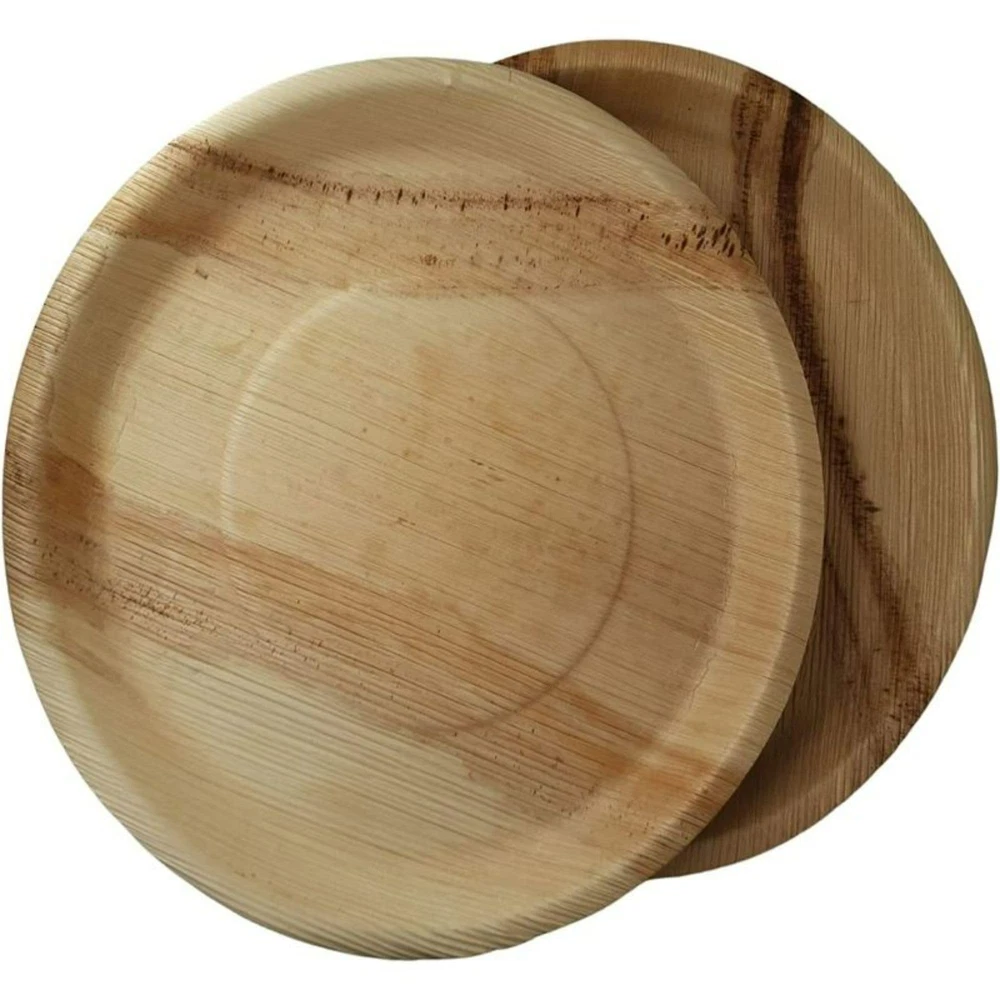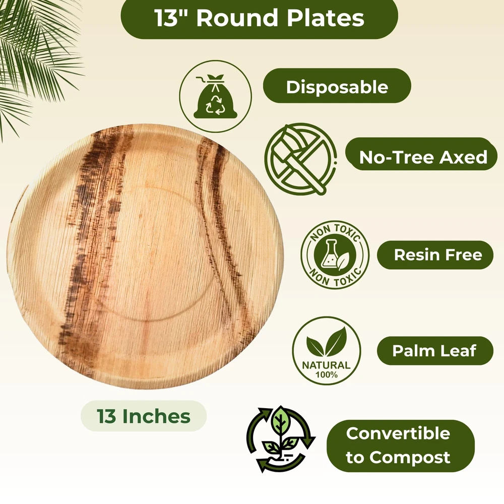 Sustainable & Compostable Serving Trays - Premium quality wooden tray look disposable serving trays are made from natural palm leaves without causing any damage to trees, hence these are compostable & sustainable in nature. Sturdy, Leaf proof & Grease Resistant: Made from centre portion of palm leaves, these disposable trays are very sturdy and can also be used as serving tray, pizza plate, charcuterie board, cheese board, grazing at weddings, camping, BBQ, luau, Dinners, food trucks, restaurants, thanks giving, Christmas, porch party or as beach dinnerware. Aesthetic Appealing Microwave Safe Trays - Since these round disposable platters are made from center portion of the palm leaves, these are very sturdy and can withstand high temperature. These microwave safe trays can be used for reheating. Each platter tray carries it's own character with unique woody look and natural aroma, Heavy Duty & Elegant: These palm leaf round platters are among the strongest palm leaf trays with heavy duty design that won't break or sag. Sturdier than any serving platter & plastic disposable serving trays, these are versatile large round plates Complete Party Dinnerware Set: aims to serve it's customers with best valued natural compostable disposable kitchen utensils thus we have backed our fancy palm leaf plates, disposable soup bowls, charcuterie boards, platters & trays with total satisfaction . So with confidence and start dining in eco-friendly style.