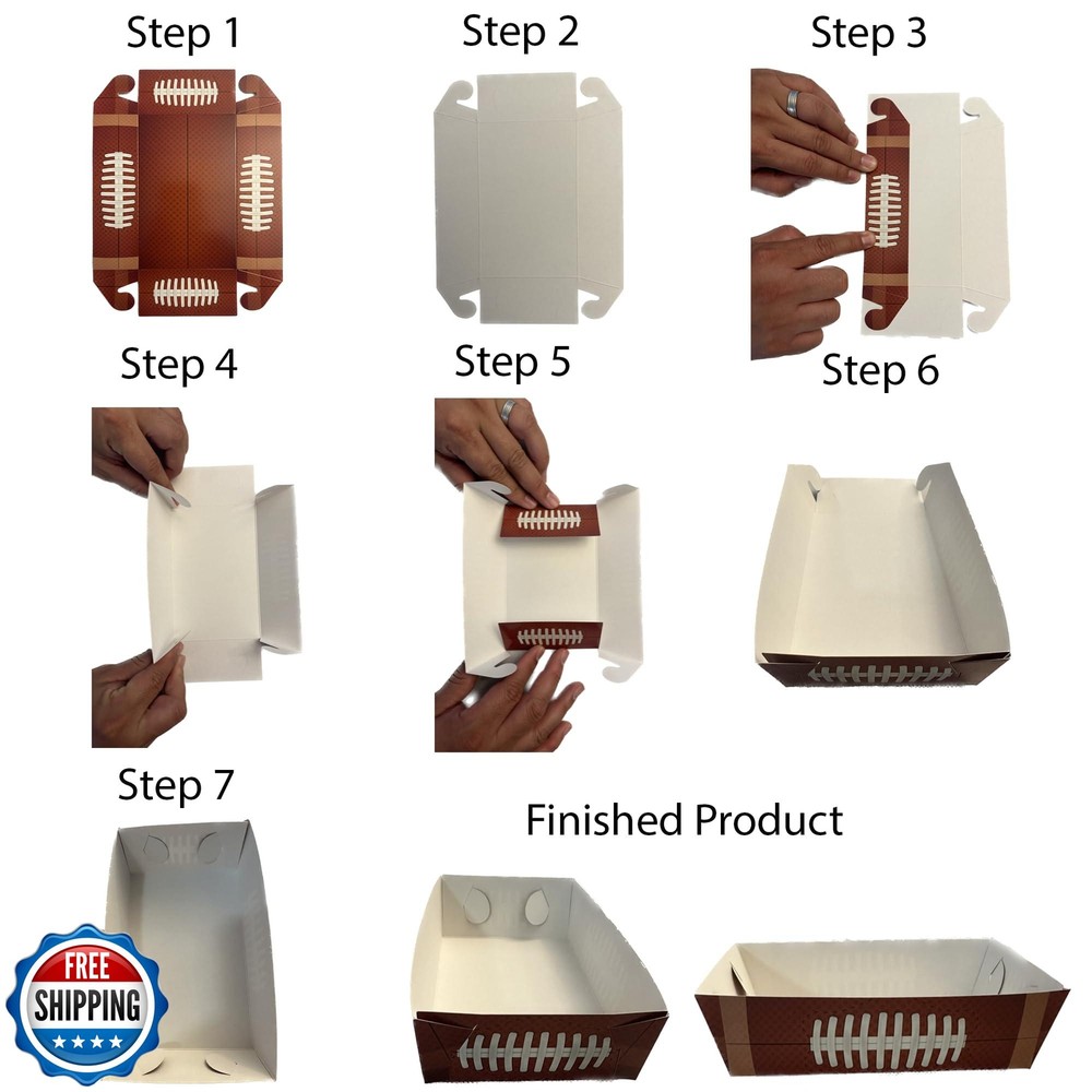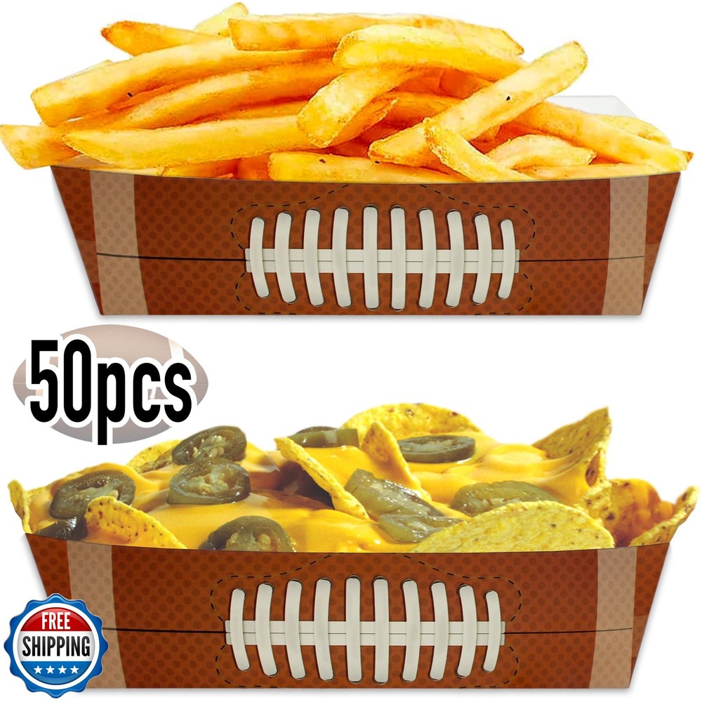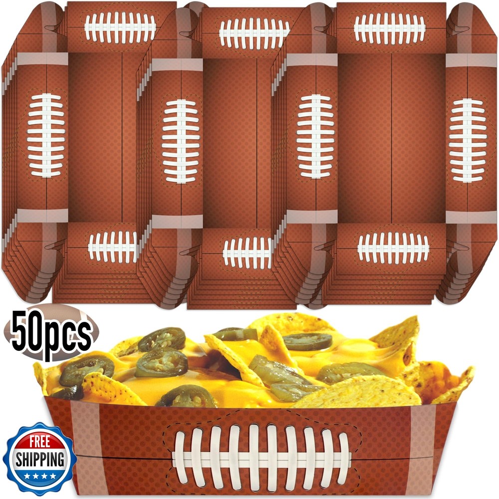 Football Disposable Paper Trays| (50 pcs) Fair Food Boats Concession Snacks| Carnival Nachos, Chips Serving Basket| Football Theme Paper Food Tray| Big Game Snack Tray| Football Party Baskets|BASHOUT Features 50 Pack – Football Theme design. Perfect for Football Parties celebrations Superbowl Parties and any Sports Theme Celebrations. 3.5” x 1.6” x 5.5” Great size to fit snacks and tasty treats. Quality Paper: Our Football Theme food boats are a great alternative to plastic or foam takeout food containers. Made of premium paperboard, our Football design food trays are leak resistant - perfect for indoor & outdoor events. Space Saver: Our paper trays are stackable, helping to save on countertop or cabinet space. When done, simply toss in the trash – our Football food boats are disposable & recyclable. Easy to assemble: Our trays are made to be assembled quickly and sturdy. No need of glue or tape to keep these trays together. Shipping Free & Fast Shipping: We offer free shipping to most of the USA with a normal delivery time of 3-7 days. However, due to the current situation, additional delivery time (up to 3 weeks) may be required for some items. Alternative Carriers: We may use alternative carriers (e.g., USPS, FedEx, UPS) to ensure your package arrives safely and on time. Due to the use of multiple carriers, we are unable to provide a tracking number automatically. Handling Time: Orders are processed and shipped within 1-2 business days of receiving cleared payment. Shipping Restrictions: Shipping to Alaska, Hawaii, Puerto Rico, Guam, and other US territories may incur shipping charges or delivery restrictions. Please contact us before ordering, or your order can be refunded/cancelled. State Restrictions: Certain items may not be shipped to California due to state regulations. Contact for Tracking Updates: If you require tracking updates or have any concerns about the delivery of your order, please feel free to contact us, and we will be happy to assist you. Return Policy 30-Day Hassle-Free Returns: If you are not completely satisfied with your purchase, you can return the item for free within 30 days of receiving it for a full refund or exchange. Easy Return Process: Contact us, and we will provide you with a prepaid return shipping label and detailed instructions. No Restocking Fee: There are no restocking fees for returns. However, the buyer is responsible for return shipping costs if the return is not due to a seller"s error. Refund Processing: Refunds will be processed within 1 business day of receiving the returned item in its original condition. Feedback Your feedback is extremely important to us. We strive to provide the best products and customer service possible. If you are satisfied with your purchase, please take a moment to leave us a positive review. If you have any concerns or issues with your order, please contact us before leaving negative feedback. We are committed to resolving any problems and ensuring your satisfaction. Contact Us If you have any questions or concerns, please feel free to reach out to our customer support team. You can contact us through the eBay messaging system. We are available Monday to Friday, 9:00 am to 5:00 pm EST, and we will do our best to respond to your inquiry within 24 hours. Thank you for supporting our small family business!
