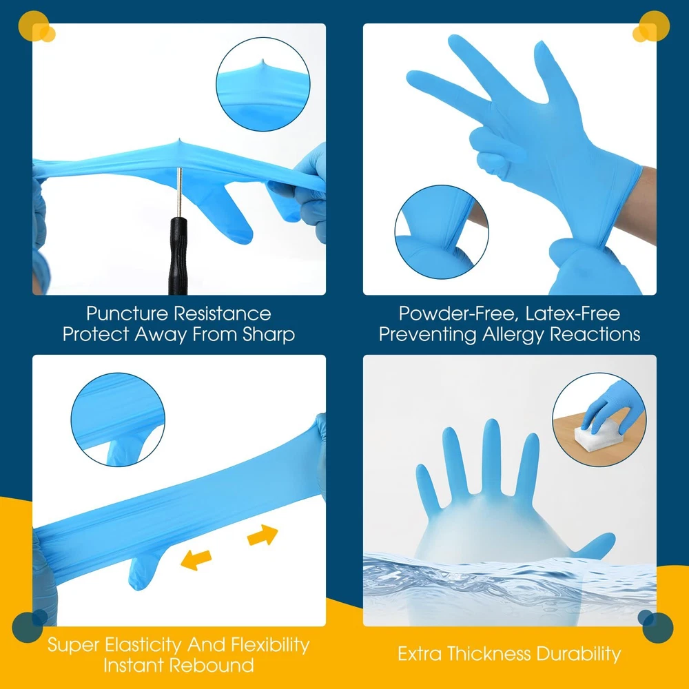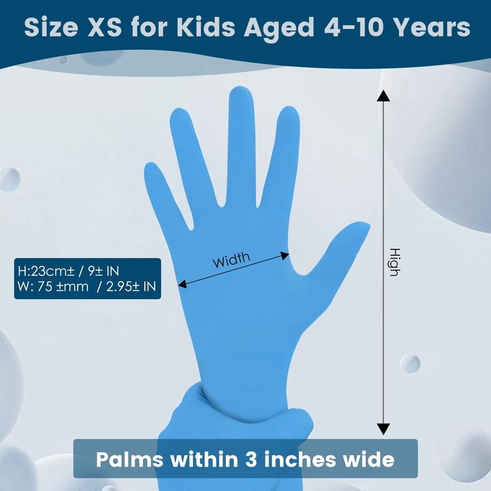 Disposable Nitrile Gloves, Kids Gloves Disposable for 4-10 Years, Powder-Free, Latex-Free, for Crafting, Painting, Gardening MORE PROTECTION: The kids nitrile glove have no latex ingredients, to avoid skin itching or discomfort reactions caused by the material, good elasticity, flexible operation; For single use only. WATERPROOF & TEAR RESISTANT: Not only are these nitrile gloves 100% waterproof, but they are also resistant to punctures, rips & tears. Whether painting or planting, it keep hand clean and safe. SUITABLE FOR KIDS: Specially designed and manufactured for children ages 4-10, the actual fit may vary, but these kids cleaning gloves are designed based on the average hand size of students in grades 1-6; Enhances grip without compromising dexterity and feel, so kids can comfortably complete the task at hand, protect their hands and save them time cleaning up. SUFFICIENT TO USE: You will get a box of kids nitrile gloves, and each box has 100 pieces ( 50 pairs) , suitable for usages of any indoor and outdoor activities, they are compact and easy to store in the box, easy to fetch, fast, safe and easy to clean. MORE MULTIPURPOSE: Great for Arts & Crafts, painting, tie dye, science project, lab experiments, gardening, cooking, playing, party, cleaning, pet care etc.