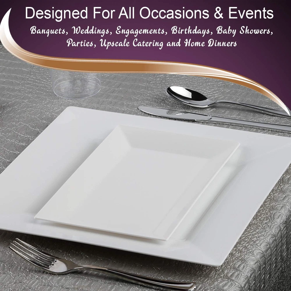 FANCY AND ELEGANT DESIGN – These rectangle white plastic dessert plates add sophistication to weddings, birthdays, and all events. Perfect for serving salads, appetizers, or cakes with style. SERVES 120 GUESTS – This set includes 120 plastic plates, perfect for large gatherings. These party plates make hosting easy with enough dessert plates for every guest. DURABLE AND HEAVY-DUTY – Crafted from premium materials, these plates are disposable yet sturdy enough to handle heavy portions. Say goodbye to flimsy, low-quality plastic plates! CONVENIENT AND DISPOSABLE – Save time and effort with these disposable plates. Enjoy your party without worrying about dishwashing – just toss them after use! PERFECT FOR ALL OCCASIONS – Ideal for weddings, birthdays, and parties, these plastic plates for party settings bring elegance and convenience to your table.