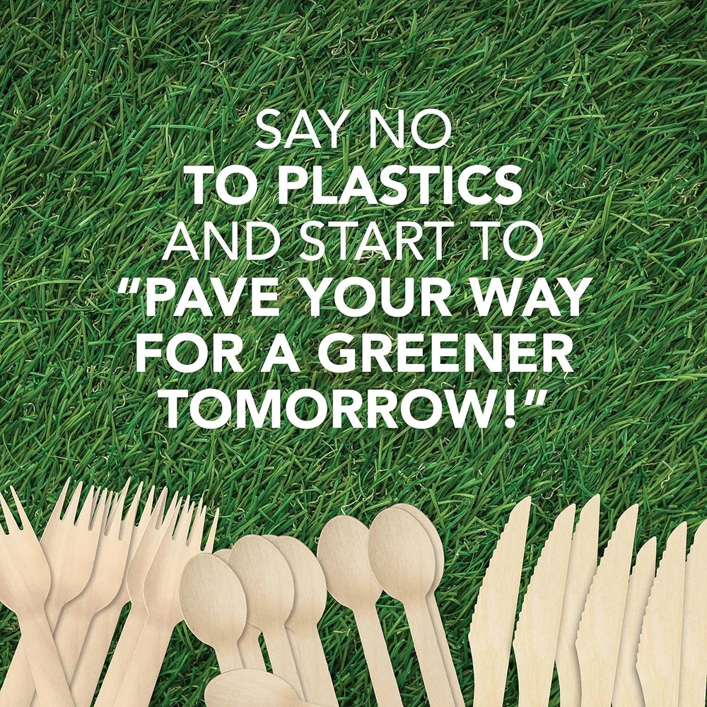 RECYCLABLE FLATWARE When it comes to setting your table, you should never have to settle for anything less than the best. And the best is exactly what you’ll get when you choose our wooden utensils set. SOPHISTICATED CUTLERY The chic and modern design of our disposable cutlery compostable set allows them to match all party decor and tableware sets. They’re ergonomic to fit comfortably in everyone’s hands and are perfect for use during a family picnic in the park! Display our disposable utensils set individually wrapped as an affordable finishing touch for a rustic farmhouse wedding reception, bridal shower, or birthday party. QUALITY MATERIALS We made sure that our compostable cutlery disposable is a great alternative to professional cutlery. Made from 100% natural birch wood, our disposable knife and fork and spoon are heavy duty. The eco friendly forks feature an improved tine design to effectively hold your next bite and the knives are expertly sharpened to easily slice through most foods. Furthermore, our recyclable spoons can be used in a hot soup unlike plastic alternatives ECO FRIENDLY PURPOSE We understand the need for preserving nature is at an all-time high and we want to do our part. Our eco friendly disposable utensils sets are single-use but they’re also completely recyclable, compostable, and biodegradable so you can use them and toss them without worrying about how long they’ll sit in a landfill. And for every set made. ASSORTED CUTLERY With every set containing 200 eco disposable forks, 200 disposable wooden spoons, 200 Disposable Knives and 200 disposable Napkins , you’re fully prepared to host your next big event! Our 600 piece assorted cutlery sets come conveniently packaged and ready to use right out of the box or wrap them together and have individual wrapped utensils that would impress everyone Sustainable Alternative: Made from 100% natural wood, our biodegradable utensils is an Eco-friendly alternative to plastic cutlery that is both durable and stylish. Biodegradable and Compostable cutlery : Our wooden silverware is fully compostable and biodegradable, making it a guilt-free choice for any eco-conscious consumer. Sustainable Alternative: Made from 100% natural wood, our biodegradable utensils is an Eco-friendly alternative to plastic cutlery that is both durable and stylish. MAKING CONSCIOUS DECISIONS TO BUY BULK & CHEAP SHOULDN’T HURT YOUR WALLET: The price we have to pay for sustainable options is an unwelcome predicament; With our 800-piece set, you can enjoy up to 4 picnics with 50 persons.