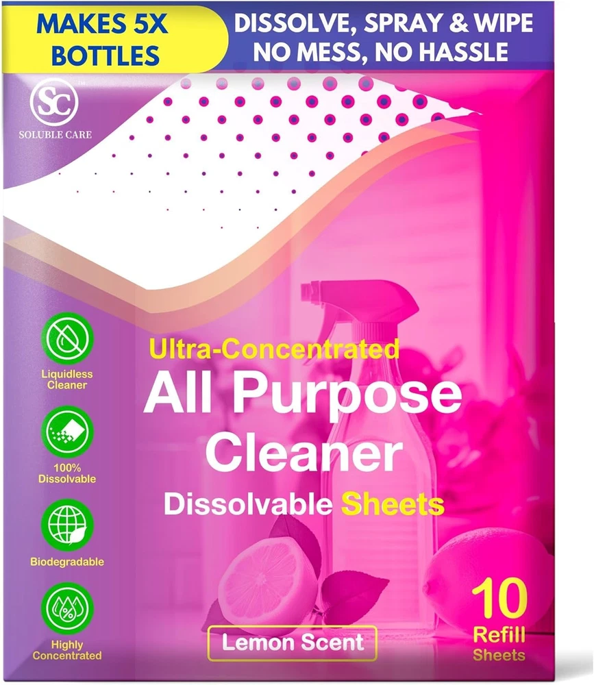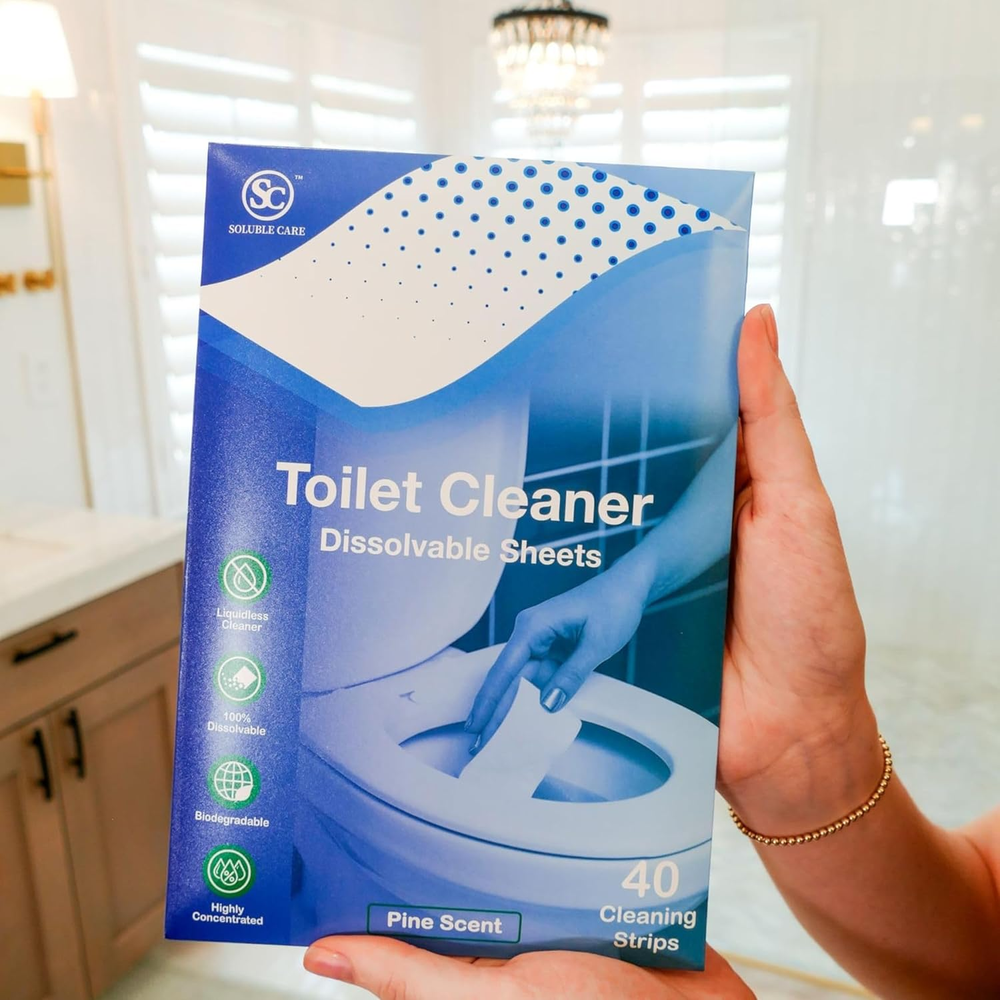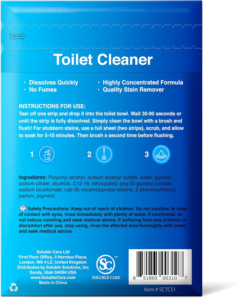 CLEAN HOME, HAPPY PLANET: Simply drop our dissolvable toilet cleaner sheets into the bowl to say goodbye to toilet rings. These fast-acting sheets target stubborn stains, mineral deposits, and odors, leaving your toilet sparkling clean and smelling fresh while protecting the environment. REDUCE CLUTTER: Save space, eliminate plastic waste, and simplify your life.Our soluble sheets' compact design minimizes packaging waste. Perfect for use at home, in the garage, at the office, or on the go. HIGHLY CONCENTRATED: Our cleaning sheets are designed with a powerful, highly concentrated formula, ensuring maximum cleaning efficiency with every use. Each sheet packs a punch, requiring only a small amount to tackle even the toughest stains and messes, making them both effective and economical. FRESH CLEAN SCENTS: Our sheets feature mild, refreshing scents that provide a clean atmosphere, unlike other cleaning products that leave behind strong, harsh chemical odors. NO RESIDUE & EASY TO USE: We understand the frustration with toilet cleaners that leave residue behind. That's why we've used water-soluble fibers that are safe for drains. You can trust that our cleaner sheets won't leave any residue in your toilet or cause potential clogs, ensuring a clean and hassle-free experience. Simply drop the sheets into the toilet bowl and wait about 30-90 seconds for them to fully dissolve. If needed, let them soak for 5-10 minutes. Then, scrub the toilet with a brush and rinse with water for a spotless finish. Product Description
