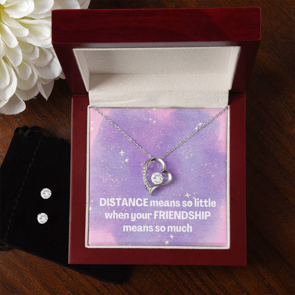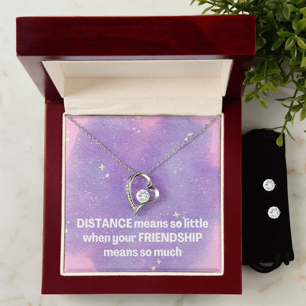 Give your loved one a gift that will make their heart swell! The Forever Love Necklace and Cubic Zirconia Earring Set is sure to do the trick. This necklace and earring pairing provides dazzling sparkle when worn together or separately, and is perfect for any occasion! Do not miss out on this special offering! Necklace Specifications 14k white gold finish 6.5mm round cut cubic zirconia crystal 0.8" (2.2cm) / 0.7" (1.8cm) Adjustable cable chain: 16" - 22" Lobster clasp attachment Earring Specifications 14k white gold finish 6mm round cut cubic zirconia crystals Post style backing Your piece is lovingly packaged in a complimentary soft touch box for easy gifting. Elevate your presentation by upgrading to the mahogany style luxury box, which features a brilliant LED spotlight.