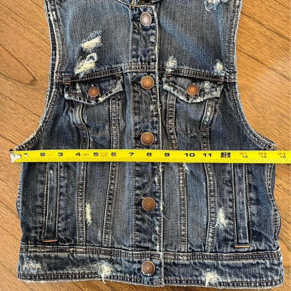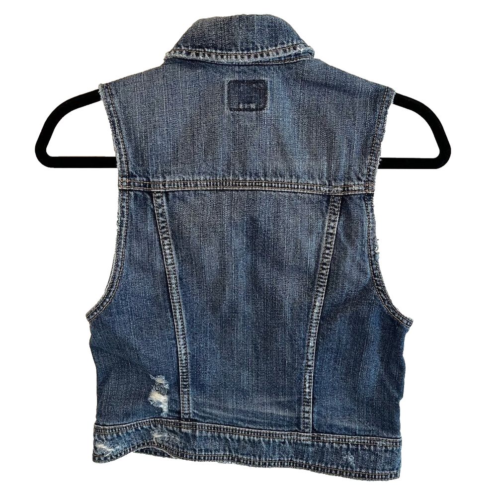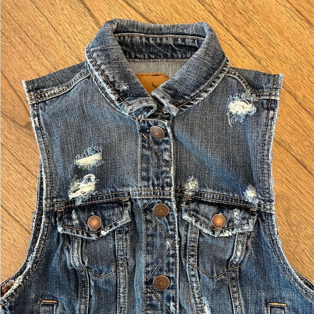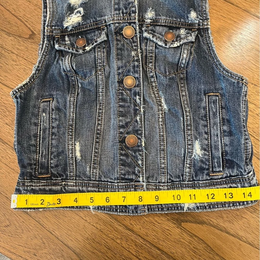 American Eagle distressed denim vest with button closure. A closet staple you can wear alone or layered. Features a classic medium blue wash. Pre-loved but in very good condition. See pictures for measurements.
