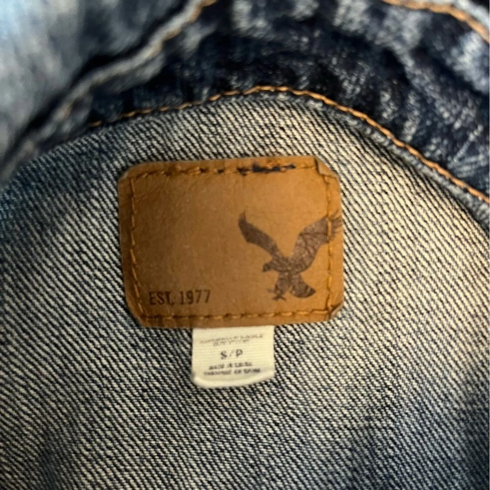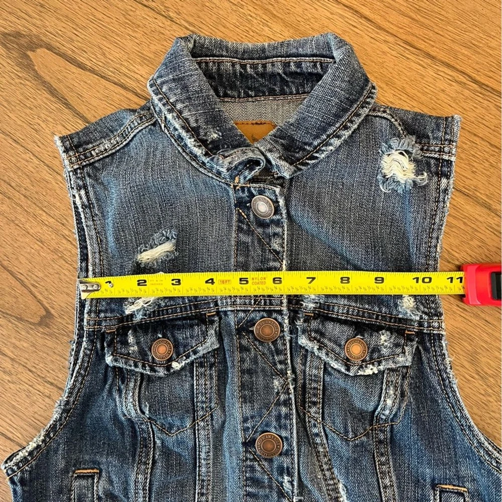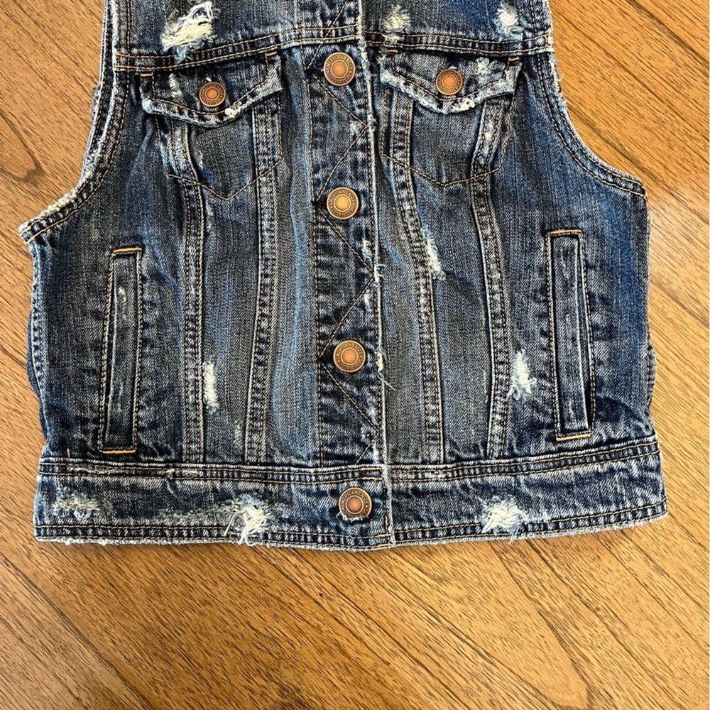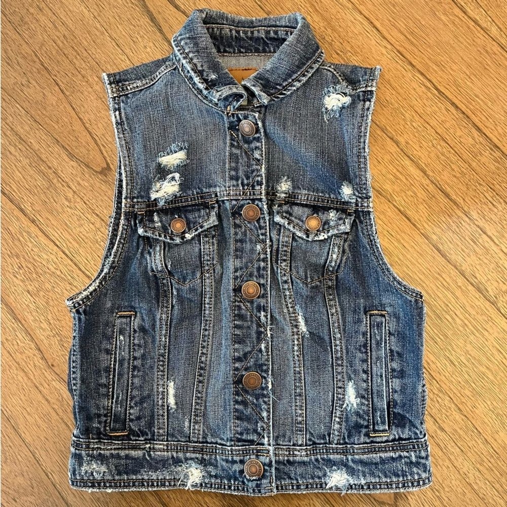 American Eagle distressed denim vest with button closure. A closet staple you can wear alone or layered. Features a classic medium blue wash. Pre-loved but in very good condition. See pictures for measurements.