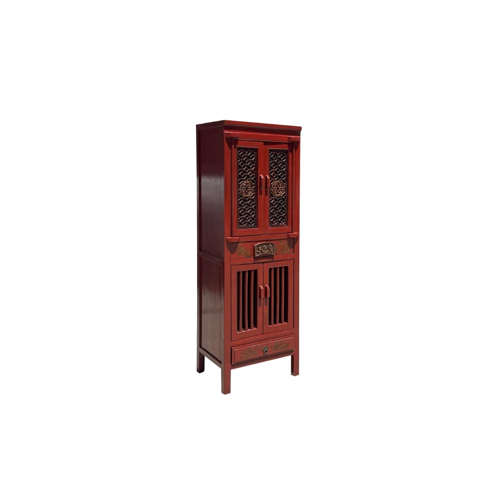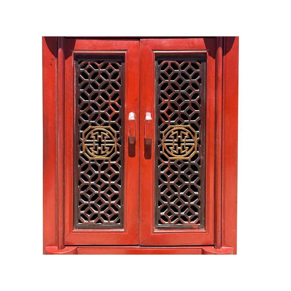 Handle Material: Wood Features: Carvings MPN: Does Not Apply Finish: Distressed Item Height: 63 Number of Shelves: 1 Color: Red UPC: Does not apply Item Width: 20.25 Number of Drawers: 1 Country/Region of Manufacture: China gtin13: Does not apply Number of Doors: 4 Style: Asian Assembly Required: No Brand: Handmade Room: Bedroom, Home Office/Study, Living Room, family room, foyer Material: Wood Item Length: 15 Pattern: Floral Type: Storage Cabinet