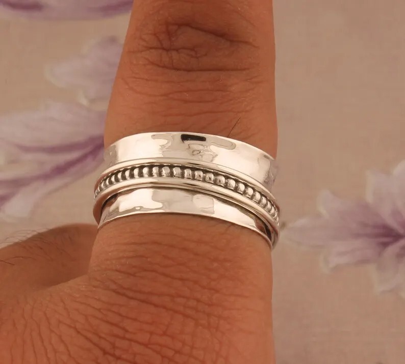 Solid 925 Sterling Silver Handcrafted Distressed Scratches Design Spinner Ring This Handmade Sterling Silver Spinner Ring is a perfect blend of artistry and functionality. Crafted by skilled artisans, each ring features a stunning textured band with unique, distressed scratches that give it a rustic, one-of-a-kind appearance. The spinner mechanism allows the outer band to rotate freely, making this ring a great choice for those seeking a soothing, tactile experience—whether you're wearing it as a worry ring , fidget ring, or simply for its bold, modern aesthetic . Features: Handcrafted with Love : Made from high-quality, solid sterling silver for a durable and timeless piece that will last. Unique Design : The outer band features distressed textures and scratches , giving each ring a distinct, organic feel. No two rings are alike! Spinner Mechanism : The inner band moves smoothly around the outer band, perfect for those who enjoy a calming, tactile sensation. Customizable Fit : Available in a range of sizes to ensure the perfect fit. The ring is made to comfortably slide over your finger, and the spinning feature adds extra fun and function. Versatile Wear : Ideal for daily wear, this ring is a great addition to any jewelry collection. It also makes a thoughtful gift for anyone who enjoys handmade jewelry , unique designs , or needs a soothing, tactile distraction. Perfect For: Those who love artisan-made jewelry with personality A personalized gift for birthdays, anniversaries, or special occasions Fidget or worry rings to help reduce stress and anxiety Anyone seeking a stylish and functional ring with a bit of movement Sizing: Please refer to the size chart to choose your perfect fit. If you're unsure, we recommend ordering half a size larger, as spinner rings tend to fit more snugly than standard bands. Custom sizing requests can be accommodated—please message us with your specific requirements. Care Instructions: To keep your sterling silver ring looking its best: Clean gently with a silver polishing cloth to remove tarnish. Avoid exposure to harsh chemicals or excessive moisture. Store in a jewelry box or pouch to prevent scratches. Shipping & Returns: Free shipping within the U.S. and international shipping available. Fast processing time—your order will be shipped within 1-2 business days. 30-day returns for a full refund or exchange, no questions asked. Note: Due to the handmade nature of this ring, slight variations in texture and appearance may occur, making each piece completely unique. This adds to the charm and individuality of your jewelry!