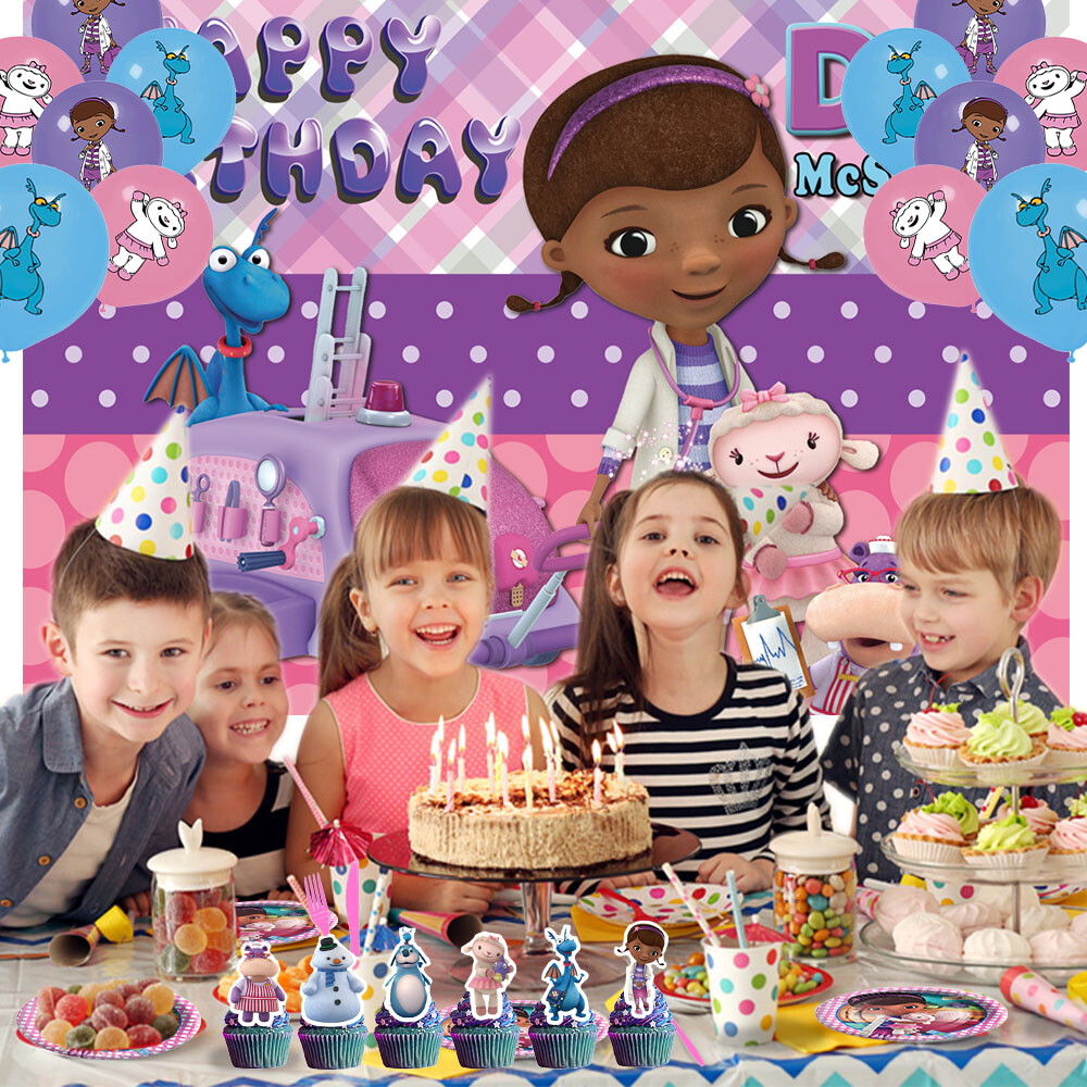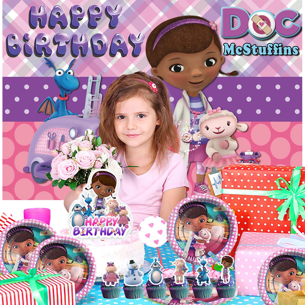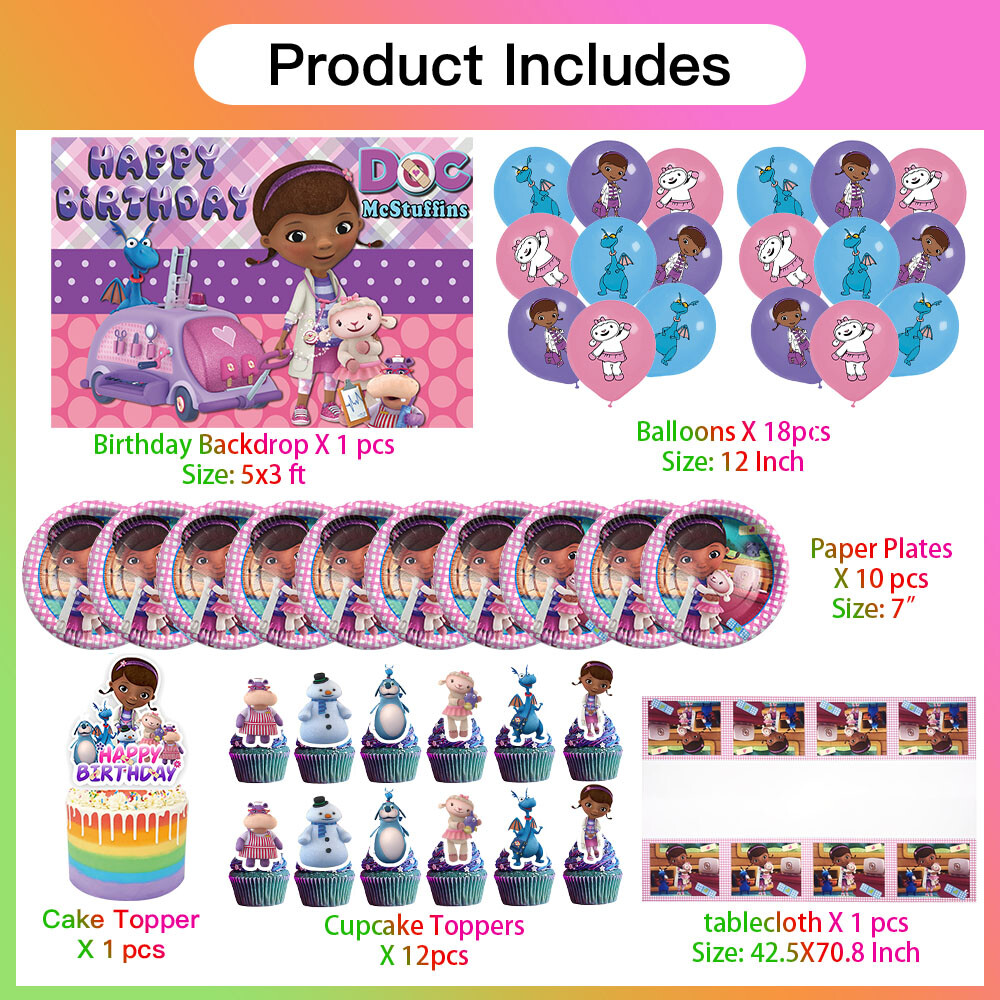 Doc McStuffins Party Supplies Birthday Decor Plates Balloons Toppers Cloth Banner About this item 【Themed Sets of Matching Units】: ☰ Take this good favor for themed party to impress your kids and their friends. ☰ Enrich your kids’childhood dream well,giving them a fantastic surprise. 【Party Decor Is So Easy】: ☰ It contains all of your Doc McStuffins theme birthday party tableware needs and is completely disposable. ☰ You can save more time to enjoy this party with your guests. 【Real Savings For You】 ☰ The shiny large backdrop decor will attract you eyes and make everyone laugh.The banner cloth is printed in high definition, making it the perfect party background wall. It is made of thick cloth, not paper. ☰ You will save over 70% compared to buying all 2 Doc McStuffins party supplies separately. 【Super Value Doc McStuffins Package】: ✪ 1PCS X Large Happy Birthday Banner 5x 3ft(150x100cm) ✪ 10PCS X 7 Inch Thick Paper Plates. ✪ 18PCS Balloons. ✪ 1PCS X Cake Topper. ✪ 12PCS X Cupcake Toppers. ✪ 1PCS X Tablecloth . 【After Sale Service】: ☰ We try our best to bring the best use experience to our customers. ☰ If you are not satisfied with the purchase of this set or have any questions about the product,please contact us at any time.We will definitely solve the problem for you in the first time. ☰ We can also custom backdrop other size or pictures you want. Any questions please contact us. On Jun 23, 2025 at 03:24:39 PDT, seller added the following information:
