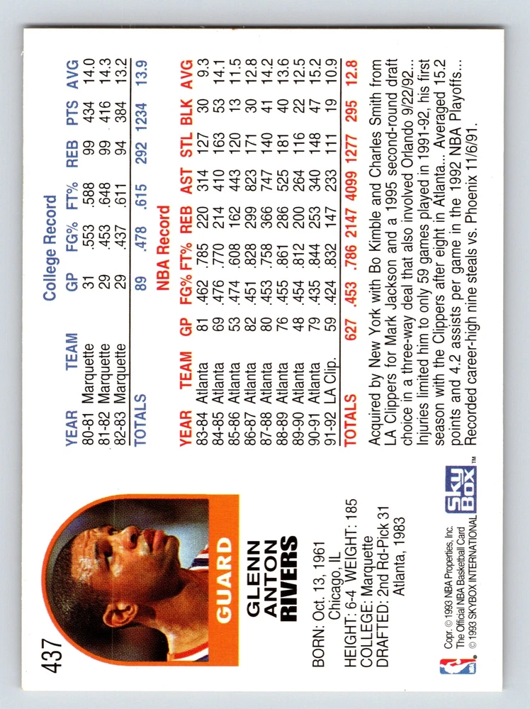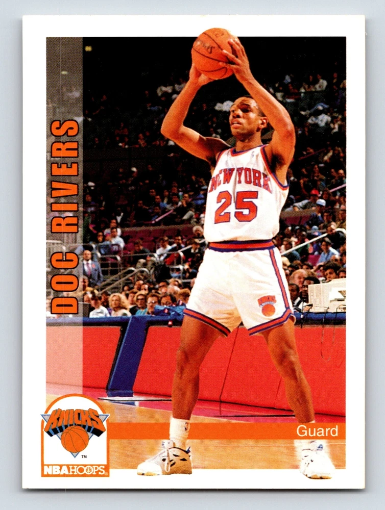 Item Description Title: Doc Rivers New York Knicks Guard NBA Hoops 1990 Card 437 Legendary Memorabilia Description: This sports trading card highlights Doc Rivers, an accomplished guard known for his strategic play and leadership on the court. Featured as part of the 1990 NBA Hoops series, this card captures Rivers during his tenure with the New York Knicks, showcasing his dynamic presence as he prepares for a play. The card not only displays Doc Rivers in his Knicks uniform but also provides an overview of his impressive statistics and career highlights from both college and professional basketball. Rivers, born on October 13, 1961, in Chicago, IL, is celebrated for his defensive skills and ability to orchestrate plays, making him an integral part of any team he played for. His contributions to basketball, both on and off the court, add significant value and appeal to this collectible item, making it a must-have for fans and collectors alike. MRSP: $14.99 Sport: Basketball Player/Athlete: Doc Rivers Season: 1990 Manufacturer: NBA Hoops Parallel/Variety: Unknown Set: NBA Hoops 1990 Team: New York Knicks League: National Basketball Association (NBA) Card Number: 437 Counter: 226 Folder: BASKETBALL1224002