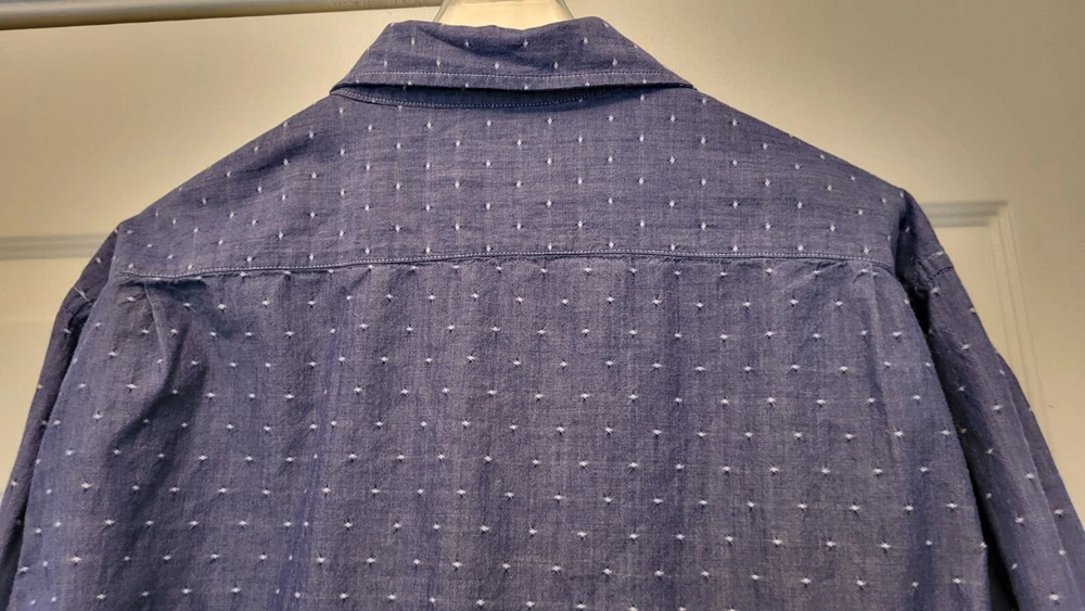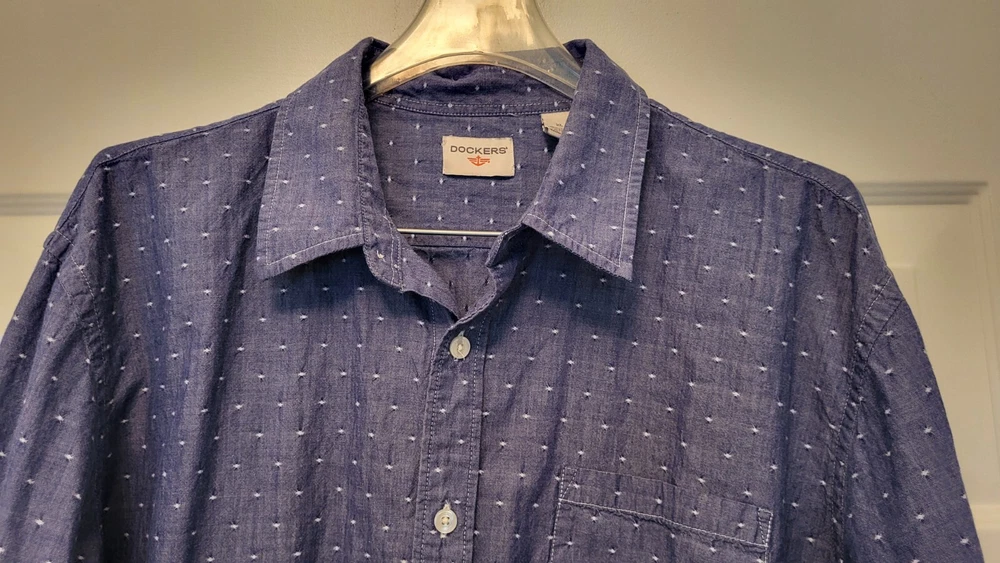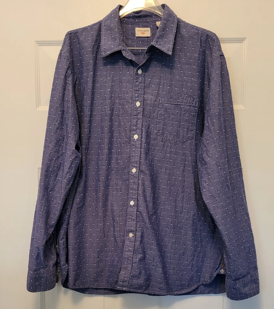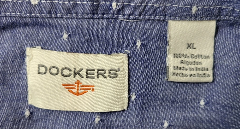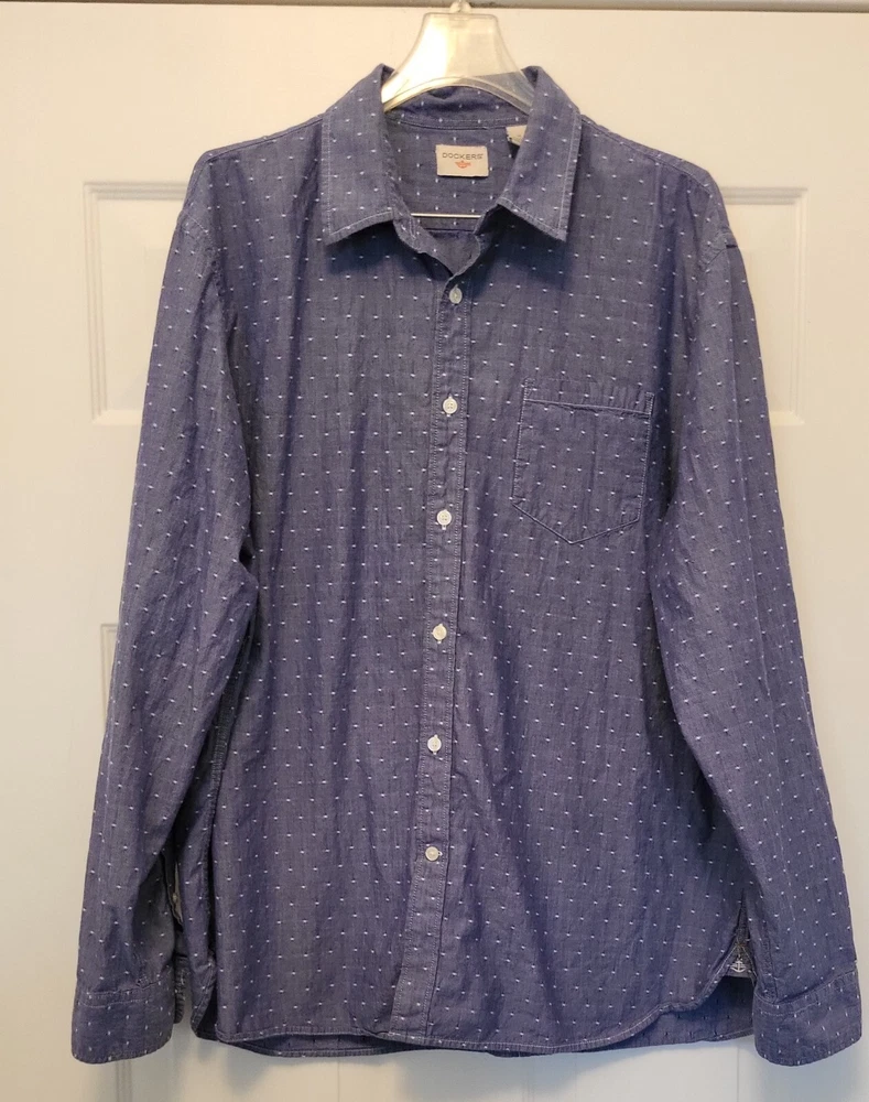 Elevate your wardrobe with the timeless elegance of the Dockers Men's Blue and White Button-Up Dress Shirt. Designed for the modern man, this regular fit XL shirt features a classic collared neckline with a sharp point collar style and long sleeves finished with barrel cuffs. The striking blue hue is complemented by the subtle spotted pattern, adding a touch of sophistication to your ensemble. Crafted from 100% cotton, this woven dress shirt ensures all-day comfort for any occasion, from business meetings to weddings. It's machine washable for easy care and boasts features like easy-care fabric and a handy pocket for functionality. Whether paired with slacks for work or denim for a casual outing, this shirt is versatile for both formal and casual settings throughout all seasons. Pit to pit measures 25 in Shoulder to hem measures 31 in Good pre-owned condition shirt! Add it to your wardrobe today!