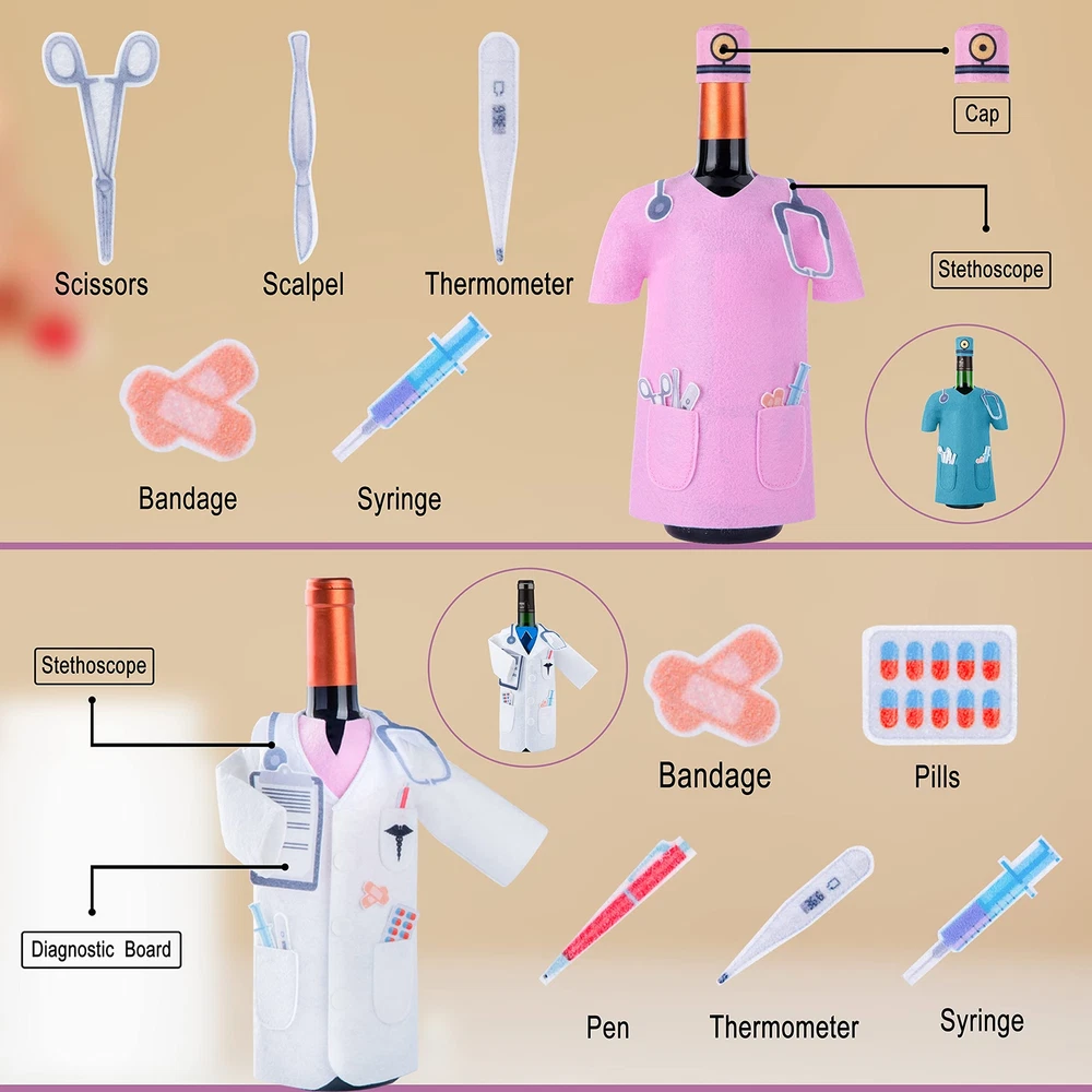Package of Doctors Gifts included: 1 x Doctor White Bottle Wine Coat Cover for Men 1 x Doctor White Bottle Wine Coat Cover for Women 1 x Pink Scrub Wine Bottle Coat Cover for Doctor and Nurse 1 x Green Scrub Wine Bottle Coat Cover for Doctor and Nurse Doctor White Wine Bottle Cover also contains the following adorable Doctor Accessories: 1 x Pen 1 x Stethoscope 1 x 1 x 1 x Thermometer 1 x Bandage 1 x Clipboard Scrub Wine Bottle Coat Cover also contains the following adorable Doctor or Nurse Accessories: 1 x Cap 1 x Stethoscope 1 x Scissor 1 x 1 x Thermometer 1 x Bandage 1 x Surgical Scapel Doctor Gifts for Women: Our Doctors Nurses Gifts set includes White Doctor Bottle Wine Coats and Scrub Wine Bottles Cover. This is a perfect Doctors Day Gifts Ideas for Doctors and Nurses. The best Doctors Day Gifts, Birthday Gift for Doctor, Retirement Gifts for Doctors, Funny Gifts for Nurse and Doctor, Thank You Gifts for Doctor or Appreciation Gifts for Doctor Gifts for Doctors Male: This Doctors Gifts set included White Wine Coat Covers is the best Doctor Presents for a Great Doctor, especially for Doctor Graduation Gift, Thank You Gift for Doctor, Gifts for Men Doctor or Retirement Gifts for Doctors.Also,Gifts for Nurses, Assistant Gifts, Pharmacist Gifts, Physician Assistant Gifts, Optometry Gifts Veterinarian Gifts, Physical Therapist Gifts for Women or Men, or gifts for any Practitioner. Nurse Gifts for Women: This Doctor Gifts set also included Scrub Bottle Wine Covers for Doctors and Nurses. An Appreciation Gift for doctor and Nurse, Doctor Day Gifts,Gifts for Students, Birthday Gifts for Doctors or Future Doctor Gifts Match Day Residency: The Doctor Gift Wine Bottle Covers are tailor-made designed alongs with cute Doctor Accessories such as Stethoscope, Bandage, , Pen, , Thermometer. Our Doctor Bottle Wine Coat Gift bag fits most size of wine bottle. Sure this Doctor Nurse Gifts is of the most Funny Gifts for Doctor Gifts for Nurses: If for any reason you are not satisfied with our Doctor Party Decorations Gifts, please us freely for a full no questions asked and hassle free