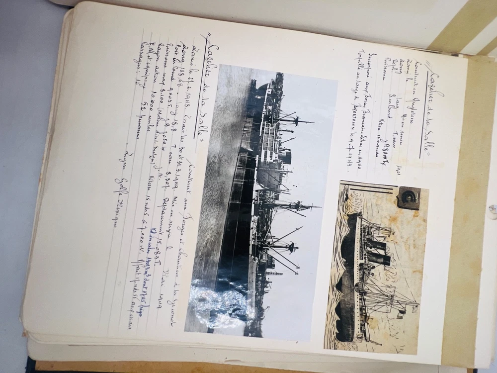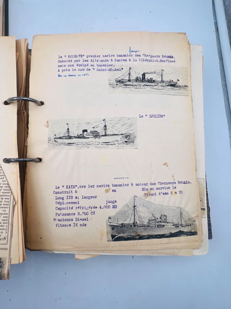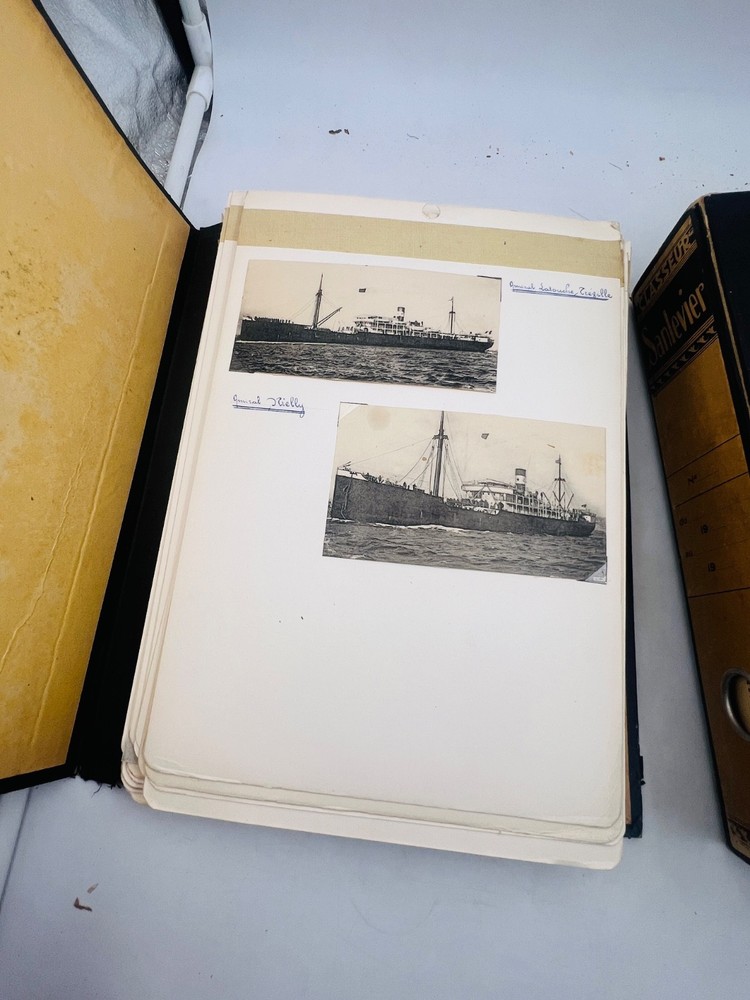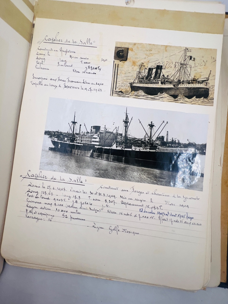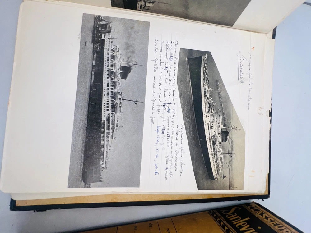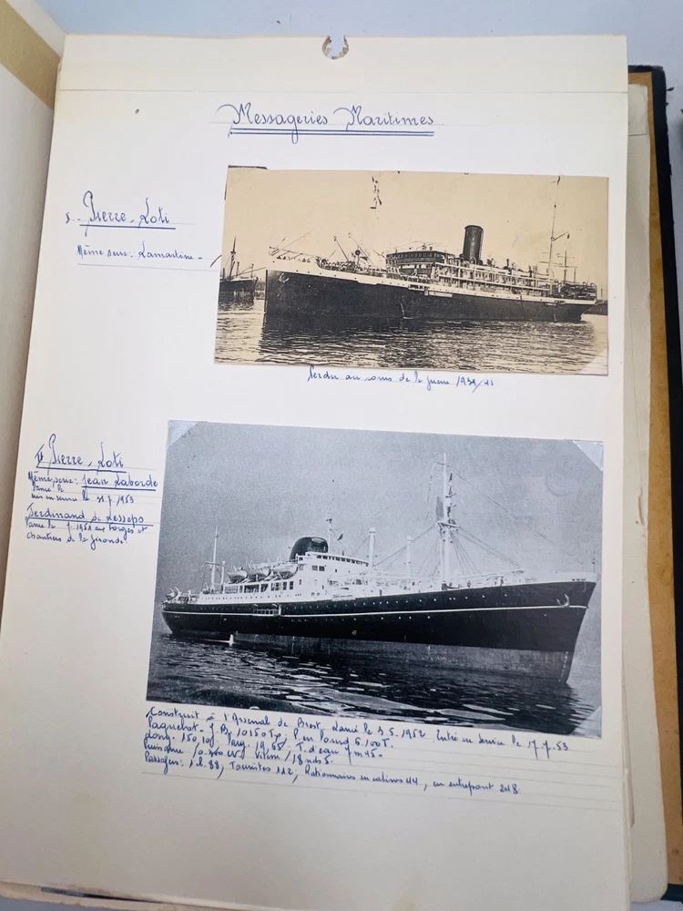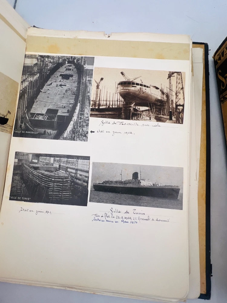 Deux grands albums manuscrits présentent une exceptionnelle documentation photographique et descriptive sur les navires français de la flotte marchande et militaire, principalement les paquebots des Messageries Maritimes et de la Compagnie Générale Transatlantique . Les pages, soigneusement rédigées à la main, comportent des photographies originales, cartes postales anciennes et notes techniques détaillées (tonnage, chantiers de construction, années de lancement et de naufrage). L’ensemble, conservé dans des reliures d’époque en cartonnage marbré , offre quelques usures d’usage , coins émoussés et feuillets parfois légèrement détachés, mais reste d’un intérêt documentaire remarquable . Véritable archive privée de passionné de marine , ces albums constituent une source iconographique et historique rare sur la navigation française de la première moitié du XXe siècle, couvrant notamment les années 1930 à 1960. Les clichés et notices évoquent les navires emblématiques : Commandant Quéré, Ville d’Alger, La Salle, Pierre Loti, Chili, Valparaiso , etc. Une pièce unique, témoignage minutieux d’un collectionneur érudit des grandes compagnies maritimes françaises. H13