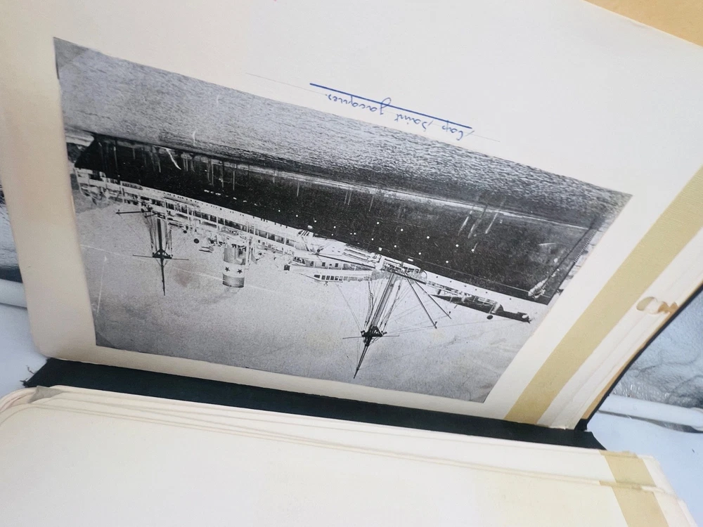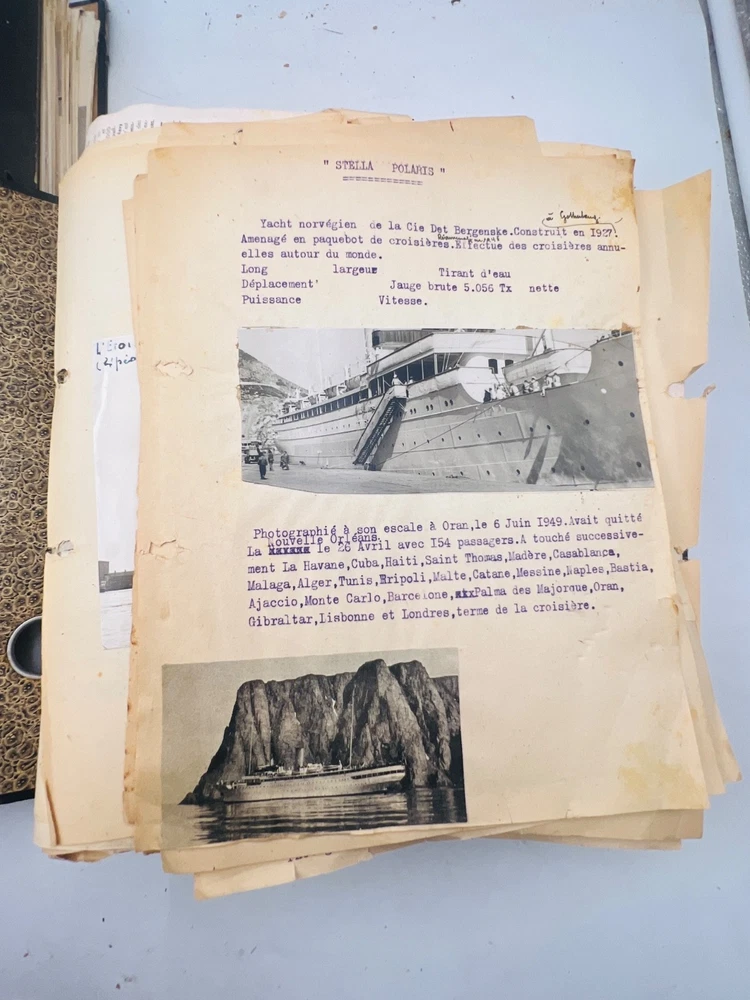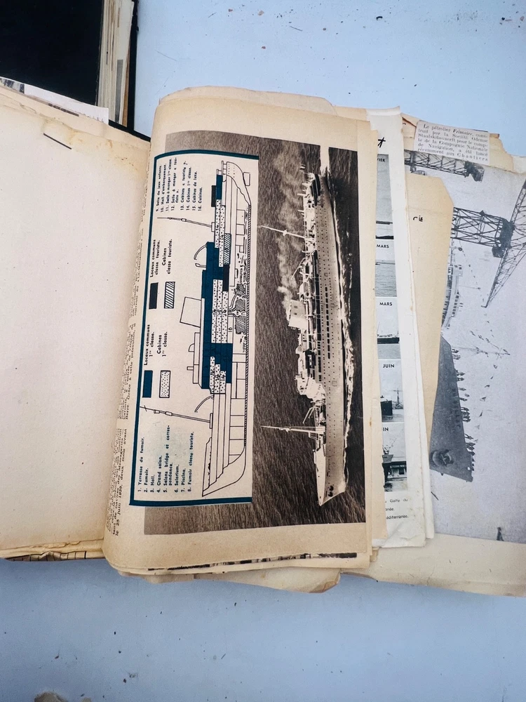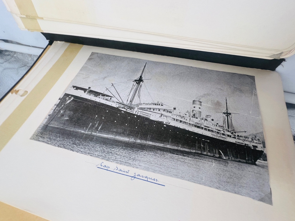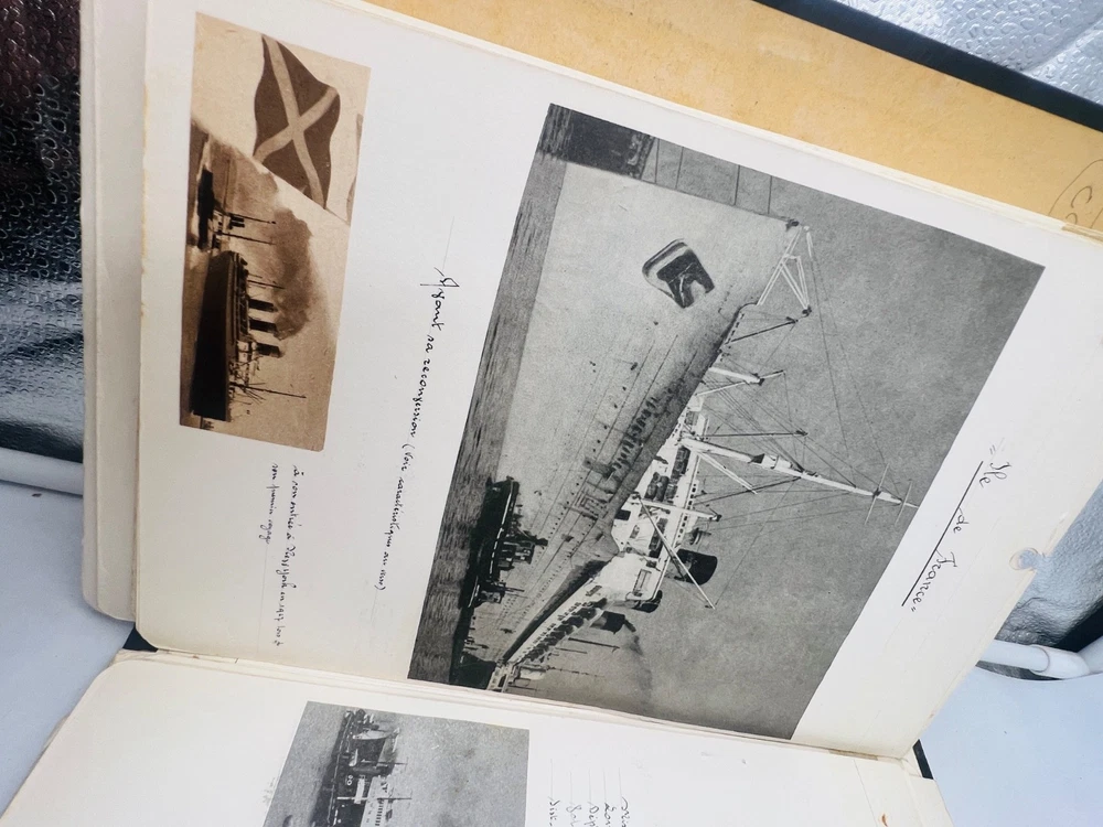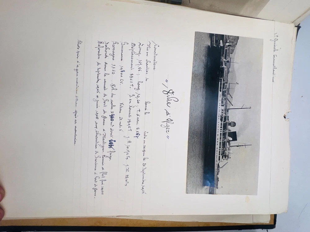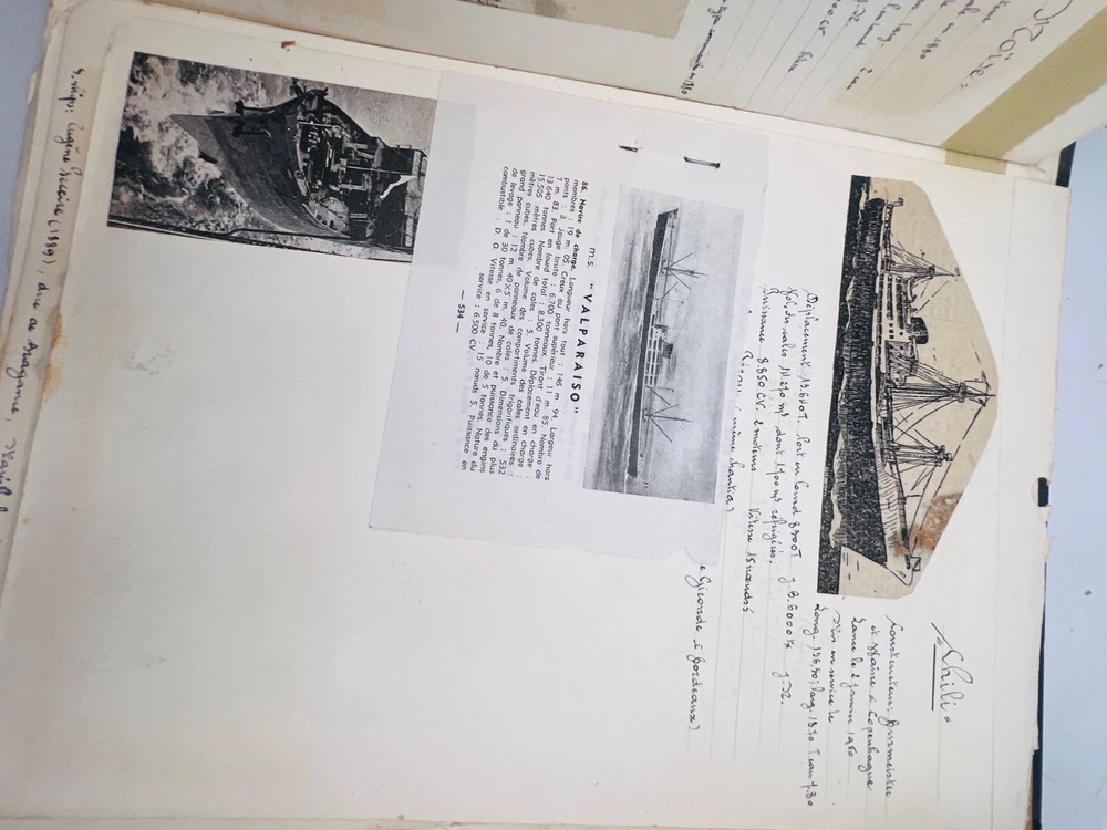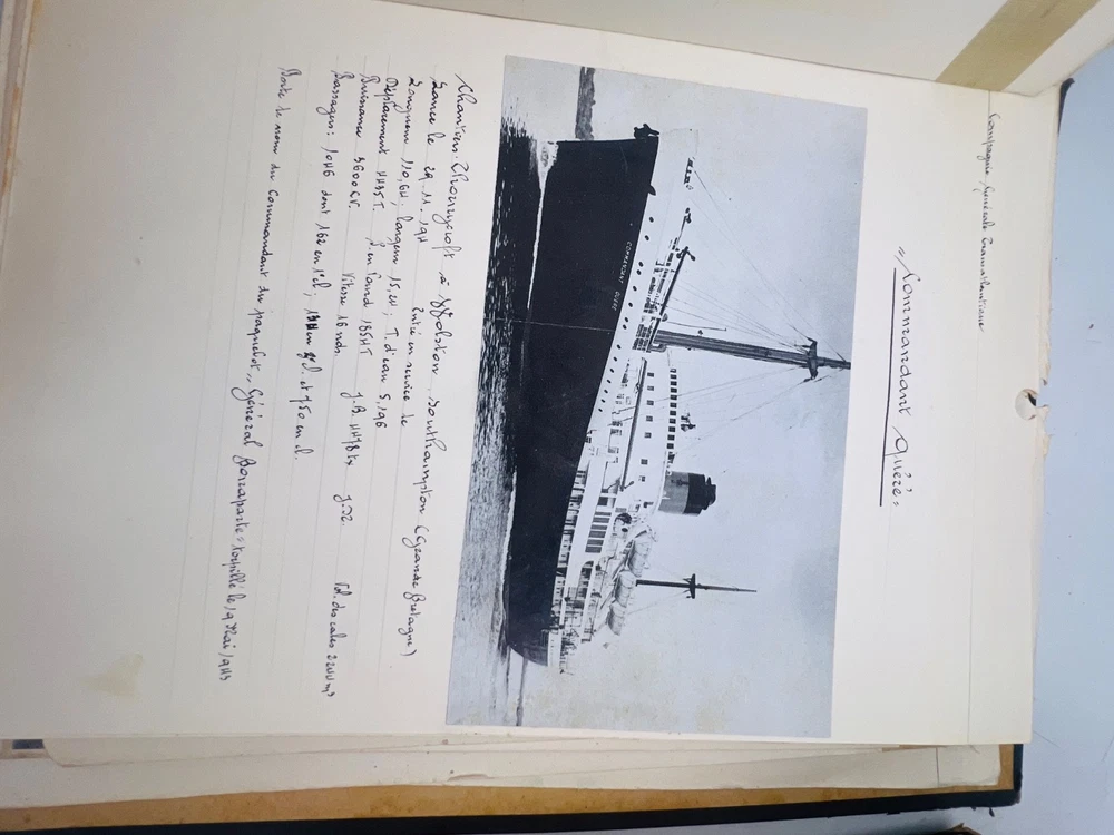 Deux grands albums manuscrits présentent une exceptionnelle documentation photographique et descriptive sur les navires français de la flotte marchande et militaire, principalement les paquebots des Messageries Maritimes et de la Compagnie Générale Transatlantique . Les pages, soigneusement rédigées à la main, comportent des photographies originales, cartes postales anciennes et notes techniques détaillées (tonnage, chantiers de construction, années de lancement et de naufrage). L’ensemble, conservé dans des reliures d’époque en cartonnage marbré , offre quelques usures d’usage , coins émoussés et feuillets parfois légèrement détachés, mais reste d’un intérêt documentaire remarquable . Véritable archive privée de passionné de marine , ces albums constituent une source iconographique et historique rare sur la navigation française de la première moitié du XXe siècle, couvrant notamment les années 1930 à 1960. Les clichés et notices évoquent les navires emblématiques : Commandant Quéré, Ville d’Alger, La Salle, Pierre Loti, Chili, Valparaiso , etc. Une pièce unique, témoignage minutieux d’un collectionneur érudit des grandes compagnies maritimes françaises. H13