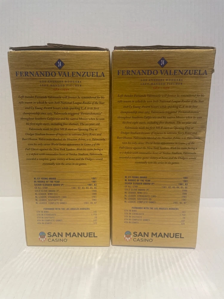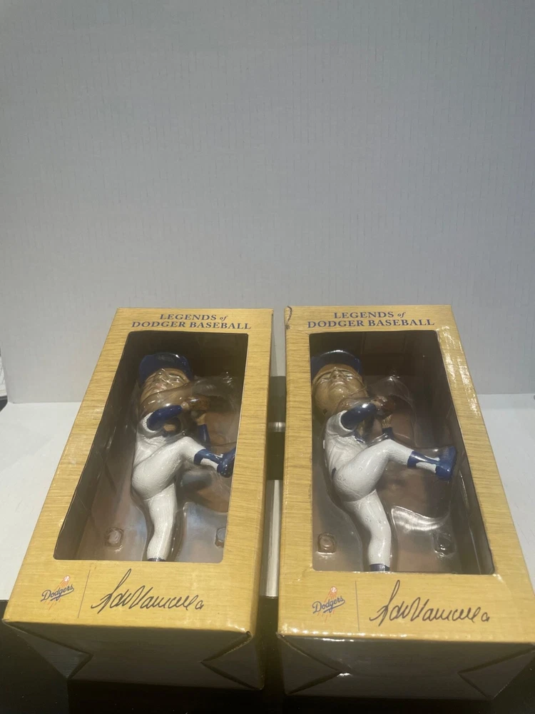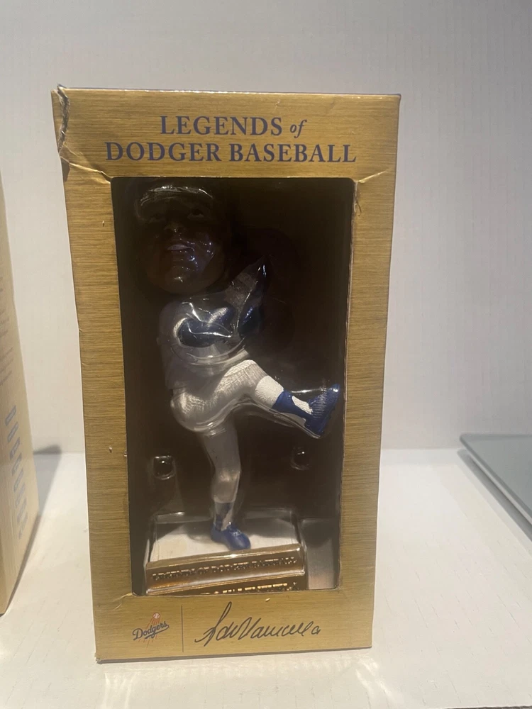This Dodgers Fernando Valenzuela Legends of Dodger Baseball Bobblehead 2019 is a must-have for any true baseball fan. The set of two bobbleheads features the legendary pitcher and his iconic number 59. This is a perfect addition to any collection, whether you're a die-hard Dodgers fan or just a lover of baseball history. The bobbleheads are made with high-quality materials and are designed to last for years to come. With this product, you'll be able to display your love for the Los Angeles Dodgers and their rich history. The bobbleheads are perfect for display in any office, home, or man cave. This is a great gift for any fan of Major League Baseball (MLB) and the sport of baseball. Add this unique piece to your collection today! NEW.