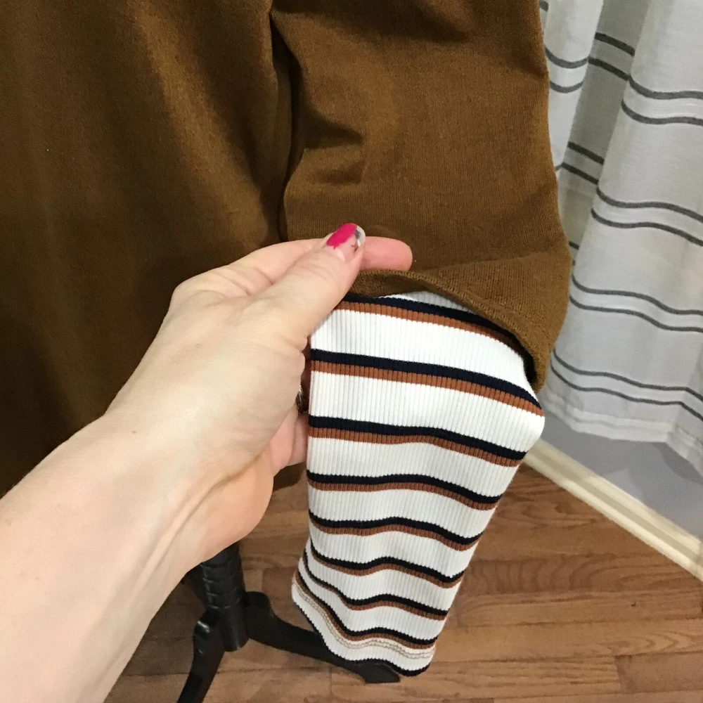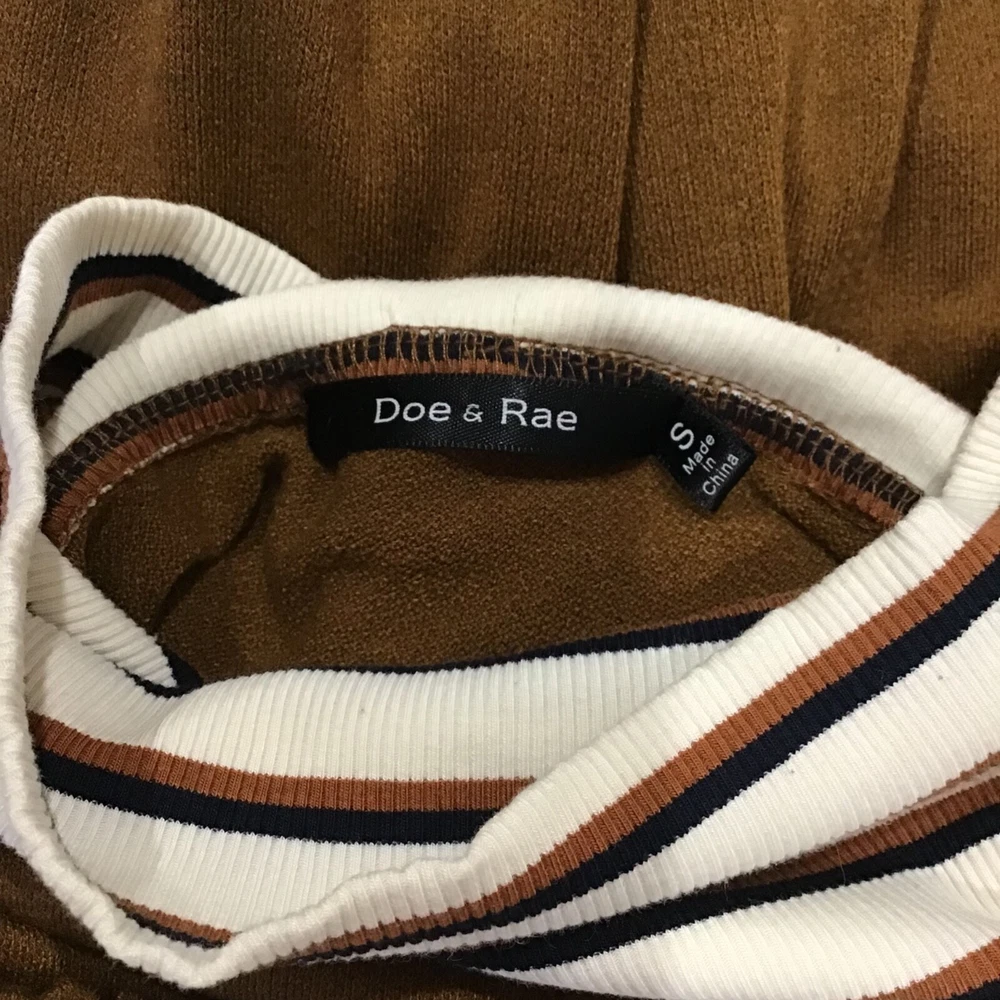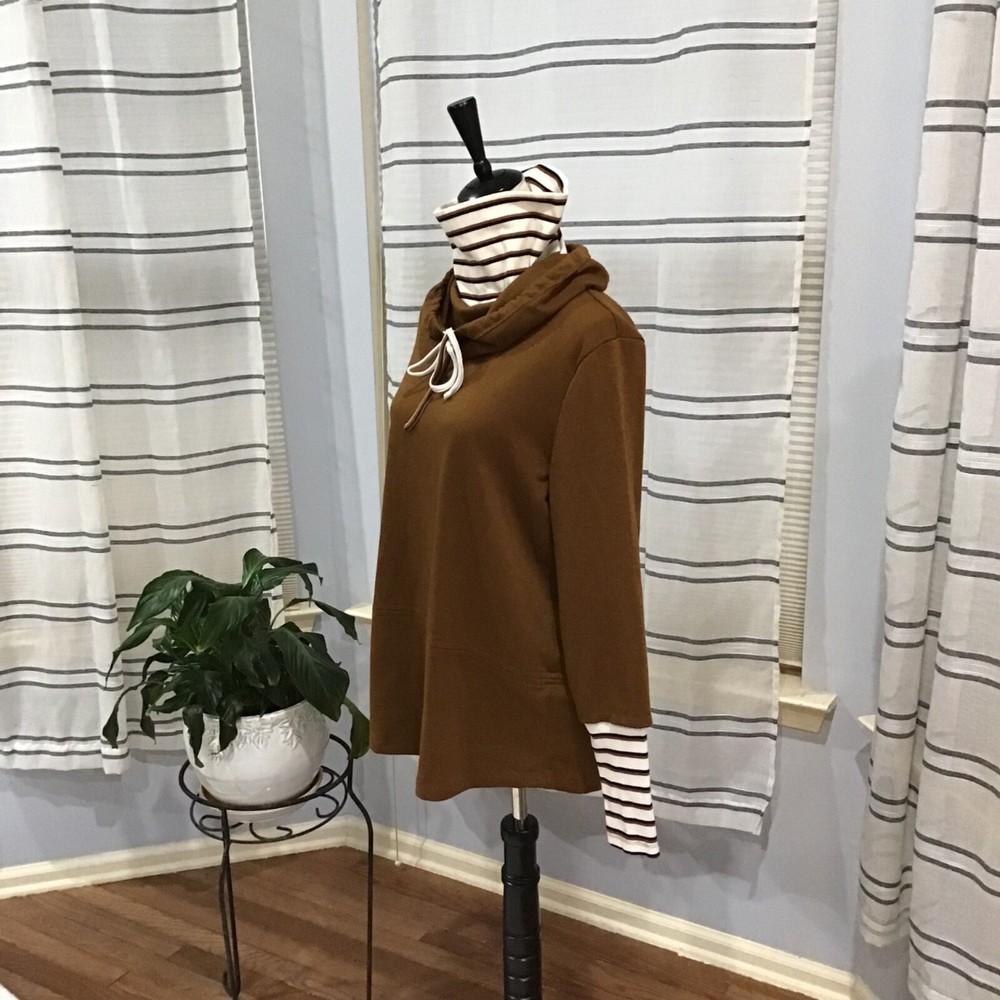 Doe & Rae Women Size SM Brown Rust Stripe Tunic Hoodie Sweatshirt Turtleneck *Ribbed*Layered*Attached Sleeves&Turtleneck*Fall Please review pictures for quality I ship same day via USPS Ground Advantage Thank you for your business!!