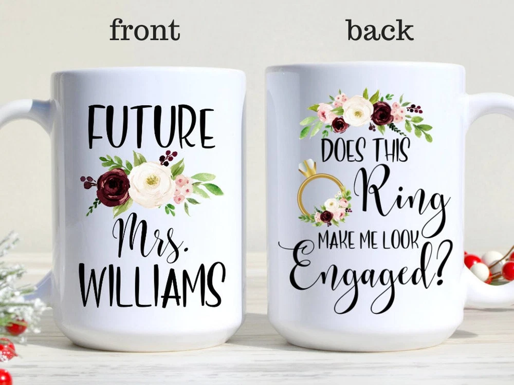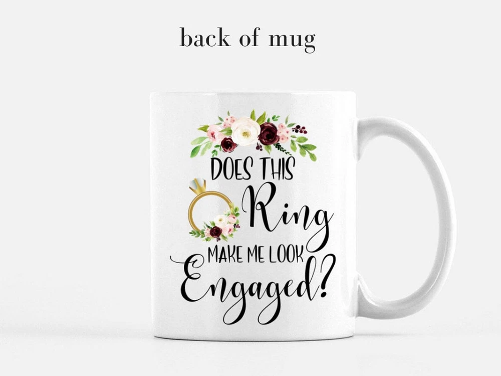 Does This Ring Make Me Look Engaged Mug Future Mrs Mug Bride To Be Mug Product Details.. This high quality 11oz. ceramic white mug has a premium hard coat that provides crisp and vibrant color reproduction sure to last for years. Perfect for all hot & cold beverages. The highest quality printing possible is used. It will never fade no matter how many times you wash it. Material: 100% Ceramic. Print both sides. Dishwasher and Microwave Safe. High Gloss + Premium White Finish. Printed in the U.S.A. Personalized & Custom. We support personalized and custom mug to add custom, when placing an order, you can add notes to the "order note" in shipping address section. Also you can contact us directly via message. Shipping Info. Ready to ship in 1 to 2 business days, All products are made-to-order and proudly printed in the United States. Shipped by USPS and DHL, You will receive your order in 5-7 days. Replace & Refund. All products are defective during shipping broken, chipped will be replaced free of charge. You are not satisfied with the product, we will refund 100% money to you. If any other issues arise, please do not hesitate to message, we would be more than happy to assist you.