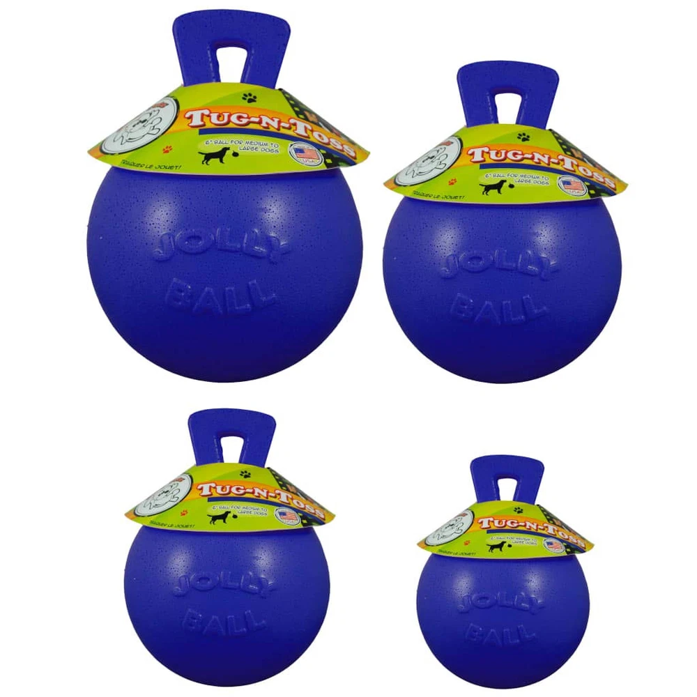 The clever design of ' Tug-N-Toss has made this dog toy wildly popular for years. The Tug-N-Toss Jolly Ball features an iconic, integrated handle that provides endless ways to carry, play, fetch and tug this durable toy. Made from flexible material, the Tug-N-Toss is designed to be punctured without deflating. The Tug-N-Toss is ready to be kicked, thrown, carried and launched. Take the Tug-N-Toss to the beach, lake or pool for water fetch and retrieval- it floats! Available in 4 sizes and 6 colors, has a Tug-N-Toss for all sizes and types of dogs. is proud to manufacture the Jolly Ball Tug-N-Toss right here in the USA, and supports organizations throughout the nation that provide toys to shelter dogs. believes all dogs should be Jolly, even while waiting for forever homes. Note: We design our toys to be durable, but no dog toy is indestructible. For safety, you should always supervise while your dog plays with any toy. Remove all packaging and dispose or properly. Parts of this item can be a choking hazard to pets and children if removed from the toy. If any becomes loose, detached, or destroyed, remove the toy and discard immediately. The Tug-N-Toss Jolly Ball features an iconic, integrated handle that provides endless ways to carry, play, fetch and tug this durable toy The large Tug-N-Toss measures 10 inches in diameter and is ideal for extra-large dogs over 90 pounds The Jolly Ball Tug-N-Toss is proudly Made in the USA Made from flexible material, the Tug-N-Toss is designed to be punctured without deflating It floats! Take the Tug-N-Toss to the beach or lake for water based play. Note: We design our toys to be durable, but no dog toy is indestructible. For safety, you should always supervise while your dog plays with any toy. Remove all packaging and dispose or properly. Parts of this item can be a choking hazard to pets and children if removed from the toy. If any becomes loose, detached, or destroyed, remove the toy and discard immediately.