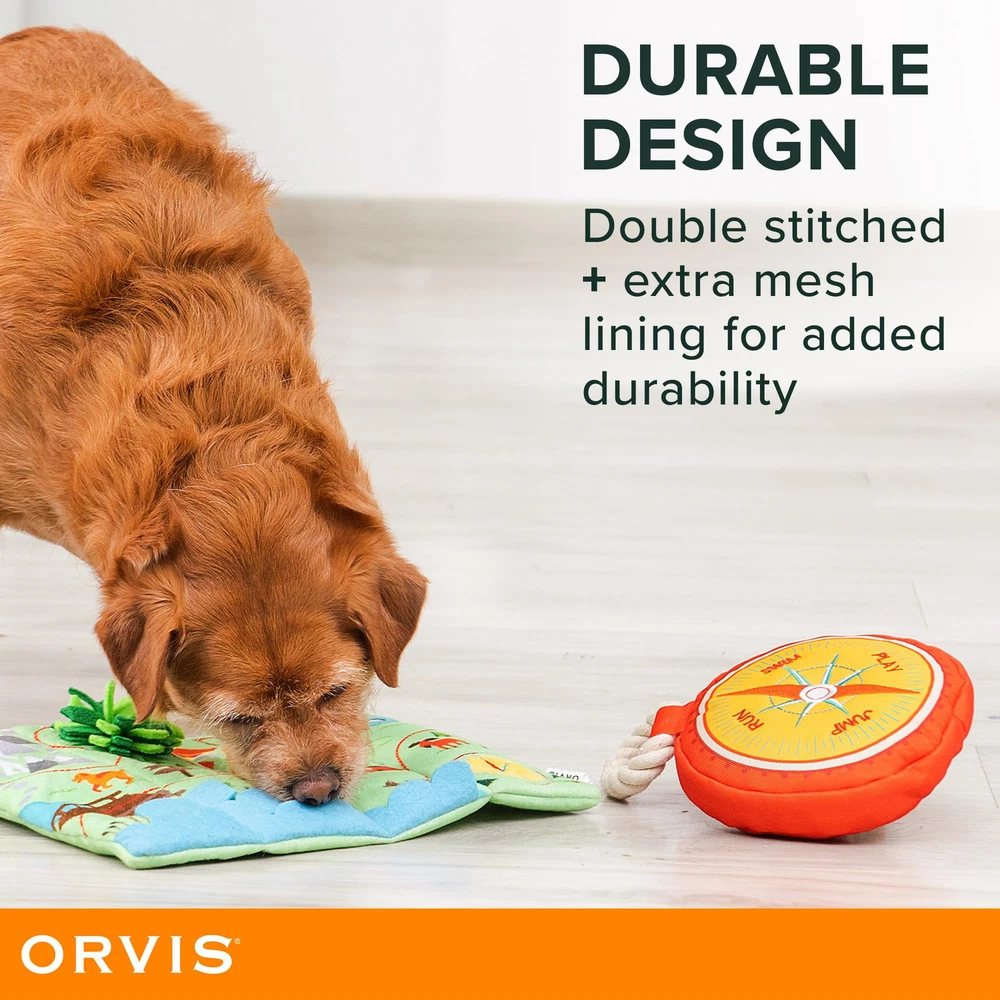 Every camper needs a compass and map to find what’s most important! In this case, that’s treats, food, hugs, and kisses! With a crinkly map and a squeaky compass, your pup can their guide to fun! Bring home the ® Dog All Trails Lead to Fun 2pc Map and Compass Crinkle & Squeaker Tug and Chew Dog Toy Set. This amazing dog toy set is perfect for your fur friend's playtime, whether it's indoor or outdoor. The set includes a map toy which is a 'flattie style' with low stuffing for extra durability, measuring 9”x11”. It is equipped with lots of crinkle and a squeaker to keep your dog entertained and engaged. The map also features a treat-hiding snuffle mat, making it of the best interactive dog toys in the market. The plush compass includes a squeaker and a rope handle. This versatile toy is perfect for a game of tug or chew, catering to your dog's natural instincts. The compass is double stitched with extra mesh lining for added durability, making it an ideal choice for tough chewers. ® Dog: Adventure Unleashed - We're making it more convenient than ever to take your pets along on everyday adventures, from cross-country camping to a day at the local park. Check out the full range of Dog: portable, multifunctional travel gear; all-weather apparel; on-the-go grooming solutions; energy-fueling snacks, and outdoor toys in fun designs that celebrate the Great Outdoors. Observe your pet’s behavior with the product for suitability. Some toys may be inappropriate for your pet. Remove and replace if the product becomes damaged. This item is intended for a short duration and under close supervision. INTERACTIVE DOG TOY - This 2pc set includes a map and compass toy that are designed with a crinkle and squeaker, making them perfect for interactive play sessions. The toys also have a rope handle for tug and chew, providing your dog with hours of fun and entertainment. DURABLE DESIGN - Both the map and compass toys are double stitched with extra mesh lining for added durability. These toys are tough and sturdy, making them ideal for aggressive chewers and large dogs. FLATTIE MAP DOG TOY – The map toy measures 9”x11” and is a stuffing-free, flattie style dog toy. TREAT HIDE SPOTS- The map component of this toy features a treat-hiding snuffle mat, adding an extra layer of fun and challenge for your dog. SQUEAKY FUN - The compass is a standard plush with a squeaker, providing your dog with a fun and engaging toy to play with. The squeaker is loud and clear, attracting your dog's attention and keeping them entertained.