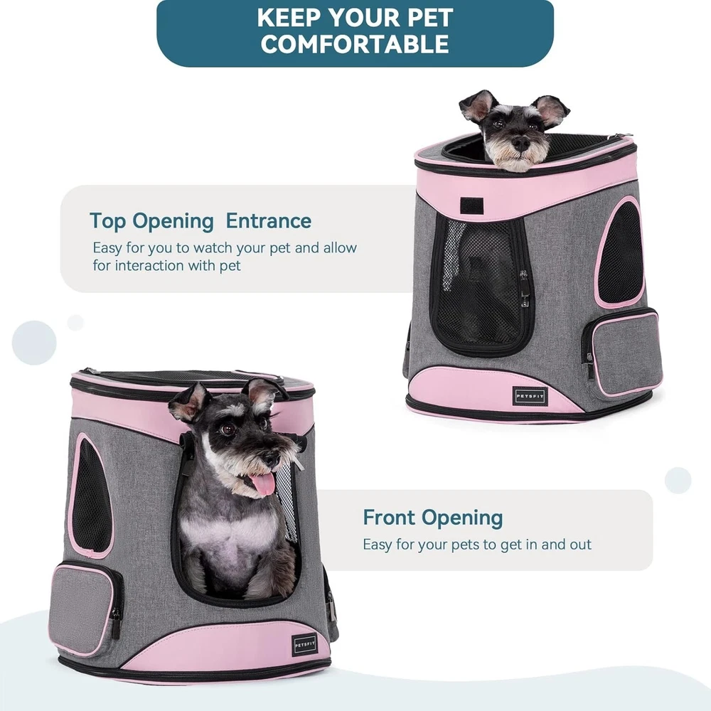 About this item NEW VERSION:Decompression design, upgrade back, increase waist protection design, more comfortable and fit our back, this cat backpack also has shoulder straps, waist and chest buckle, all help to reduce the burden, even if the long journey does not feel tired, take your pet on a trip now! DOG CARRIER BACKPACK DIMENSIONS: With roomy space, This Petsfit pet backpack dimension is 13.5"L x 12.5"W x 17.5"H, Perfect for cats, dogs bunnies up to 18lbs/8kg KEEP YOUR PET COMFORTABLE: Our cat backpack is equipped with a firmly reinforced structure to prevent itself from collapsing on your pet while traveling. Removable cozy mat for easier cleaning and let your pet enjoy it inside. 4 mesh windows give your pet great air circulation and visibility on the go KEEP YOUR PET SAFE:The cat backpack carrier adopts durable lockable zipper (in opening) and a build-in safety belt which prevent pet from escaping from inside, thickened zipper on the bottom, fine workmanship, durable and not easy to break ,providing better security for your pets MADE TO LAST:This cat backpack carrier is made of extra durable 600D Oxford Cloth, no more worry about the scratches or gnawing from your pets. Easy to fold, double side pockets can store food, water, garbage bags,you can use it to carry small dogs or cats for biking, camping, outdoor walking or meeting friends Why choose PETSFIT dog backpack carrier? The entrance door and top window adopt lock-type zippers design to prevent the zipper from being opened by pets, providing double protection Adjustable shoulder pad to reduce stress and improve comfort, there is a waist buckle at the bottom to prevent deviations from shoulder straps in order to maintain the stability of the backpack The built-in safety rope with hook can be connected to the dog's collar, to prevent pets from escaping and falling. When opening the top, it can ensure pet's safety Soft fleece mat for your pet to sit or sleep can be clean with a soft wet brush or take out for hand-wash or machine-wash. The double-sided used design will be perfect for different seasons At Petsfit, we focus on taking perfect care of your pet and are committed to providing you with something different, something better Product information Item Weight 3.66 pounds Manufacturer Petsfit ASIN B0C9D6WQLQ Country of Origin China Item model number DCC1502030AIZ2b Date First Available June 26, 2023 Item Package Dimensions L x W x H 15.94 x 12.91 x 4.21 inches Item Dimensions LxWxH 12 x 15 x 16 inches Brand Name Petsfit Target Audience Keyword Dogs Warranty Description 1 Model Name DCC1502030AIZ2b Color aPink Material Polyester Age Range Description Puppy Manufacturer Petsfit Style Casual Included Components pet backpack Specific Uses for Product Outdoor