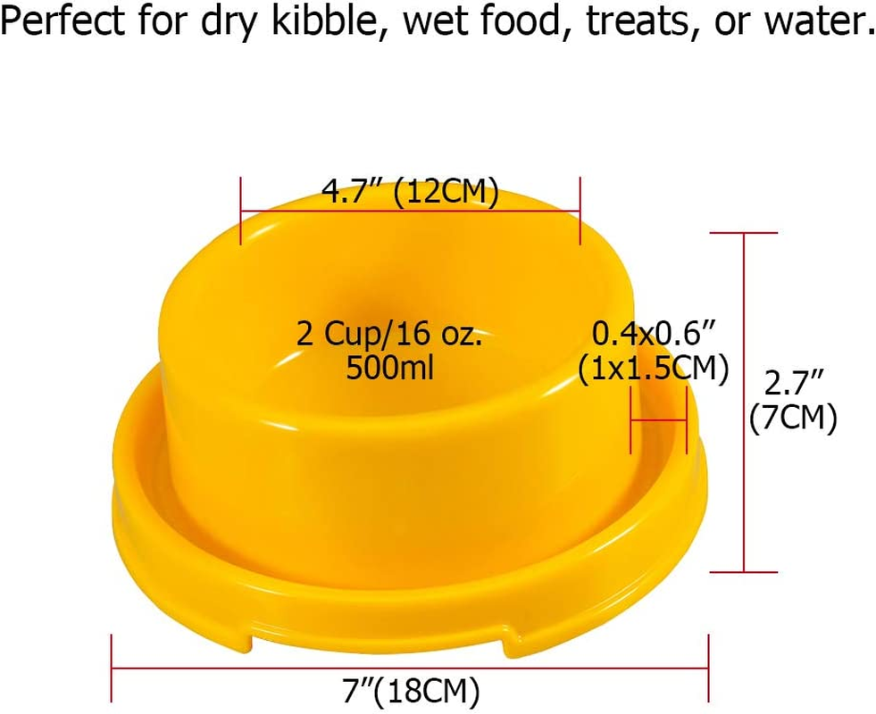 FOOD & WATER: Set of 2 pet bowls, allows you to feed food and water at the same time. This bowl can be hold 16oz, Perfect for big dogs, puppy, cats and other small animals. NON-SKID: Puppy bowl has non-slip rubber on the bottom, It will protect the floor and prevent the bowl from slipping while the pet is eating or drinking. ROBUST MATERIAL: The bowls is made with food-safe plastic, safely feeding your lovely dog. Bright and colorful appearance will give your pet a happy eating experience. This bowl is strong enough to withstand your dog bites. EASY CLEAN & PORTABLE: Cdipesp Animal Bowls are easy to clean, the smooth surface can be cleaned by hand or dishwasher. It's also lightweight, You can put it in your bag when you are traveling with your dog. MOAT DESIGN: Put water or mineral oil into the bowl moat, they will no longer be able to enter the food. Suggest put the oil or dish soap in moat, it will be evaporate slower. Product description Dog Food Bowls Pet Water Bowls Cat Feeding Bowl Puppy Food Dish Every pet owner should provide a bowl for pets to eat food or drink water. The Cdipesp bowl is your best choice. Material: Plastic Bowl capacity: 2 cups (16 ounces ) Outside Size: 7 x 7 x 2.7 inches Inside Size: 4.7 x 4.7 x 2 inches Package Included: 2 x dog bowls (blue and yellow)
