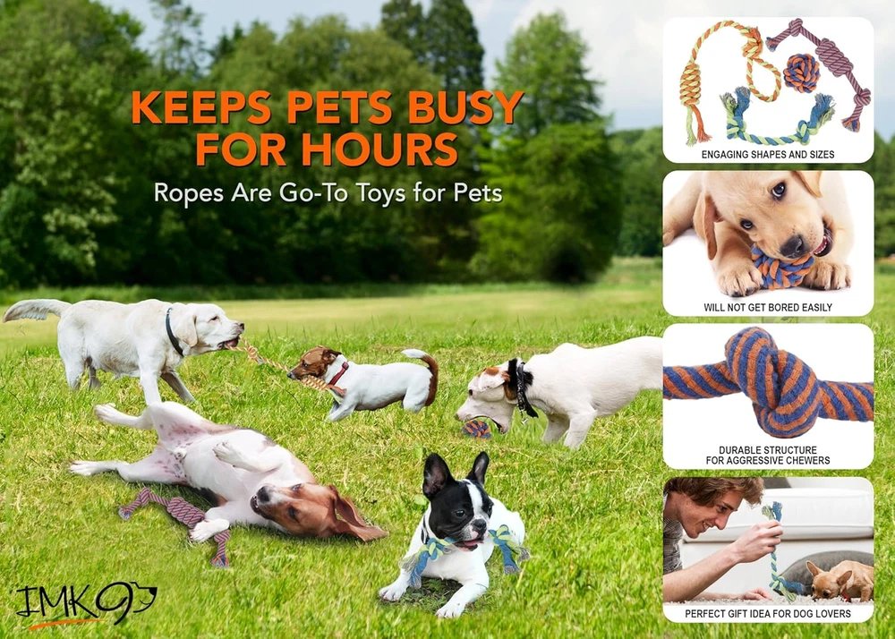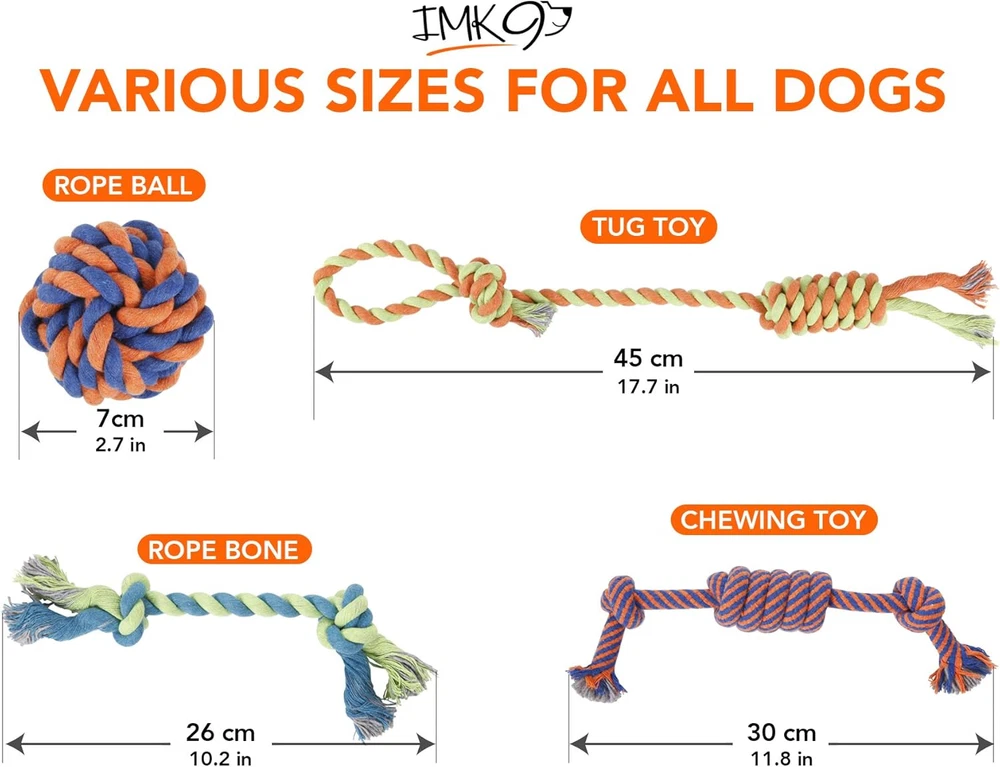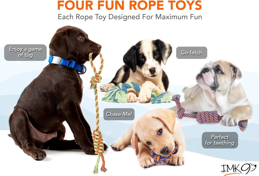 FOUR FUN ROPE TOYS: Each of these toys is designed for a different purpose. One of them is perfect for playing tug (our dog’s favorite!), one of them is for teething and gnawing, one of them is all balled up for rolling around, and one of them is a perfect rope “bone” for playing fetch. YOUR DOG WILL LOVE THEM: These engaging rope chew toys will keep your furry friend occupied for hours. With four different toys, he won’t get bored easily, and they are fun enough to prevent destructive chewing and keep him focused on the things he’s allowed to chew! JUST THE RIGHT SIZE: We’ve carefully designed these toys to be suitable for dogs of any size, from puppies and small dogs all the way up the largest breeds. Each of them have thick and thin parts, so all dogs can grip firmly to enjoy chewing and playing. GREAT FOR TEETH: Chewing these rope toys isn’t just comforting for teething puppies. It can also help to stimulate teeth growth. For older dogs, the brushing action of chewing can clean the teeth and prevent decay. We love our dog as much as you do. Product Description