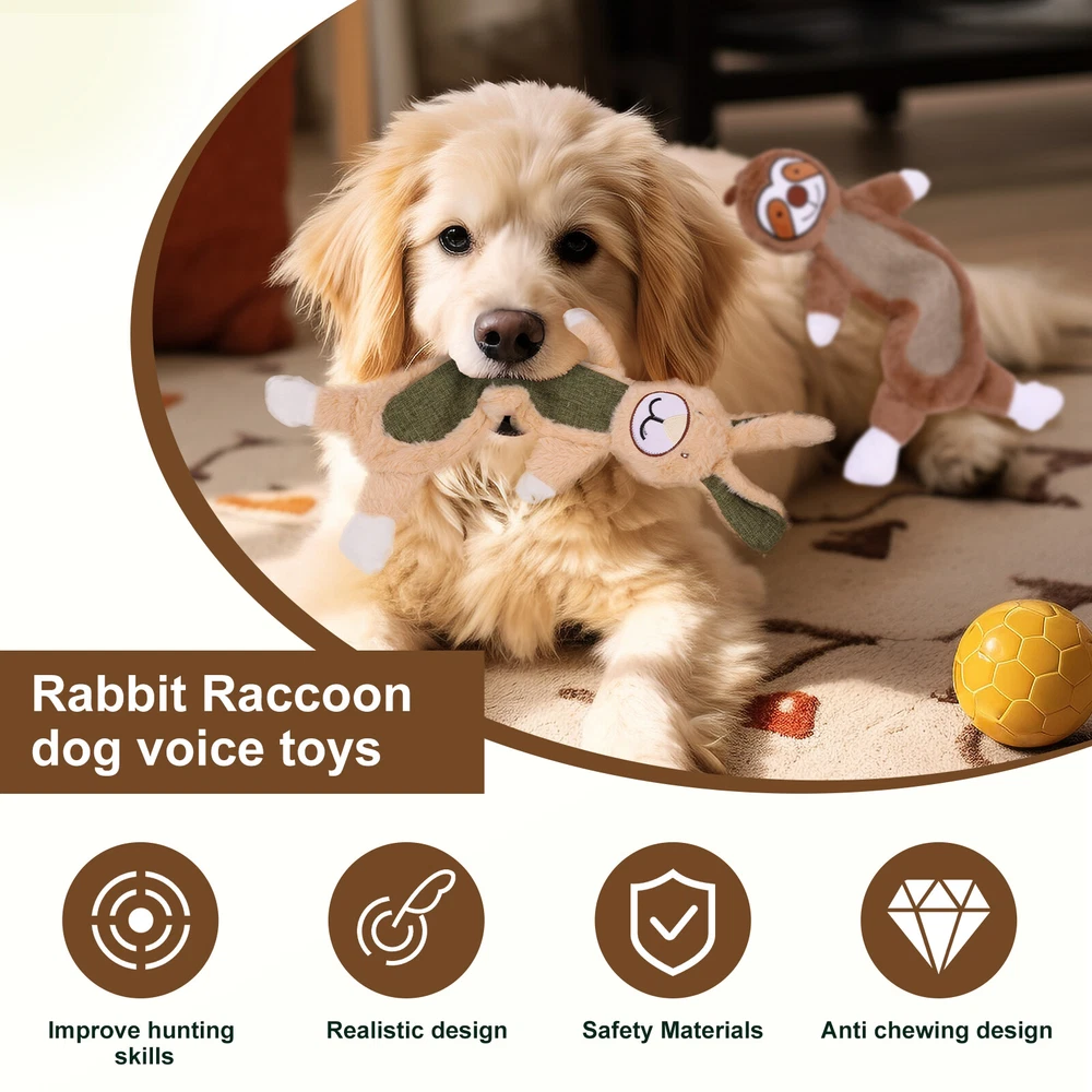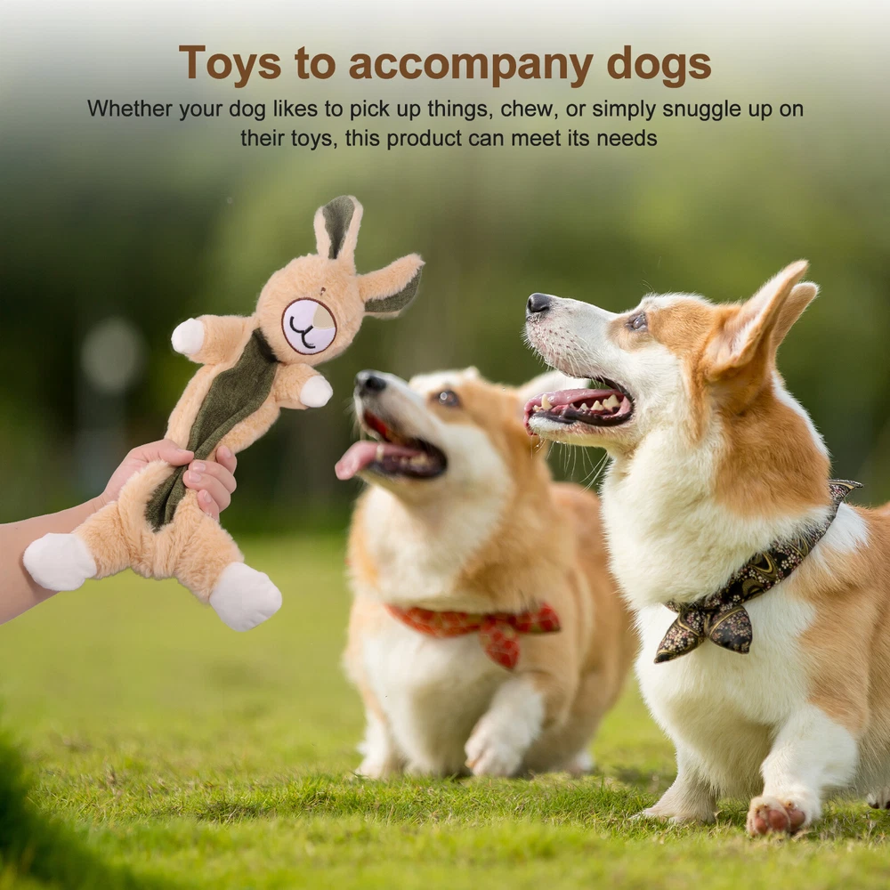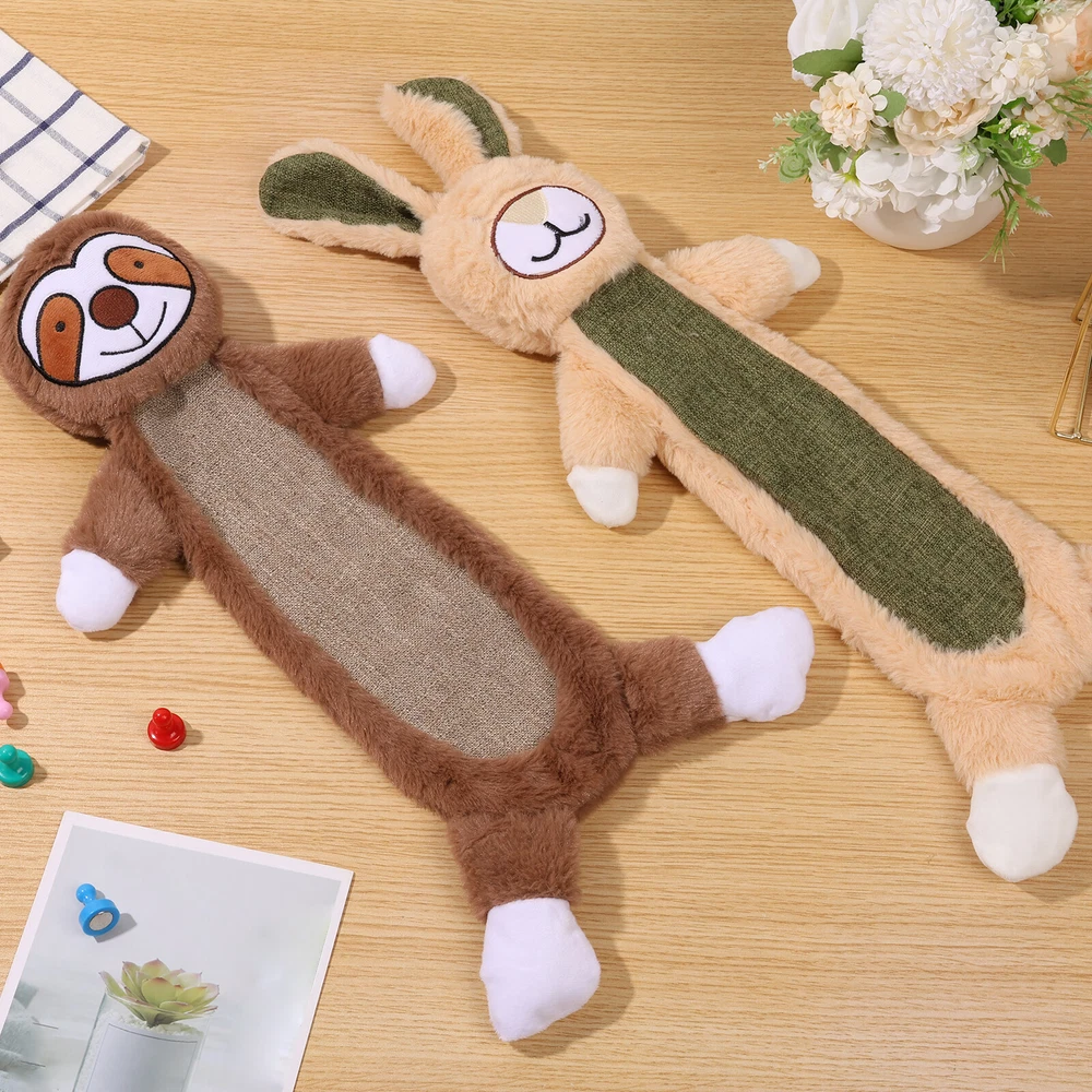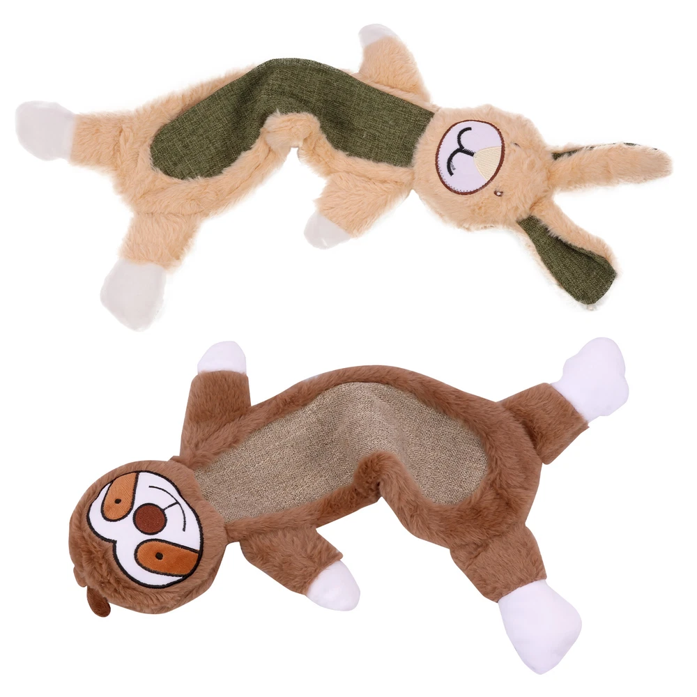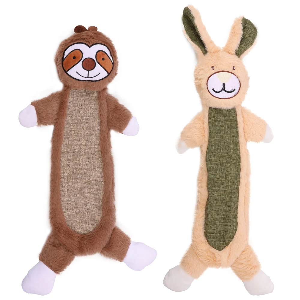 Parts List: 1×Sloth Shape Dog Plush Toy 1×Rabbit Shape Dog Plush Toy Highlight description: Charming Shape: Our dog toy adopts charming rabbit and sloth shapes, which is designed to engage your pet in interactive play and ignite your dog's playful spirit Safe Material: Our dog toy is made of safe material, remaining gentle on the dog's teeth and gums while the dog has fun playing. It has no additional fillers, like fabrics, cotton Crinkle Paper Design: Each plush toy has an inner crinkle paper that produces stimulating sounds that dogs love. This auditory element not only attracts their attention, but the squeaky sound adds an exciting sensory dimension Funny Dog Playmate: This toy can accompany the dog when the owner is out or busy. Whether your dog likes to fetch, chew or simply snuggle with the toys, this product can satisfy it Note: It is worth noting that these toys are not suitable for aggressive chewers such as hounds. We still need to use caution for indestructible tough chewers Detailed description: Description: This plush dog toy is wear resistant and chew resistant, making it fun to play while remaining gentle on your dog's teeth and gums. It features fun rabbit and sloth shapes to engage your dog in interactive play. It has a crinkle paper interior that creates stimulating sounds that dogs love. Feature: Sound Making Toy: This plush dog toy can make crinkle sound to attract dog attention and add an exciting sensory dimension. Interactive Toy: Our dog toy can engage your pet in interactive games and making your pet's playtime more dynamic and enjoyable. Specification: Product Name: Dog Plush Toy Product Material: Faux Rabbit Fur+Linen Product Size: Sloth shape toy unfolded size: 53×22×5 cm Rabbit shape toy unfolded size: 60×25×6 cm Product Weight: Sloth shape toy: 92g Rabbit shape toy: 92g Color: As Shown Notes: 1.It is worth noting that these toys are not suitable for aggressive chewers such as hounds. We still need to use caution for indestructible tough chewers. 2.There may be slight differences between the picture and the actual color of the commodity. We will try our best to show you the exact color. 3.Please allow slight dimension difference due to manual measurement.
