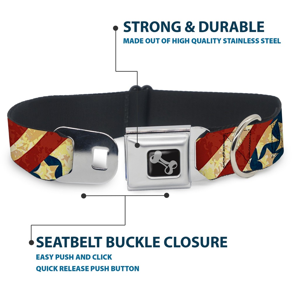 Further Details Title: Dog Collar Bone Americana Diagonal Vintage Stars & Stripes2 Medium 11-16.5" Condition: New Release Date: 03/16/2017 Item Weight: 95g Item Height: 25mm Age Level: ‎All Life Stages Brand: Buckle-Down Designs MPN: W30140-1.0-M Item Length: 431mm Size: 1" Wide - Fits 11-16.5" Neck - Medium Number of Items: ‎22196 Type: Dog Collar Seatbelt Buckle Material: Nylon Pattern: Dog,Stars Dimensions: 17 x 1 x 1 inches; 3.36 ounces Item Width: 25mm Color: Red Description: Your dog will be the talk of the town when people notice they're wearing this awesome SeatBelt Dog Collar! Made from high-density polyester and durable steel components, this collar is built to last. It features beautiful vibrant artwork. The buckle is a miniature authentic SeatBelt Buckle, so you press the center button to release the clasp. This product is assembled in the USA by Buckle-Down Inc. and officially licensed by Buckle-Down. Closure: Buckle Dog Breed: ‎All Breed Sizes Fits 11-16.5" neck size and is 1" wide. The buckle is a miniature authentic SeatBelt Buckle, so you press the center button to release the clasp. Made from high-density polyester and durable steel components, this collar is built to last and features beautiful vibrant artwork. This patented product (D609,408) is assembled in the USA by Buckle-Down and is officially licensed by Buckle-Down. Matching leads/leashes available. Missing Information? Please contact us if any details are missing and where possible we will add the information to our listing.