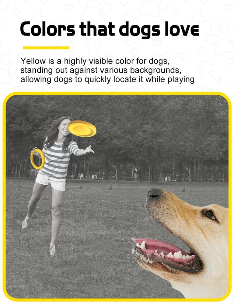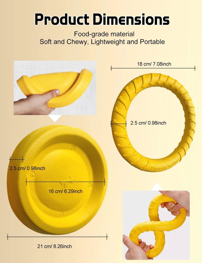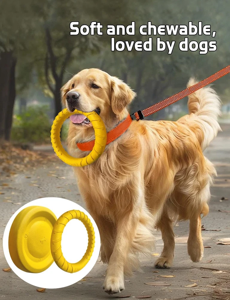 Flying Disc for Aggressive Chewers: Made from flexible EVA material, Moderately soft and firm, offering bite resistance while protecting your dog's teeth. While materials that are too hard provide excellent chew resistance, they can also damage your dog's teeth. Multi-Functional Dog Flying Disc: The flying disc features a grooved design and is approximately 0.99 inches thick, making it usable as a dog food bowl. Chew ring toy for dogs: Bite-resistant, recommended for dogs with aggressive chewing habits. Can replace a frisbee and is great for outdoor activities with your dog, such as fetch or tug-of-war. Helps alleviate anxiety and reduces destructive behaviors. Color Favored by Large Dogs: Yellow is a highly visible color for dogs, standing out against various backgrounds. This makes it easier for dogs to quickly locate the toy while playing, making training more fun and easily. Food-Grade Material: 100% safe, high-density, and odor-free, ensuring your dog’s health and your peace of mind. Floating Dog Toy: Lightweight and easy to carry, this toy can be used anywhere. The light EVA material allows it to fly farther and even float on water. Perfect for interactive play with your dog at the beach or pool. Note: The dog ring chew toy is bite-resistant and recommended for dogs with aggressive chewing habits. Product Description The video showcases the product in use. The video guides you through product setup. The video compares multiple products. The video shows the product being unpacked. The dog flying disc set provides everything you need for interaction, fitness, training, and play with your dog. Flying Disc dog toy Flying Disc for Aggressive Chewers Made from flexible EVA material, Moderately firm and soft, it provides a certain level of tear resistance while ensuring the safety of your dog's teeth. Floating Dog Toy: Lightweight and easy to carry, this toy can be used anywhere. The light EVA material allows it to fly farther and even float on water. Perfect for interactive play with your dog at the beach or pool. The video showcases the product in use. The video guides you through product setup. The video compares multiple products. The video shows the product being unpacked.