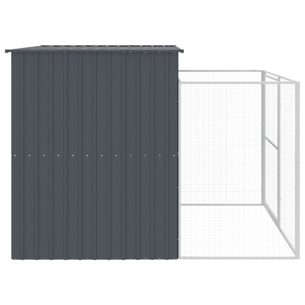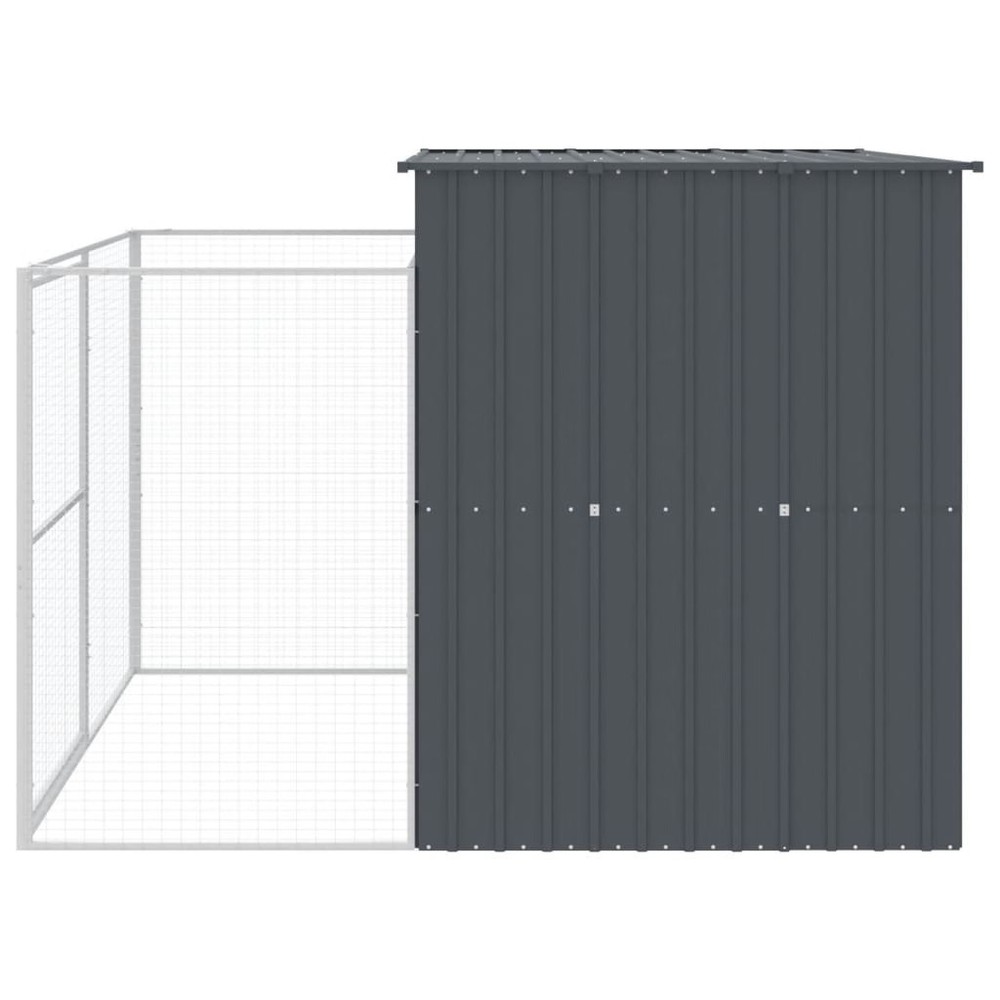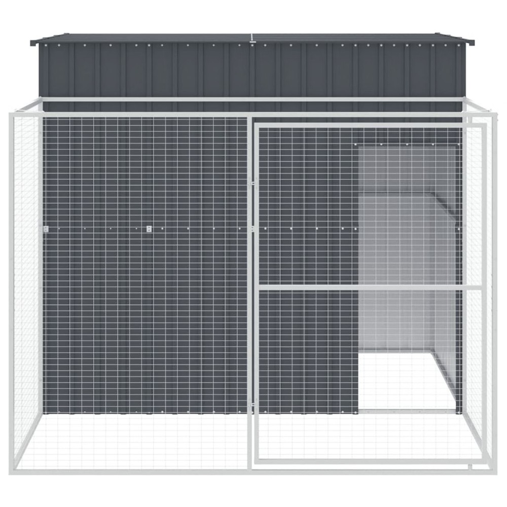 Size: 84.3 x 99.6 x 71.3 in This Anthracite Dog House with Run is a great spot for your furry friend. Made from galvanized steel, it mixes style and function, showing off a modern industrial vibe that fits nicely in any garden or outdoor space. The sturdy design ensures your dog house can withstand tough weather conditions. Weatherproof elements keep your dog warm and dry, rain or shine, making it a great year-round choice. Escape-proof latches give you peace of mind, ensuring your pet is safe while enjoying the outdoors. The extended run allows for plenty of playtime and exercise, boosting your dog's well-being. The sleek finish not only looks good but also makes cleaning a breeze, keeping your pet's area hygienic. Color: Anthracite Shape: Rectangular Material: Metal Steel Indoor/Outdoor: Outdoor Only Cover Included: No Room: Other Dimensions: 84.3 x 84.3 x 71.3 in (W x L x H) Delivery Contains: 1 x Dog house Assembly Required: Yes Recommended Number of People for Assembly: 2