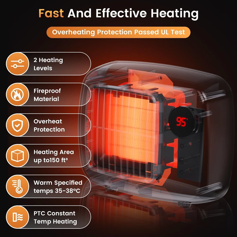 ๐๐๐๐ ๐๐๐๐ญ๐๐ซ ๐๐จ๐ซ ๐๐๐ญ ๐๐จ๐ฎ๐ฌ๐๐ฌ & ๐๐ก๐ข๐๐ค๐๐ง ๐๐จ๐จ๐ฉ๐ฌ: Our pet heater functions on 120V AC voltage with settings - 300W๏ผ95ยฐF๏ผ or 600W(100ยฐF), heating up an area of 150 square feet, depending on the airtightness of the room. The compact and lightweight model makes wall-mouting a breeze with dimensions of just 6.97x5.75x 5.2inches. ๐๐๐ฌ๐ข๐ ๐ง๐๐ ๐ฐ๐ข๐ญ๐ก ๐๐๐ญ๐ฌ ๐ข๐ง ๐๐ข๐ง๐: Our outdoor pet heater integrates multiple safety features, including a functioning thermostat, overheat protection, and an anti-chew cord. The insulated surface prevents any potential burns from touching the heater, making it perfectly safe for your pets. With a powerful capacity of up to 600W, it can quickly radiate a constant temperature to warm up your pet's space in just 3 seconds. ๐๐ฎ๐ฅ๐ญ๐ข๐ฉ๐ฎ๐ซ๐ฉ๐จ๐ฌ๐ ๐๐ข๐ง๐ญ๐๐ซ ๐๐๐๐ญ๐๐ซ ๐๐จ๐ซ ๐๐๐ซ๐ข๐จ๐ฎ๐ฌ ๐๐ง๐ข๐ฆ๐๐ฅ๐ฌ: Certified by ROHS, our hound heaters are effective for outdoor pet houses, chicken coops, rabbit hutches, as well as environments for other small livestock. They're especially beneficial for pregnant animals, newborn pets, and older animals by providing them with a warm haven during winter. Also fit |Outdoor Protable Greenhouse Heater. ๐๐ข๐ฆ๐ฉ๐ฅ๐ ๐๐ง๐ฌ๐ญ๐๐ฅ๐ฅ๐๐ญ๐ข๐จ๐ง ๐๐ง๐ ๐๐ฅ๐๐๐ง๐ข๐ง๐ : Our insulated waterproof heater comes with an independent safety bracket for easy installation. Mounting the heater is as simple as finding a point high enough to be out of pet's reach, making holes, and hanging the heater. Additionally, due to the magnetic hair guard at the back, cleaning pet hair and dust doesn't require dismounting the heater, ensuring daily convenience. ๐๐จ๐ฐ ๐๐จ ๐๐๐ฃ๐ฎ๐ฌ๐ญ ๐ญ๐ก๐ ๐๐๐๐ญ๐ข๐ง๐ ๐๐จ๐๐?? You Can Control the kennel heater If on High or Low:Note: if the outside dog house environment exceeds 100ยฐF (38ยฐC), the pet heating element will stop working and the heater will only blow air, not heat up; The heating element will restart and continue to heat up only when the temperature is below 95ยฐF (35ยฐC). Before pick us, Please measure the size of the dog house and where it will be installed in advance. ๐๐๐ฌ๐ข๐ ๐ง ๐ฐ๐ข๐ญ๐ก ๐๐๐๐๐ญ๐ฒ ๐๐จ๐ง๐๐๐ซ๐ง๐ฌ: pet heater is the new generation dog heater, with an adaptive variable temperature system applied๏ผ95ยฐ&100ยฐF๏ผ. The highest working temperature can reach 95ยฐF. The temperature will stop and keep space warm on 95ยฐF after reaching the highest temperature, then goes back to 95ยฐF. The processes will repeat over and over again. This dynamic heating process is designed to protect your pet from being burned and saves energy as much as possible. ๐๐ง/๐จ๐๐ ๐๐จ๐ง๐ญ๐ซ๐จ๐ฅ ๐ ๐ฎ๐ง๐๐ญ๐ข๐จ๐ง๐ฌ๏ผThere is no automatic shutdown, and there are 2 gears to choose from. We have received a lot of requests from our users for temperature adjustments as well as timings, and this year we are working on new feature requests. If you are interested in joining the Dog heater , please us. ๐๐๐๐ฉ๐ญ๐๐๐ฅ๐ ๐๐จ๐จ๐ค ๐๐จ๐ซ ๐๐ก๐ข๐๐ค๐๐ง ๐๐จ๐จ๐ฉ ๐๐ซ๐จ๐จ๐๐๐ซ๐ฌ: To cater to those running chick brooder programs, we've included a 25-inch adjustable lanyard, allowing you to hang the warmer for optimal heating. This simple installation process using 4 hooks will ensure your chicks and hens are warm and comfortable, preventing excessive hypothermia. The Dog House Heater is Durability &Strength, it come longevity for the Pet. We are deeply involved in the team around the life of pets and poultry, and also has a range of essentials for pets in winter: Dog and cat kennels heater and outdoor houses cat winter.