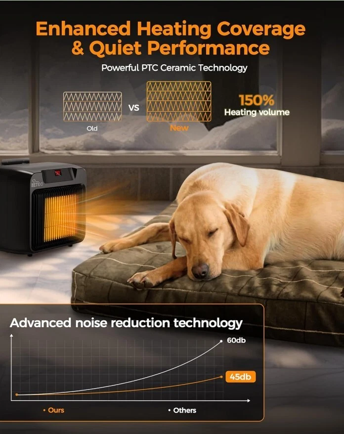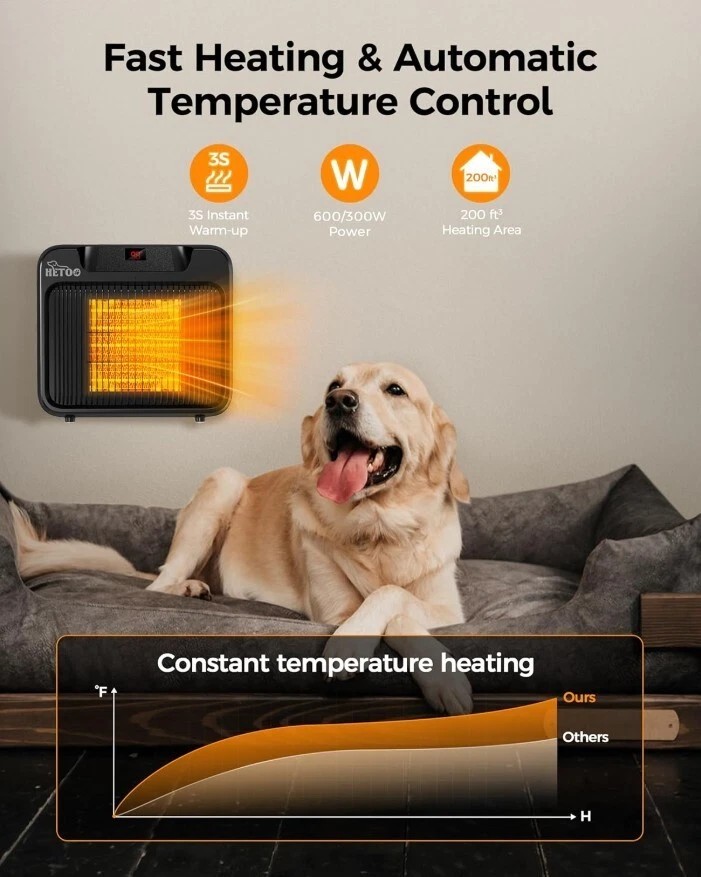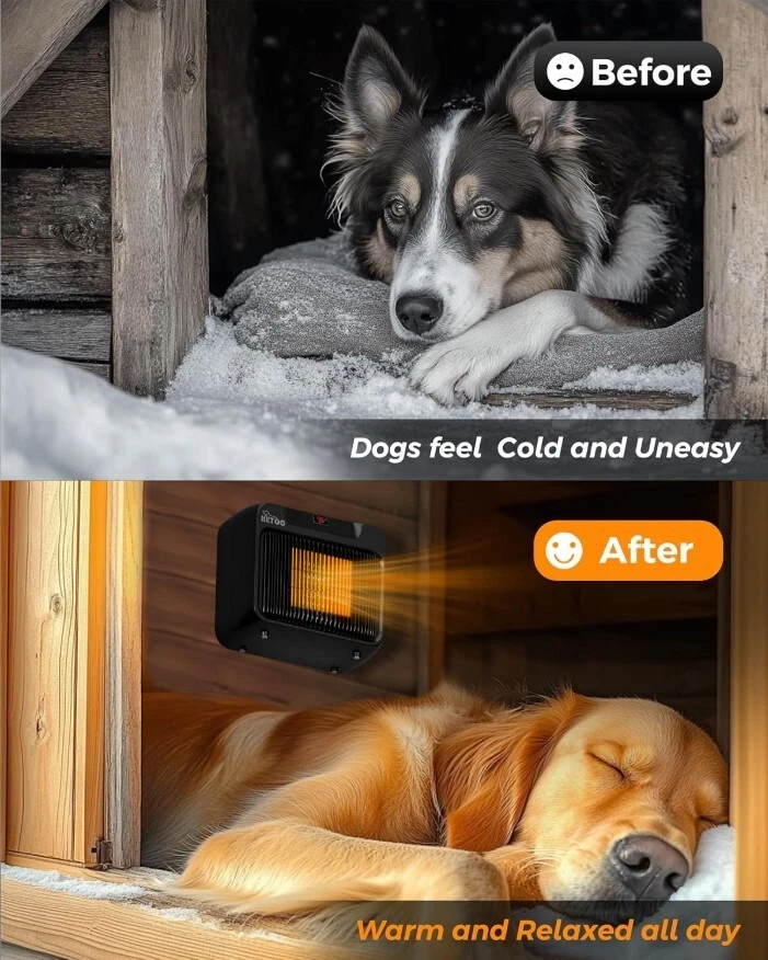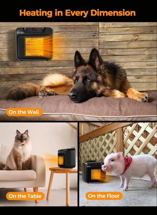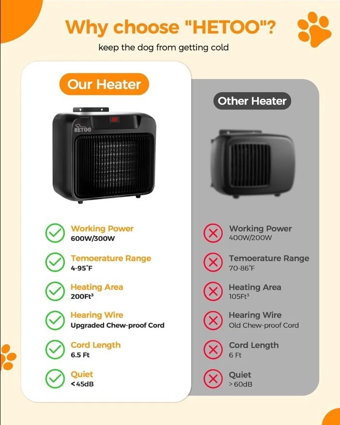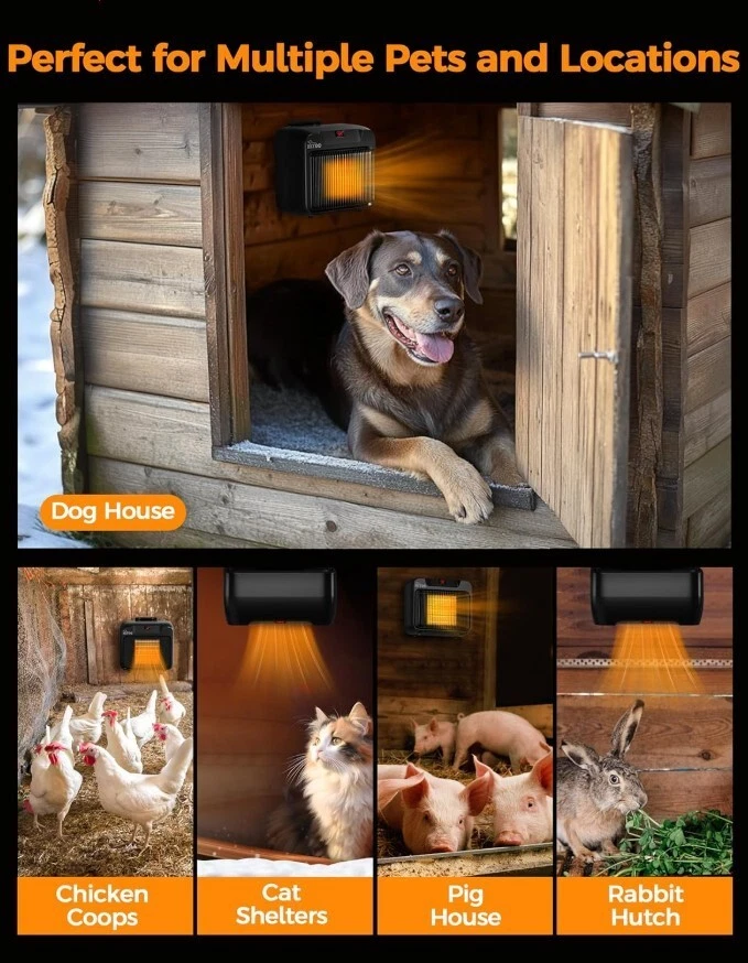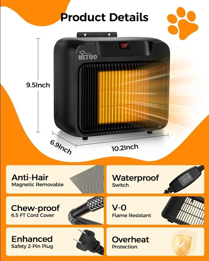 Dog House Heater with Thermostat, Wall-Mounted 600W/300W Dog Heater, 6.5Ft anti About this item Upgrade Well Made & Durable Safety: HETOO dog house heater outdoor integrates powerful safety features, equipped with anti-tip design, auto temperature regulation, overheat protection,and an upgraded 6.5 ft chew-resistant certified cord, ensuring a safe and cozy environment for your dog Fast Heating & Temperature Control: The dog kennel heater combines an advanced PTC system and high-efficiency fan heat up in just 3 seconds. Using 300W and 600W settings to heat spaces up to 200 ft³. Note: This heater does not have an automatic shut-off feature. How to adjust the heating mode? Simply use the switch for easy operation. Note: If the external dog house temperature exceeds 100°F (38°C), the heating element will stop working, and the heater will switch to fan-only mode. The heating element will only restart when the temperature drops below 95°F (35°C). Please measure your dog house’s size and installation location before purchasing Easy to Install & Clean: Set it on a table or floor, or find a wall, making holes, and hanging the heater, plug it in, and you're good to go.Additionally, the magnetic hair guard on the back allows you to clean pet hair and dust without disassembling the pet heater, ensuring everyday convenience Quiet Design: Have you ever heard the sound of a gentle breeze rustling through leaves? It’s close to 50 db, but our heater uses a brushless DC motor that reduces noise to just 45 db, making it suitable for noise-sensitive pets. It won't disturb you or your pets, even indoors. Multi-Purpose for Various Animals: Compared to traditional solar powered heater, this one features a smaller size with a wider heating range, making it perfect for all dog breeds. It can also be used to warm lambs, pigs, chicks, or any sick or cold animals, helping them stay happy and cozy through the cold season. Specifications Special Feature Energy Efficient, Portable, Adjustable Temperature, Fast Heating, Overheat Protection Color black Form Factor Cabinet Indoor/Outdoor Usage Outdoor, Indoor Product Dimensions 10.07"D x 7.08"W x 9.37"H Recommended Uses For Product Dog House Mounting Type Floor Mount Heating Coverage 200 cubic feet Burner type Radiant Fuel Type Electric Voltage 120 Volts Item Weight 3.96 pounds Shipping Tracking number: Available We use a selection of shipping services such as UPS, FedEx, USPS etc. We only ship to the lower 48 states, no APO/FPO addresses or PO Boxes allowed. Local pickups and combined shipping options are not provided at this time. Tracking number: Available We use a selection of shipping services such as UPS, FedEx, USPS etc. We only ship to the lower 48 states, no APO/FPO addresses or PO Boxes allowed. Local pickups and combined shipping options are not provided at this time. Contact us We can be contacted at any time through eBay messages if you have any questions, comments or product requests. We will respond to you within 24 hours and do our best to help you out! We encourage our customers to contact us with any questions or concerns! We'd like to be sure you are completely satisfied with your purchase.