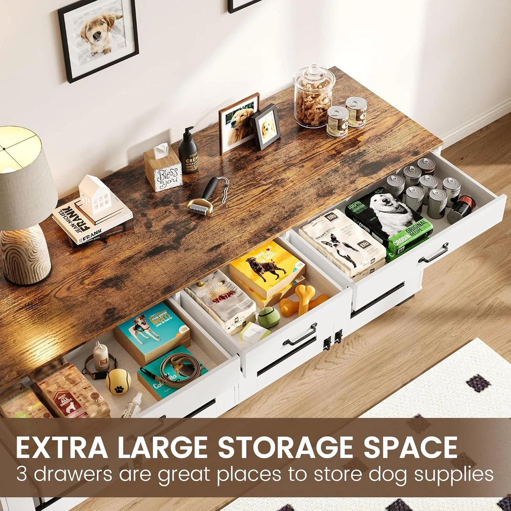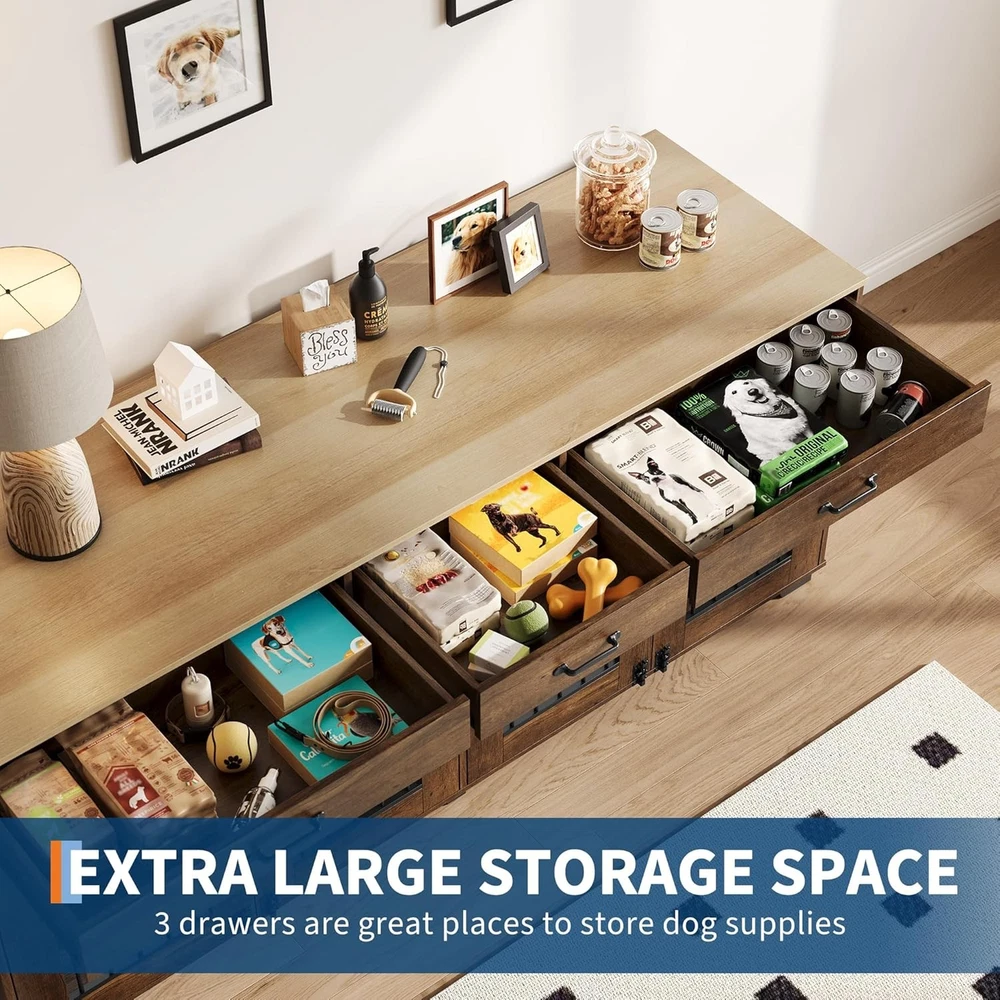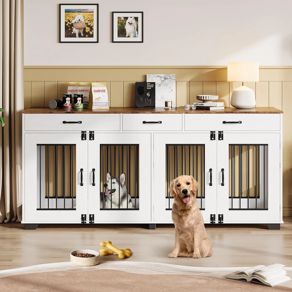 Product description Garvee 71 Inch Dog Crate Furniture Extra Large Storage Space Dog Crate & Tv Stand Dog Cage Furniture for 2 Dogs Wide Top Surface Is it easy to assemble? Yes, we provide detailed installation instructions and optimize the installation process and instructions, including each screw and panel are clear and easy to understand, adults can also assemble it easily. What size dogs are suitable for this 71-inch double cage? This 71-inch furniture-style double cage is suitable for most small, medium and large dogs. We recommend that you measure the size of your dog before purchasing. The size of a single room in the cage is 34.3"*22.1"*25.8". Is it sturdy and chew-resistant? Yes! It features 0.5-inch thick metal pipes and wooden boards, which are 0.15 to 0.2 inches thicker than a standard double dog crate. The thicker materials provide better load-bearing capacity and create a more durable product.