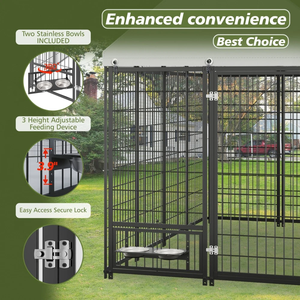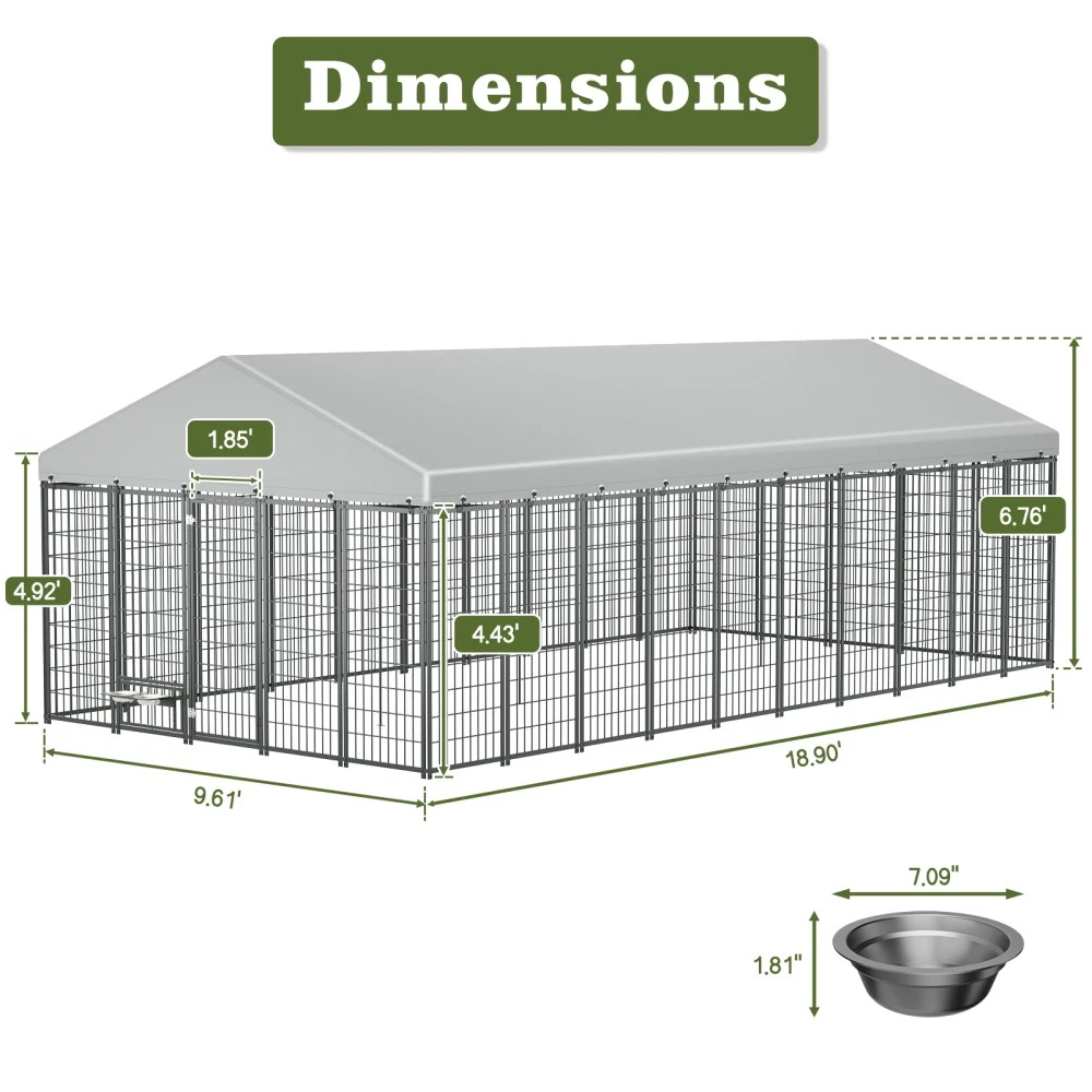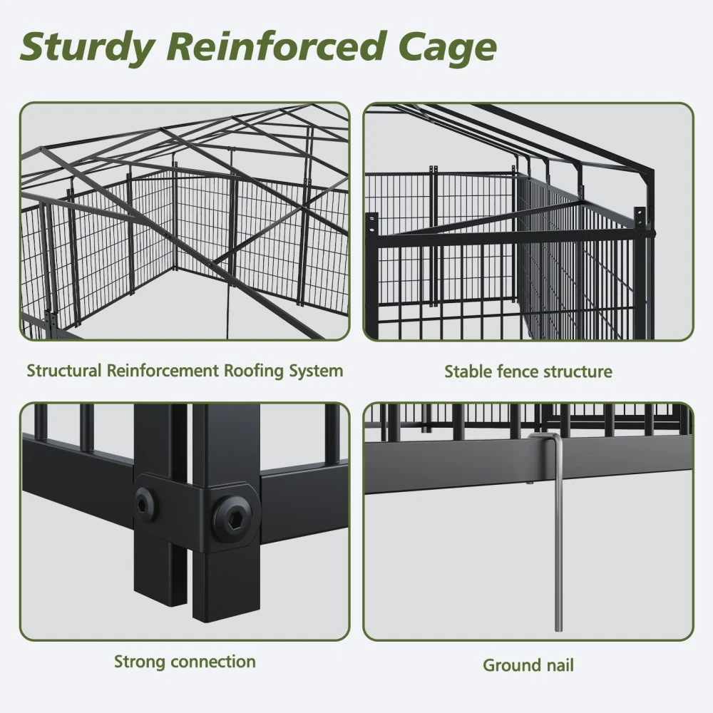Key Product Specifications Color: Sleek Black Material: High-Quality Iron (Durable & Rust-Resistant) Assembled Dimensions: 7.94'L x 4.13'W x 5.95'H (95.28" L x 50.00" W x 71.65" H) Door Dimensions: 1.8'W x 4.02'H (Easy In & Out for Pets) Product Weight: 83.30 LBS Package Dimensions: 54.72" L x 26.38" W x 7.68" H Package Weight: 88.85 LBS Assembly Time: Approximately 45 Minutes (All Hardware Included) Package Quantity: 1 Box (All Modules Included) Why Choose Our Outdoor Dog Kennel? ✅ Spacious Living Space for Happy Pets Measuring 7.94’L x 4.13’W x 5.95’H, this oversized pet enclosure offers plenty of room for your furry friends to move around, play, and rest freely. The open design ensures excellent ventilation and visibility, reducing anxiety and creating a comfortable living environment. ✅ Reinforced & Secure Structure Crafted from premium iron, this dog cage features a sturdy frame with multiple load-bearing columns for enhanced stability—no wobbling even in windy conditions! The double door lock design provides double security, preventing your pets from escaping unexpectedly and keeping unwanted animals out. ✅ Convenient Feeding Design Equipped with 2 rotating feeders that can be adjusted up and down by 3.9 inches. This thoughtful design allows you to feed your pets easily without opening the main door, saving time and hassle. Perfect for both food and water placement. ✅ All-Weather Protection The advanced roof cover is windproof, UV-resistant, and waterproof, effectively shielding your pets from rain, strong winds, and harsh sunlight. Keep your beloved pets dry, cool, and comfortable in any weather condition—summer, winter, rain, or shine! ✅ Multi-Functional Use Not just for dogs! This versatile enclosure is ideal for raising chickens, ducks, geese, rabbits, and other small to medium-sized animals. Great for outdoor use in your backyard, garden, patio, or farm. ✅ Easy Assembly in 45 Minutes No professional tools needed! All modules can be easily assembled with the included connectors and screws. The door can be installed in any position to fit your specific needs—flexible and user-friendly. Premium After-Sales Guarantee 1 YEAR QUALITY WARRANTY & 30-DAY FREE RETURN/EXCHANGE! We stand behind the quality of our products. If you encounter any issues with the dog kennel within 1 year of purchase, we offer free replacement parts or repair services. Not satisfied? Enjoy a 30-day free return or exchange policy—no questions asked. Shop with confidence! Package Includes 1 x Large Metal Dog Kennel Frame 1 x Weather-Resistant Roof Cover 2 x Adjustable Rotating Feeders All Necessary Connectors & Screws 1 x Detailed Assembly Instruction Manual Invest in a durable, safe, and comfortable home for your pets today! Add to cart now and give your furry friends the outdoor space they deserve.
