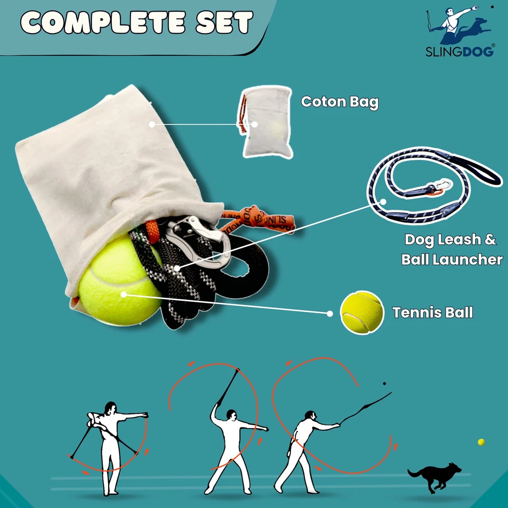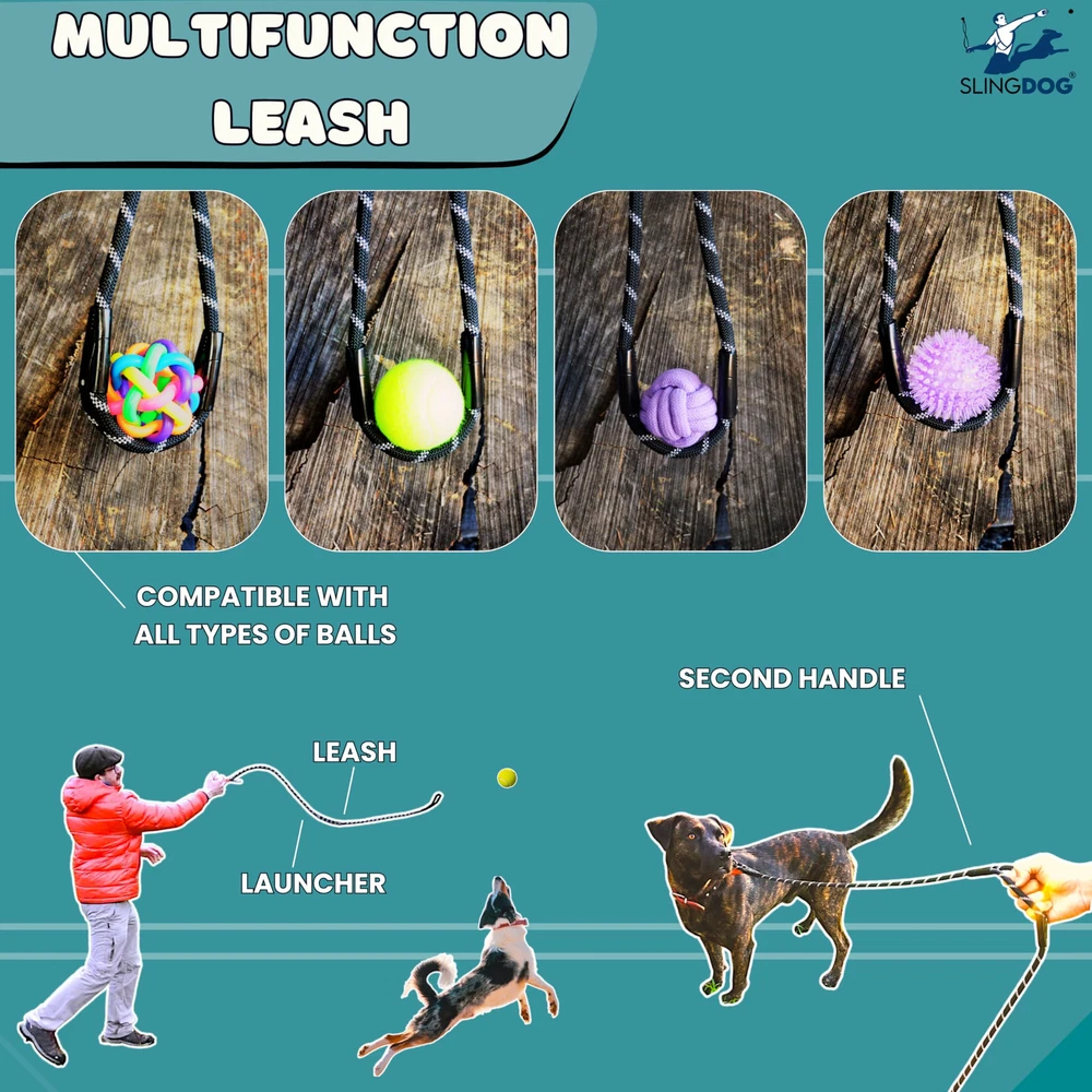 ALL-IN-SOLUTION - Our -in-dog leash and ball launcher defines convenience and fun during your dog walks. Ball holder strings doubles as a second handle, providing enhanced control in challenging or training situations. Our product can be a dog leash, a ball launcher, or a pet toy. It's all three in smart design, making your dog's outdoor adventures more enjoyable. COMPATIBILE WITH ALL TYPES OF BALLS - ball launcher is designed to work with most types and sizes of dog balls, ensuring that you can use your dog's favorite ball without any issue. Our set includes a standard tennis ball to get you started, along with a complimentary cotton bag for carrying the ball on walks. UNBURDENED WALKS - With our Ball Launcher for Dogs you can say goodbye to the hassle of carrying multiple items during your dog walks. Dog Leash and Ball Launcher combo streamlines your outings, with the ball launcher's handle serving as a dual-purpose tool. It's an interactive toy that offers both exercise and the protection, making your walks even funnier. INNOVATIVE EXERCISE SOLUTION - We have combined play and exercise by enabling you to launch a ball further than ever before for your dog using a slingshot-style rope. Provides an interactive playtime experience for your dog, keeping them active and ensures happy experience and quality time for you and for your dog. PRIORITIZING COMFORT AND SAFETY - we have designed our product with your dog's safety and well-being in mind. It features a secure and padded neoprene handle for a comfortable grip, a lightweight and durable carabiner with 360º rotation to prevent pulling, highly reflective nylon fibers woven into the leash which provides comfort and safety during play and exercise. LxWxH 59×0.4×0.4 Inches