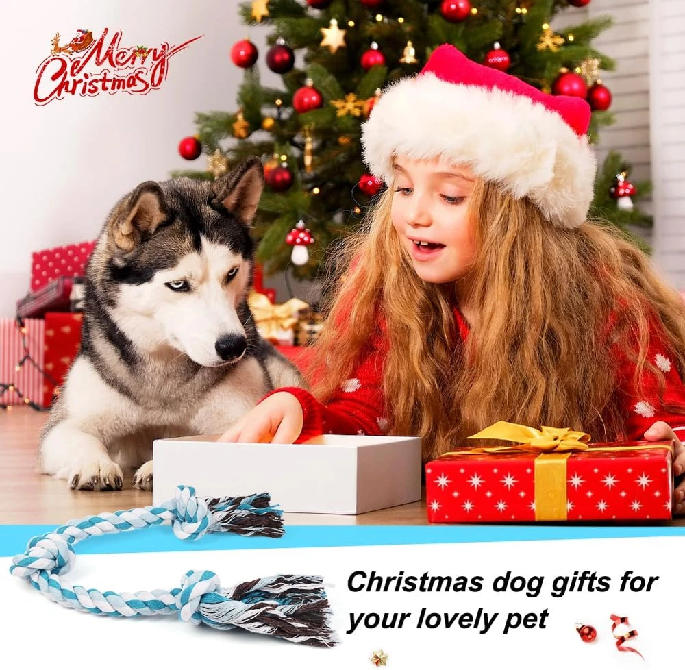 SAFETY MATERIAL -This puppy rope toy is made of natural cotton, safety and sturdy, allowing your pet enjoy chewing and playing IDEAL FOR SMALL MEDIUM AND LARGE DOGS - Our durable dog toys has 3 knots and 24inches long, designed for small,medium and large dogs, not for extra large dogs RELIEVE ANXIETY &PROTECT FURNITURE - Dogs love to chew on things, they will reduce anxiety by chewing. Now you can give them their own rope chew toy instead of your shoes, sofa and furnitures TEETH CLEANING - Natural material cotton fiber of this tug toy for dogs can gently and deeply clean between the dog's teeth, prevent the accumulation of plaque, achieve the effect of massaging the gums, and keep your dog's teeth healthy TUG OF WAR DOG TOYS - If your pet likes to tug of war, we recommend you try this dog rope toys. Vast majority of dogs enjoy tug of war, which keeps them healthy and happy Product Description Specifications: Material: Natural Cotton Color: Blue Length: 24inches Package content: 1PC 3 Knots Chew Rope Toy