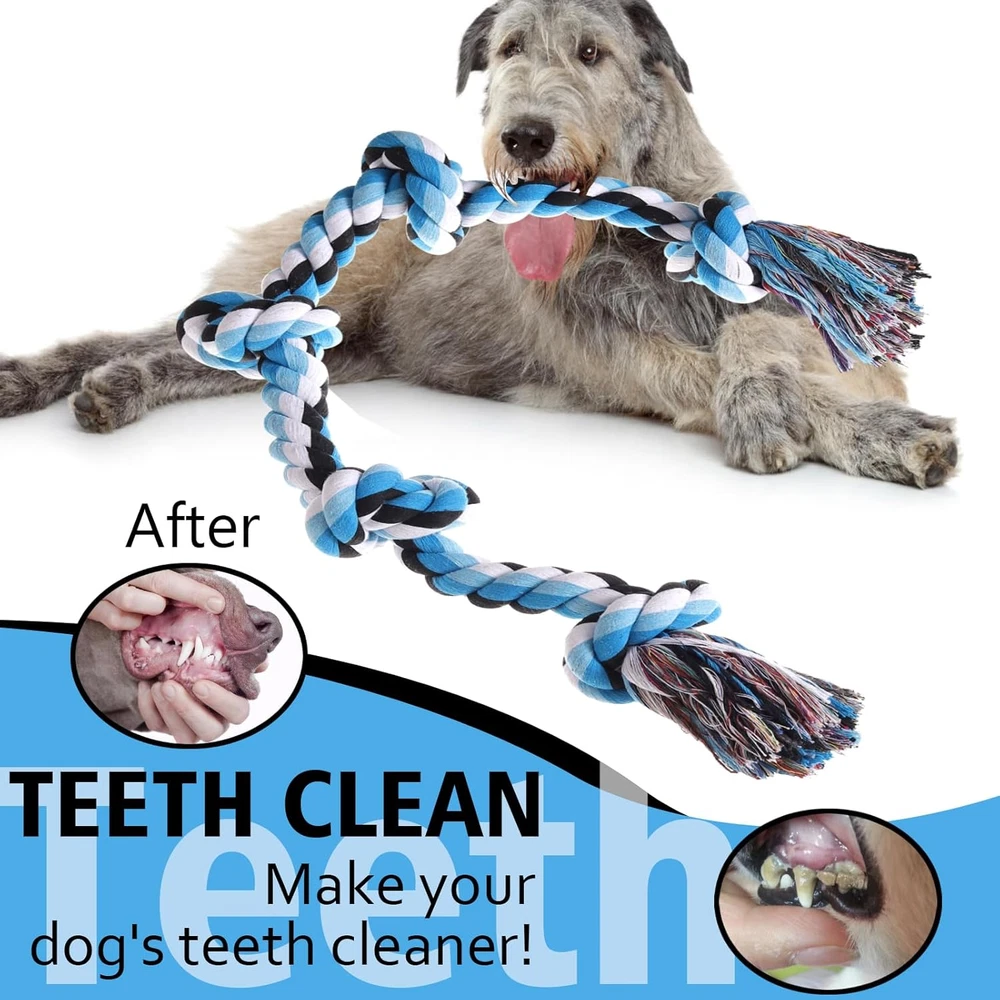 INTERACTIVE FUN DOG TOYS: Perfect for interactive playtime with your large medium dogs, this dog rope toy is finished with 3 feet 5 sturdy knots at each end, making it indestructible and easy to throw, catch and carry, ideal for playing tug of war dog toy! 100% NATURAL COTTON: This premium rope dog toy is made from natural washable cotton finished with sturdy knots, making it a safe and non-toxic chew toys, and a durable tug rope for playing with your best friend. Tough but won't hurt your dog's teeth or gums. SAFE & DURABLE SOLO PLAY: Keep your pet busy when you’re not around – this cotton chew toy for dogs is a great way to keep aggressive chewers away from your furniture, with a safe and satisfying dog chew rope. DENTAL CLEANING & TEETH CARE: The fun way to clean your dog’s teeth! The cotton dog rope fibers floss your dog’s teeth as they chew and play, so daily tugging helps maintain your pup’s oral health and stress relief by chewing rope toys. HEAVY DUTY TOUGH ROPE TOYS: Designed for medium to large dogs and aggressive chewers, Our rope toy for dogs is nearly indestructible, more resistant and durable than our competitors, but in rare cases, extremely powerful chewer may destroy it, if that happens, please contact us and we will send you a replacement. Product Description