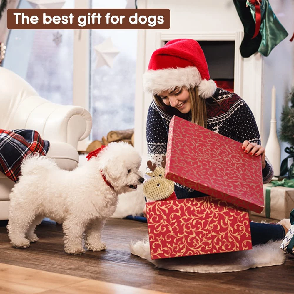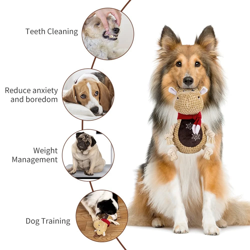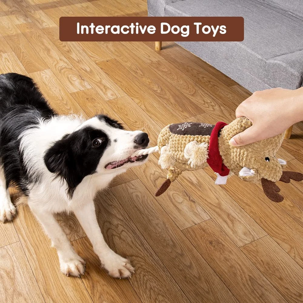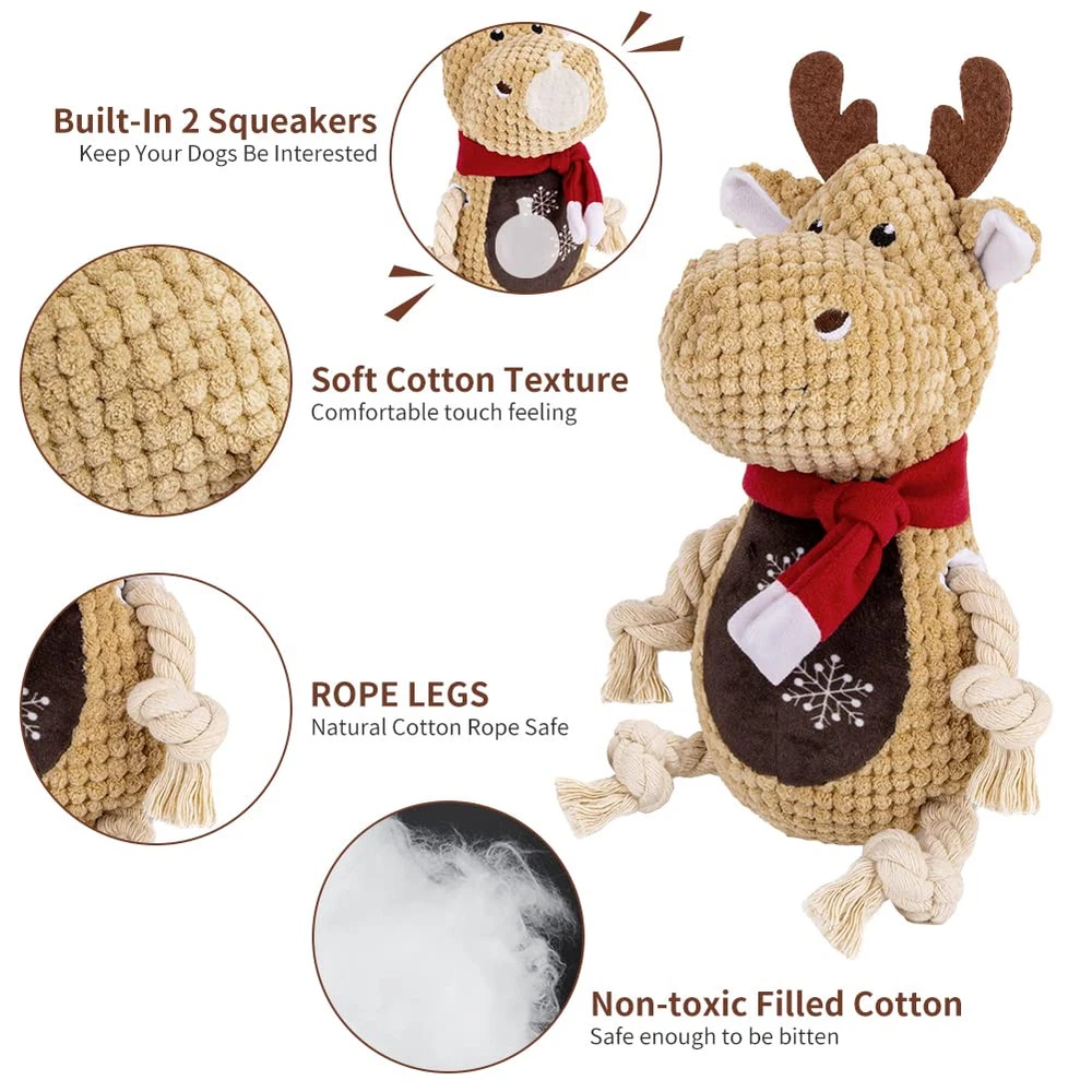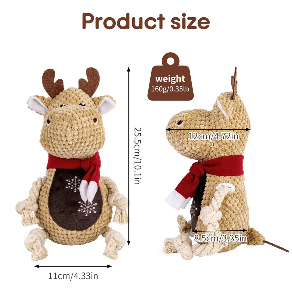 🐩Funny Squeaky:This dog squeaky toy built-in squeaker that emits a sound when pets bitting it, allow your dogs to chew it for reducting boredom, and its ears and tails were made of crinkle paper that helps entice play for extra excitement.You can also play using the durable rope leg with you dog. 🐩Comfortable Material: squeaky dog toys makes with an ultra-soft plush material with a cuddly natural cotton texture, very safety to your dogs, also natural cotton rope legs make the toy more durable and bite-resistant that is a perfect cuddle buddy. It is very easy to clean, just wash toys by water and washing machine after playing. 🐩Unique Design:Durable dog toy has a fox shape design and shape design,which is perfect for puppy,smalland middle,large dogs(do not suit for extreme aggressive bite dogs).shapes for your choice. 🐩Keep Teeth Clean:Dog chew toy can highly clean the dog's mouth, stimulate gums and reduce plaque and tartar, promote healthy teeth, pets will increase exercise to maintain weight and by playing the toy. 🐩Emotion and Interactive Toys:When your puppy is bored at home, they may damage the sofa, door and chair.Squeaky dog chew toys are great for fetching games or as a puppy's comfort toy to relieve your dog's depression, boredom and anxiety.Our dog squeak toys are suitable for puppies, medium and large dogs.It is also a good gift to your dogs for christmas,birthday,valentines day,etc