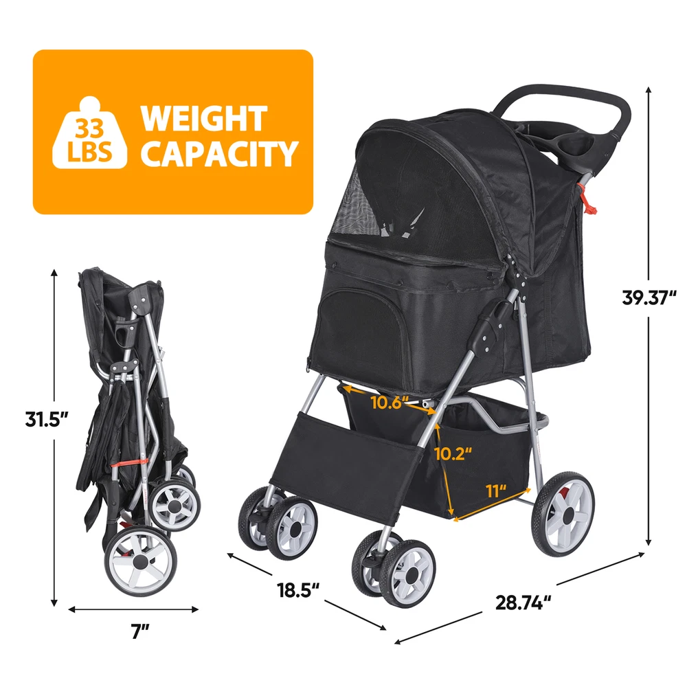 Brand: SEGAWE Dog Size: XXS, XS, S, M, Up to 30 lbs per Basket MPN: P01-2314@#S01 gtin13: 758277383905 UPC: 758277383905 Features: Cup Holder, Foldable, Rain Cover/Rain Screen, Shock Absorber Color: Black Type: 4-Wheel Pet Stroller
