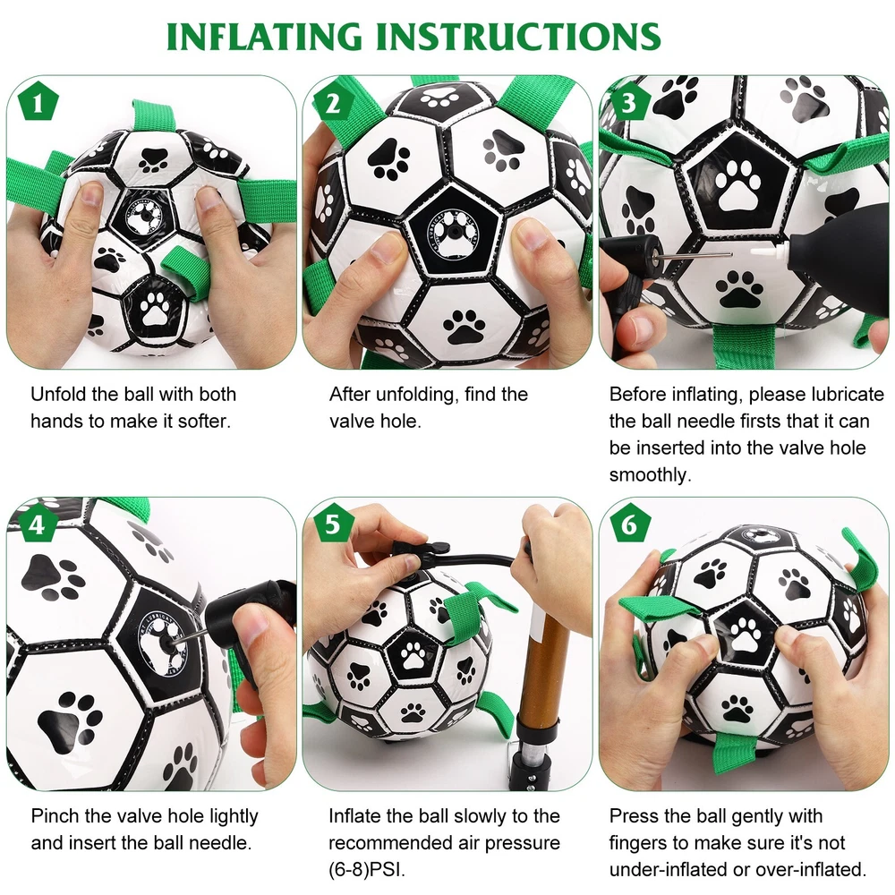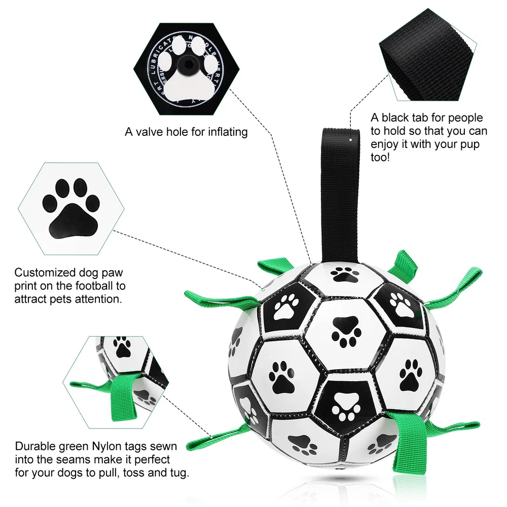 Dog Toys Soccer Ball with Interactive Pulling Tabs, for Tug of War, Birthday Gifts, Water Toy, Durable Dog Ball Toy for All types of dogs. Take Care of Your Dog: The dog soccer ball, comes with the same safety standards as children’s toys, is made of advanced highly elastic TPU that is the material of professional soccer ball, so that it can be easily kicked farther. The material is odorless, non-toxic, harmless, wear-resistant, anti-bite, and easy to clean. Premium Durable Material: High-quality rubber liner with a protective layer of pure cotton yarn, as well as an extra layer to protect the liner make it hard to be bitten and broken. High-quality nylon tabs sewn evenly into the seams attract dogs to chase and enable them to fetch, pull, toss, tug and retrieve easily. Playing Anywhere: With the lightweight and buoyant design, it can be played in the pool, lake, also beach. The soccer ball aims to keep your dog entertained, active and help you stay engaged with your dogs. Easy Handling: The ropes on the surface enable dogs to pick up and fetch easily. Additionally, the long rope at the top of the ball is easy for humans to grip and toss, making it easier to play with and train your dogs. Safety-Oriented: Made of natural durable rubber which is non-toxic, eco-friendly, chew-proof, safe, soft, and elastic, it helps with cleaning your dog’s teeth, also, the bright color is perfect to arouse dog’s interest and help them develop intelligence.