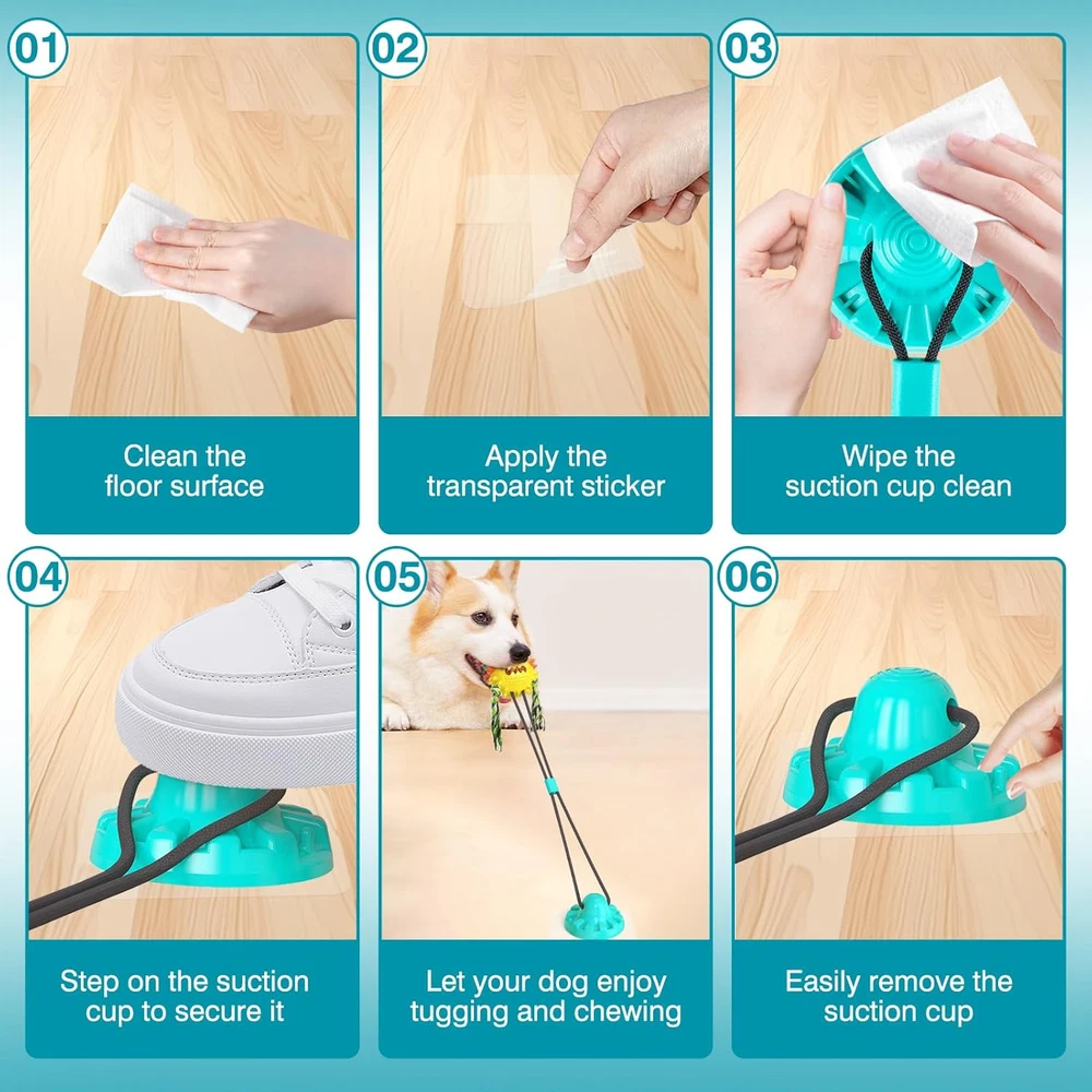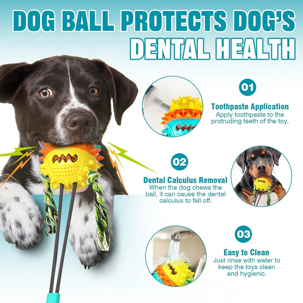 KEEP TEETH CLEAN, PROMOTE WELL-BEING: The dog toys focus on dogs’ oral health, and suction cup dog toy goes beyond being just a plaything—dog toys for aggressive chewers's more an expression of love. Specifically designed for aggressive chewers, this interactive dog toys encourages dog's teeth to rub against dog ball surface during play, mimicking a teeth-brushing effect. Regular use of this puppy teething toys helps prevent tartar and calculus buildup, ensuring long-term oral health for pet. SUPERIOR PULLING FORCE, MAXIMUM FUN: Interactive dog toys recognize the energetic nature of dogs, so puppy toys are durable. This indestructible dog toy can withstand up to 200 pounds of pulling force, ensuring dog toy durability during intense play. Say goodbye to concerns about dog chew toy damage caused by enthusiastic pulling, and this suction dog toy can effortlessly meets dog's entertainment needs. Enjoy worry-free interactive play with your furry friends with tough squeaky dog toys. TPR MATERIAL, TOUGH AND DURABLE: Pet owners value the durability of dog toys, dog chew toy is crafted from high-quality TPR material with exceptional wear resistance. The strong construction of the dog tug toy allows interactive dog ball to withstand enthusiastic bites and play, making dog rope toys a reliable companion for both everyday playfulness and excitement. Enjoy endless laughs with furry friend, thanks to this indestructible dog toy that promises an unparalleled interactive experience. ENTERTAINING AND NOURISHING, A HOLISTIC APPROACH: Beyond addressing physical needs, suction cup tug toy for dogs prioritizes mental health. In busy times for owners, dogs may feel lonely. Our dog boredom buster toys alleviates boredom, while interactive dog toys for boredom provide stress relief. Your pet will always feel warmth and companionship with dog tug toy, as this busy toys for dogs becomes more than just a plaything—dog toy becomes a source of care and intimate interaction with pet. DOG BALL DESIGN, BOOSTS APPETITE: Combatting loss of appetite in some dogs, our dog suction cup toys features a clever food-leakage design. By concealing dog food within the ball of the puppy chew toy, dogs are prompted to chew the dog ball toy to unlock delicious rewards. Not only do dog chew toys for aggressive chewers add fun to mealtime, but dog puzzle toy also promote healthy eating habits. Use this durable chew dog toy make mealtime an enjoyable and healthy experience for canine. Product Description A dog toy that eliminates loneliness and plays with your dog. SQUEAKY DOG TOY: THE PERFECT PLAY COMPANION FOR DOGS OF ALL SIZES FILL THE DOG’S BORING TIME AND ENRICH HIS GOOD MOOD
