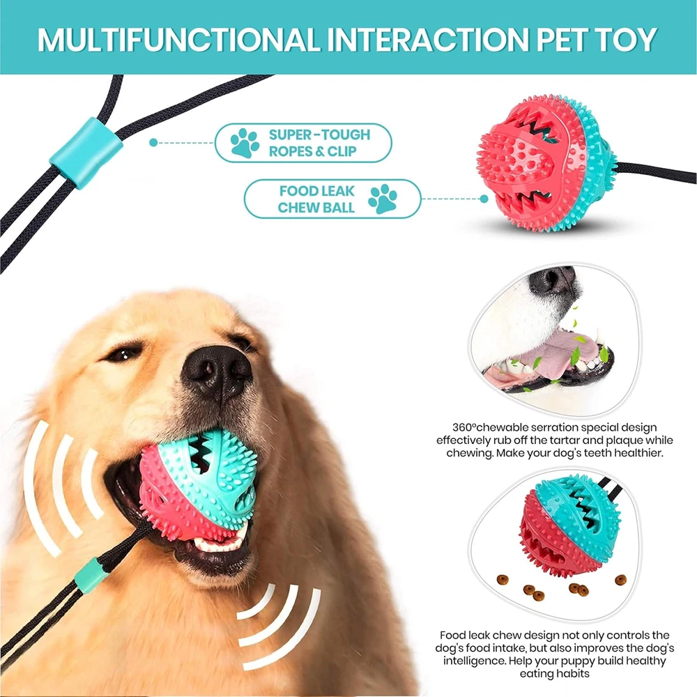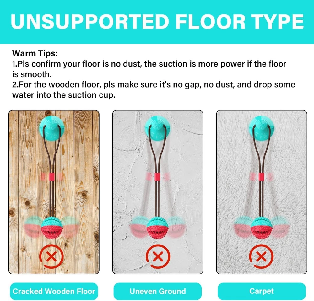 【Premium Quality Dog Tug Toys】suction cup ug Rope Toys is Made of natural TPR materials, environmental friendly, safe and harmless. The sturdy rope is made of high-density material and wear-resistant. Indestructible 【Puppy and Dog Toys for Teeth】 Dog rope puzzle toy not only can it bring joy to your pet,In addition, this is also a good teething cleaning tool, you can put the dog food in the ball, then dogs will try their best to eat the food, when the dog bites it, the serration inside can clean the food residue in the teeth 【Puzzle Toy for Medium Dogs】Dog Interactive Chewing Biting Toys is equip with strong suction cup more firmly adsorbed.It can sturdy adhere to the floor, door and glasses to let the pet self playing, just like a fun tug of war, Increase dog's interest, develop dog's intellgence 【Multifunctional Interaction】 Chew Toy Built-in small bell - When the ball is shaken, the small bell inside will make sound, attracting the dog's interest and increasing the interactive taste effectively Chews help relieve boredom and discourage destructive behavior 【Suction Cup Tug of War Toy for Dog】: CPFK is committed to designing the best toys for dogs. Each of our products has undergone strict quality testing, your SATISFACTION is the most important. If not completely satisfied with our product, we are here to help WITHIN 24 HOURS, please feel free to contact us Product Description SUCTION CUP DOG TOY Is Designed for Small, Medium and Large Dogs , TOYS to KEEP DOGS BUSY Chewing is the natural behavior of dogs, we can through the right way guide the dog and help the dog change its habit. The newly designed suction cup dog toy by CPFK can effectively help dog release excess energy and prevent the dog from bad behavior due to long-term boredom. Suction dog toy can effective help and mitigationwith chewing, separation anxiety, teething, boredom, training, barking, and more. IMPROVING ORAL HEALTH Puppy toys for teething small dogs not only brings joy to pets, dog teething toys also a great tool for cleaning teeth. There are molar particles of different sizes around the spherical surface of teething toys for puppies. When the dog bites the ball, suction cup dog tug of war toy with sawtooth particles to effectively remove tartar and plaque and improve the oral health of dogs. LEAKY EATING DESIGN Suction dog toy leaky eating design will make dog more clever and healthy. you can put the dog's food and medicine in the treat ball dog toys, and then the dog will try its best to eat the food. So can help the dog develop healthy diet habit, at the same time, it can also increase the fun of playing. MULTIFUNCTIONAL INTERACTIVE Indestructible dog toy great for chasing, tug of war, fetching, dog toys interactive rope toys can provide dogs with daily exercise, dog squeaky toys allows you to interact with the dog at any time, dog toys can enhance the relationship between owner and pet. And dog rope toys allows you making your relationship with your dog more intimate. DOG TOYS FOR SMALL DOGS: DURABLE AND RUGGED The ropes of squeaky dog toys are made of high-density material, which makes dog toy very durable and wear-resistant, make sure pets can play long time, no damage. Suction dog toys are made of natural TPR material, suction cup dog toys are safe and harmless to pet's health. Dog suction cup tug of war toy helps pets pass the boring time, relieve anxiety and stress, make dogs' life more fulfilling, dog toys to keep dogs busy. Suction Dog Toy Can Help with Kill The Boring Time, Relieve The Anxiety And Stress. Durable dog toys helping to meet the dog's instinctive needs. Sometimes we can't take the dog anywhere and help him choose this chew bell toy ball with suction cup. Dog toys can kill the boring time, relieve the anxiety and stress, to make dogs' life more fulfilling. Let our puppy enjoy the fun of toys at home and play happily every day. TUG OF WAR DOG TOY USAGE SCENARIOS: Puppy toys's suction cups work better on smooth and flat surfaces. Please do not use dog tug of war toy on matte wood floors, dusty walls and concrete surfaces. Dog Toys for Aggressive Chewers Product Specification: Dog Puzzle Toys Name: Suction Cup Dog Toy Dog Squeaky Toys Color: Red + Turquoise Durable Dog Toys Size: Total length 28.5 in Suction cup Size: 2.4 in*3.74 in Dog Toys Weight: 0.6 pound