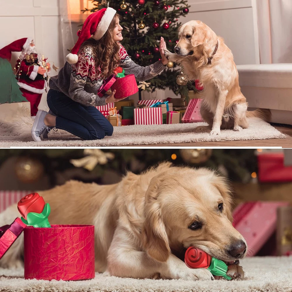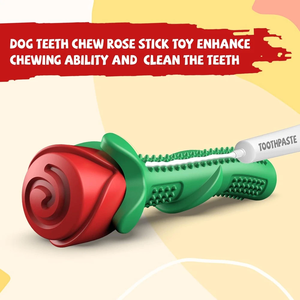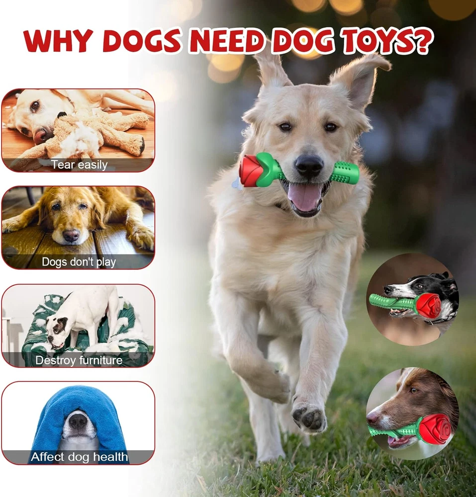 Dog Teething Toys:This dog toy is built to last. Made of absolutely safe TPE material is designed for aggressive chewers,except very aggressive dogs, it's flexibility and bite resistance are greatly improved to meet the dog's natural chewing impulse Unique rose shape Chew Stick:This makes dogs more excited. It stimulates the curiosity of dogs and the raised part stimulates chewing, which not only enhances chewing ability, but also cleans teeth and helps prevent serious dental health problems Interactive dog toys:Dogs spending a long time alone can make them feel anxious and even inferior. Interacting with dogs through this dog interactive toy increases the fun between dogs and makes the time when they are alone interesting Multifunctional:It can be used as a birthday,holiday,Festival Surprise. To help them train their teeth, improve their intelligence, and reduce damage to furniture or shoes. It can also be used on the golf course to train your dog to fetch balls For large medium small dogs:Our goal is to design the most durable dog toys for dogs and to provide dog owners with satisfaction. We know that dogs' behavior is unpredictable.No toy is indestructible, but this one is as close as it gets Product Description Dog Toy for Aggressive Chewers Keep Dog Busy Surprise For Them The best surprise for the Mothers Day,Valentine's Day,Christmas Day and Dog's Birthday. Enjoy the Moment of Interaction with Your Loyal Friends