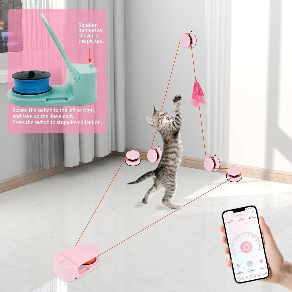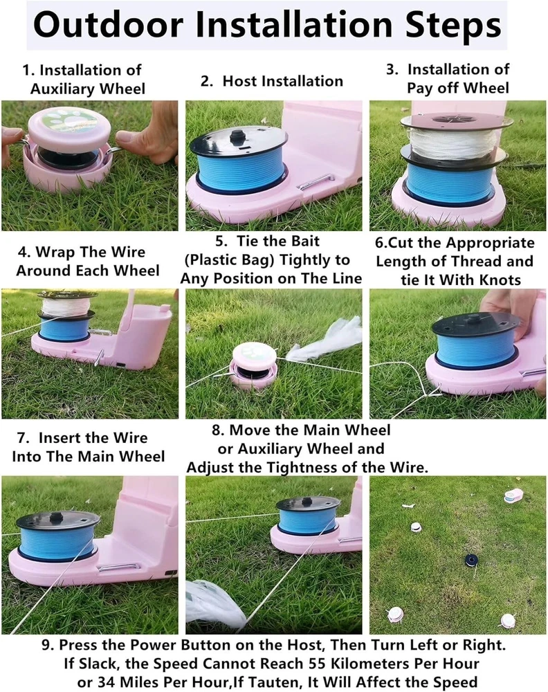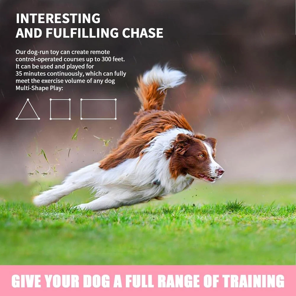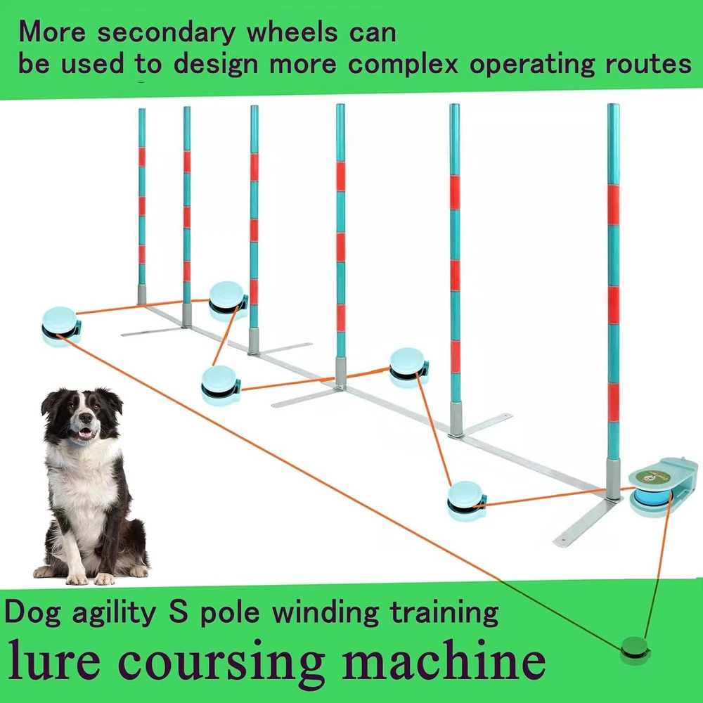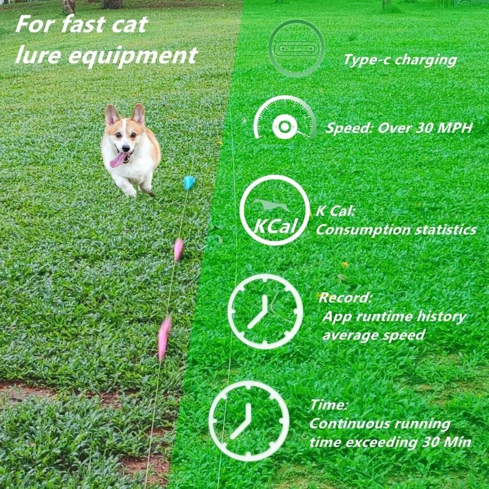 Dog Toys for Large Dogs,Lure Coursing Machine,Dog Chase Toy Motorized Line,Dog Agility Course Backyard Set,Dog Toys Green Outdoor Dog Toys: This is a Lure Coursing Machine that stimulates the hunting nature of Sighthoounds or cats. Most all Sighthound breeds love lure coursing natural ability to run fast and visually focus on something in motion. Dog Chase Toy: Quiet lure course machine over 55KM/H(34 MPH), Fully charged and can run continuously for up to 40 Min, Type-C charging, Convenient for outdoor and indoor installation,Sturdy packaging,And easy to carry. APP Intelligent Control: Record each running time (milliseconds), speed, total mileage, and calorie consumption. Custom mode controls operation. Start at a scheduled time, and freely set the duration of each run. Dog chase toy motorized line: This is an outdoor chase toy suitable for For Small Medium Large Dogs, which can effectively consume pet energy, increase dog or cat exercise, and burn pet calories. Rich accessories make it easy to install indoors and outdoors. Interactive Dog Toys:lure course machine The kit includes a main unit,4 pulleys, 100M of line(328 ftt), 5 indoor suction cups. 10 ground nails,tethers, a line winder, and a roll of 15 flags. Two driving hosts , it can achieve a continuous cycle of 400M line (1300ftt) and a speed of 64 kilometers per hour (39MPH)。The APP comes with a built-in timer, Which can be used for timing competitions. Most all Sighthound breeds love lure coursing events. It provides them a great outlet to use their natural ability to run fast and visually focus on something in motion. A mechanical lure which consists of a plastic bag attached to a movable line positioned slightly above the ground is controlled by a lure operator who moves the white bag in quick manner across a field according to the course layout, Simulating the unpredictability of a real chase.