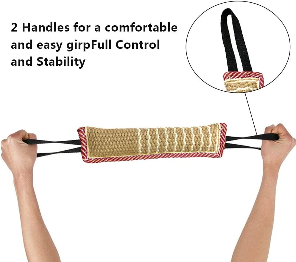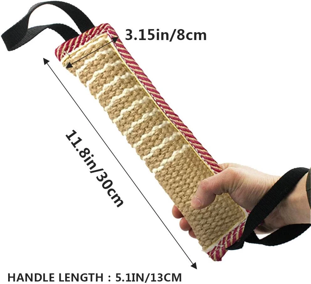 OUT OF THE ORDINARY: High quality dog bite tug toy with double stitching and a tough biting sleeve surface made of jute, withstand the daily tugging. 2 rope handles is comfortable and easy to grip, full control and stability. DOG TUG TOY: This is great interactive, reward, training and exercise toy, suitable for indoor or outdoor play—tug for war, police Favorites, ring sport, agility, creating prey drive or other more. SUITABLE SIZE: The toy is perfectly sized to make it easy to hold for an interactive play or fetch, while it won't cause any damage when thrown around by your dog. NOT A CHEW TOY: This dog tug toy is built safe and tough but no toy is indestructible. Tug Toys are meant for interactive tugging between you and your dog only, not chew toys. UNSUPERVISED CHEWING IS NOT RECOMMENDED: Tug Toys are meant for interactive tugging between you and your dog only, not chew toys. We strongly recommend that you do not allow your dog to keep the toy after interaction has finished and don’t let him bite the handles. Product Description 1 Strong Handle 2 Double Stitches Edge 3 Durable Linen 4 Clean Dog's Teeth Different colors and patterns to choose from! Add to Cart Add to Cart Add to Cart Add to Cart Add to Cart Add to Cart Price — $9.99 $ 9 . 99 $9.99 $ 9 . 99 $9.99 $ 9 . 99 $9.99 $ 9 . 99 $9.99 $ 9 . 99 $9.49 $ 9 . 49 Material Stainless Steel Linen Linen Linen Linen Linen Linen Colour Silver Pink & Yellow Green Black Blue Pink & Yellow Pink & Yellow Pattern No No No Footprint Footprint Footprint Flag Have sturdy handles? ✘ ✔ ✔ ✔ ✔ ✔ ✔ Suitable for dogs? ✔ ✔ ✔ ✔ ✔ ✔ ✔