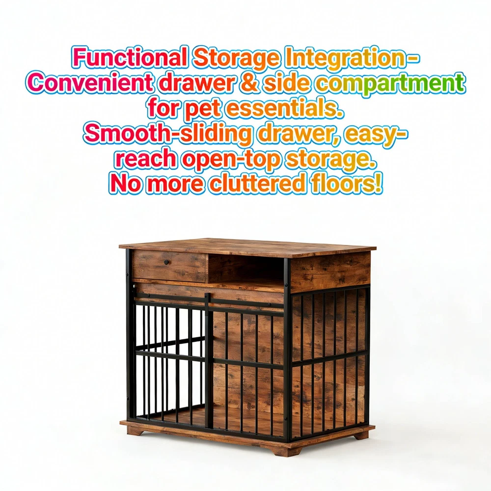 Dog Crate Furniture, Large Wooden Dog Kennel with Tray - Walnut+Black, for Medium & Large Dogs 🔥 Premium Dog Crate Furniture | 1-Year Warranty | 30-Day Free Return & Exchange 🔥 Upgrade your pet's living space and your home decor with this multi-functional wooden dog crate! Crafted for durability and style, it’s the perfect blend of pet comfort and human-centric design—ideal for medium to large dog breeds. ✨ Key Features Spacious & Sturdy Construction : 35.43”L x 23.22”W x 35.58”H dimension offers ample room for your dog to stand, move, and rest comfortably. Made of high-quality MDF wood + robust iron frame, ensuring long-lasting sturdiness and a premium look, suitable for indoor use. Functional Storage Solution : Equipped with a smooth-sliding drawer and side storage compartment. Keep pet toys, treats, bedding, and other essentials organized—say goodbye to cluttered floors! Metal handle ensures secure and easy drawer access. Safe & Secure Design : Evenly spaced rounded iron bars prevent injury while maximizing visibility and ventilation for your pet. Solid wood top and base enhance stability, resisting tipping and wear. Perfect for puppies, adult dogs, and multi-pet households. Tool-Free Easy Assembly & Maintenance : Pre-drilled holes and modular components make setup a breeze—no extra tools needed! Smooth wood finish and metal surfaces are easy to wipe clean with a damp cloth. Detachable design allows quick disassembly for storage or travel. Versatile Home Decor Complement : Walnut+black color scheme with weathered wood veneer and industrial metal accents blends seamlessly with modern, rustic, or contemporary interiors. Can be used as a dog bed, training crate, or decorative furniture piece—elevate your home while caring for your furry friend. 📐 Product & Package Details Specification Details Color Walnut + Black Material MDF + Iron Assembled Size (L×W×H) 35.43” × 23.22” × 35.58” Assembled Weight 69.00 LBS Package Size (L×W×H) 38.98” × 26.57” × 6.89” Package Weight 75.18 LBS Origin China 🛡️ Warranty & Return Policy ✅ 1-Year Quality Warranty: We stand behind our product! Enjoy a 1-year warranty against manufacturing defects. ✅ 30-Day Free Return & Exchange: Not satisfied with your purchase? Return or exchange it for free within 30 days (no restocking fee, buyer only needs to cover return shipping). Note: This dog crate comes with a removable tray for easy cleaning of pet messes. Please measure your dog's size (length, height) before purchasing to ensure a comfortable fit. 👉 Add to Cart Now and Give Your Furry Friend a Comfortable & Stylish Home!