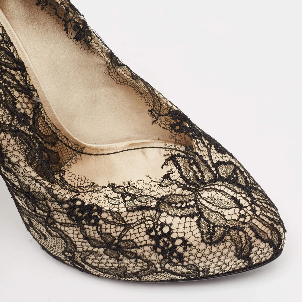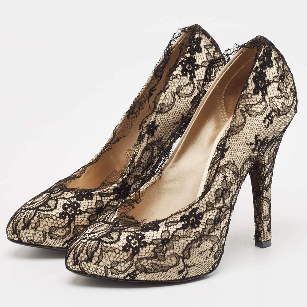 Our eBay Store About Us Contact Us Add to Favorite Sellers Dolce Gabbana Cream Satin And Black Lace Platform Pumps Size 385 Exquisite and feminine, these authentic Dolce & Gabbana pumps combine cream satin with intricate black lace and a dramatic platform design. Product Details Brand Dolce & Gabbana Color Cream Includes Original Dustbag, Original Box Outsole Length 23 cm Outsole Width 8 cm Size 38.5 Certified by The Luxury Closet This item has gone through a detailed authentication process overseen by our experts. We offer a lifetime guarantee of authenticity on all our items. How We Check The in-house team of experts at The Luxury Closet is highly trained to verify the authenticity and the condition of the luxury products. They ensure that only 100% authentic items are put on sale.The evaluation process is unique with its own mix of assessment criteria and differs according to the category. Each item is evaluated based on the following combination of hallmarks, hardware, stitching, symmetry, material, craftsmanship, stamping, codes, hologram stickers, and packaging. Our authenticators also check if the items have been modified or amended (e.g., aftermarket diamonds, replaced batteries, repaired bags, etc.) International Buyers Import duties, taxes and charges are not included in the item price. These charges are the buyers responsibility. Please check with your country’s customs office to determine what these additional cost will be prior to buying.