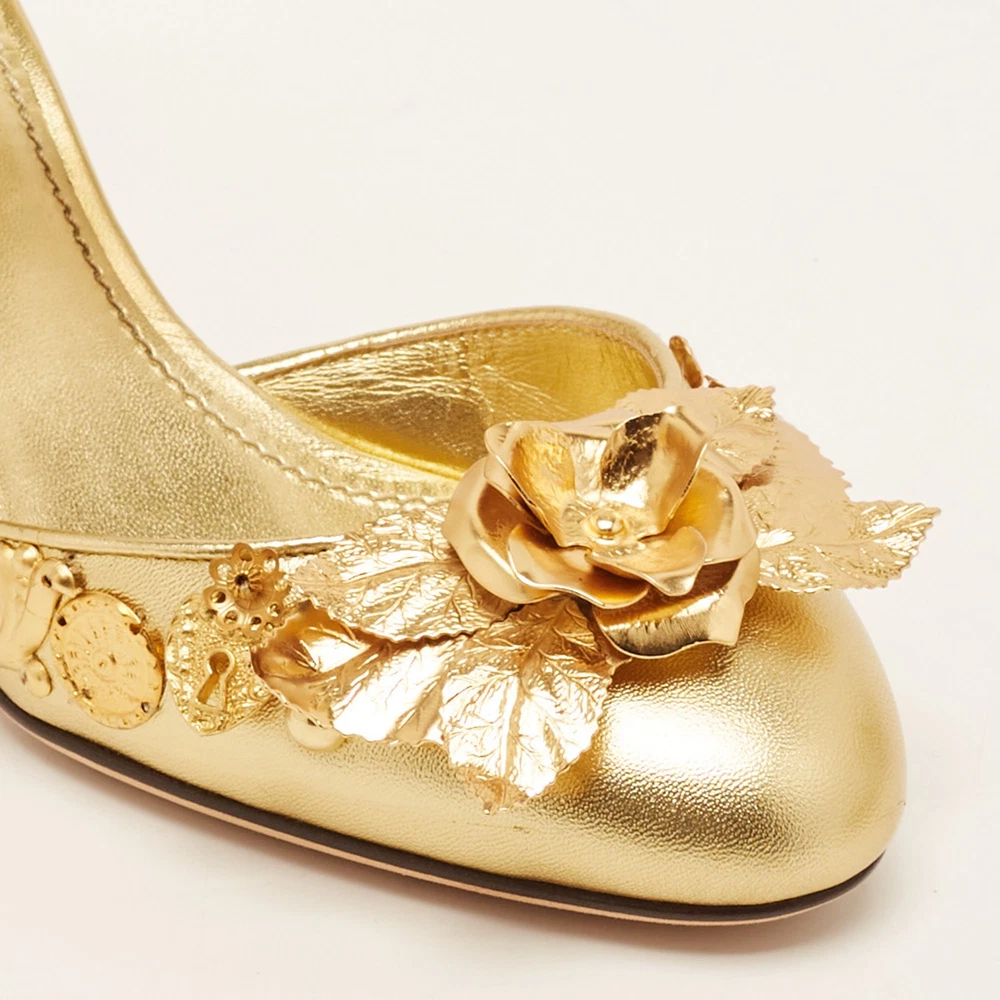 Designed in Dolce and Gabbanas extravagant style, these sandals ensure you a high fashion, diva look. They are rendered in gold leather and adorned with gold tone accents. The front straps are accented with a chunky, bejewelled flower motif, and the block heels are styled glamorously with beautiful embellishments. The ankle straps are secured with embellished buckles and insoles are lined with matching leather. This one is a pretty piece that will add bling to your evening ensemble.Certified by The Luxury Closet - This item has gone through a detailed authentication process overseen by our experts. We offer a lifetime guarantee of authenticity on all our items. Import duties, taxes and charges are not included in the item price. These charges are the buyers responsibility. Please check with your country’s customs office to determine what these additional cost will be prior to buying. Our eBay Store About Us Contact Us Add to Favorite Sellers Dolce & Gabbana Gold Leather Embellished Ankle Strap Sandals Size 35 $398.2 Designed in Dolce and Gabbanas extravagant style, these sandals ensure you a high fashion, diva look. They are rendered in gold leather and adorned with gold tone accents. The front straps are accented with a chunky, bejewelled flower motif, and the block heels are styled glamorously with beautiful embellishments. The ankle straps are secured with embellished buckles and insoles are lined with matching leather. This one is a pretty piece that will add bling to your evening ensemble. Product Details Brand Color Gold Dimensions Material Leather Size 35 Outsole Width 8 cm Outsole Length 23 cm Heel Height 6 cm Includes Original Dustbag, Original Box, Info Booklet Certified by The Luxury Closet This item has gone through a detailed authentication process overseen by our experts. We offer a lifetime guarantee of authenticity on all our items. How We Check The in-house team of experts at The Luxury Closet is highly trained to verify the authenticity and the condition of the luxury products. They ensure that only 100% authentic items are put on sale.The evaluation process is unique with its own mix of assessment criteria and differs according to the category. Each item is evaluated based on the following combination of hallmarks, hardware, stitching, symmetry, material, craftsmanship, stamping, codes, hologram stickers, and packaging. Our authenticators also check if the items have been modified or amended (e.g., aftermarket diamonds, replaced batteries, repaired bags, etc.) International Buyers Import duties, taxes and charges are not included in the item price. These charges are the buyers responsibility. Please check with your country’s customs office to determine what these additional cost will be prior to buying.