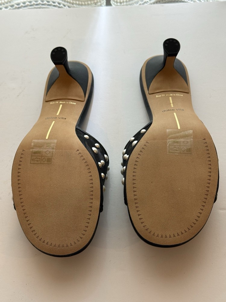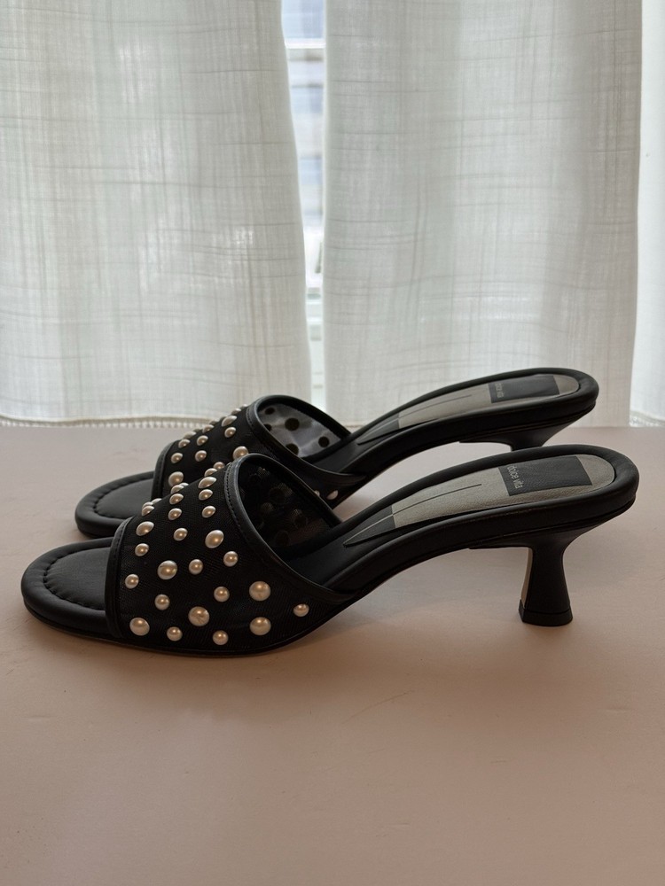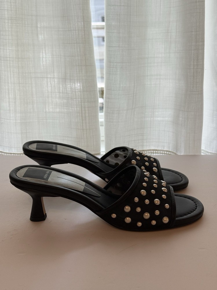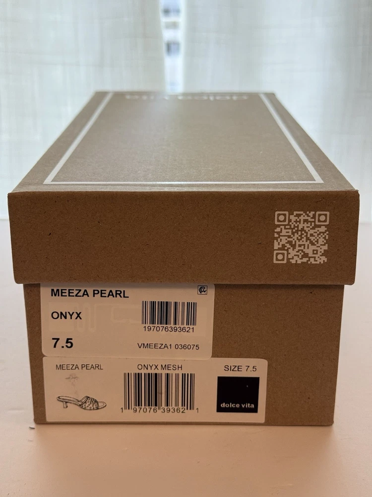 The Dolce Vita Black Meeza Pearl Onyx Mesh Kitten Heel Slide Sandals in size 7.5 are stylish and versatile for both party and casual occasions. The slip-on design with a kitten heel and faux leather lining adds a touch of elegance to these black sandals. The synthetic upper material and mesh detailing make them perfect for the summer and spring seasons. Made in China, these Dolce Vita sandals are a trendy choice for women looking for a chic and comfortable footwear option.