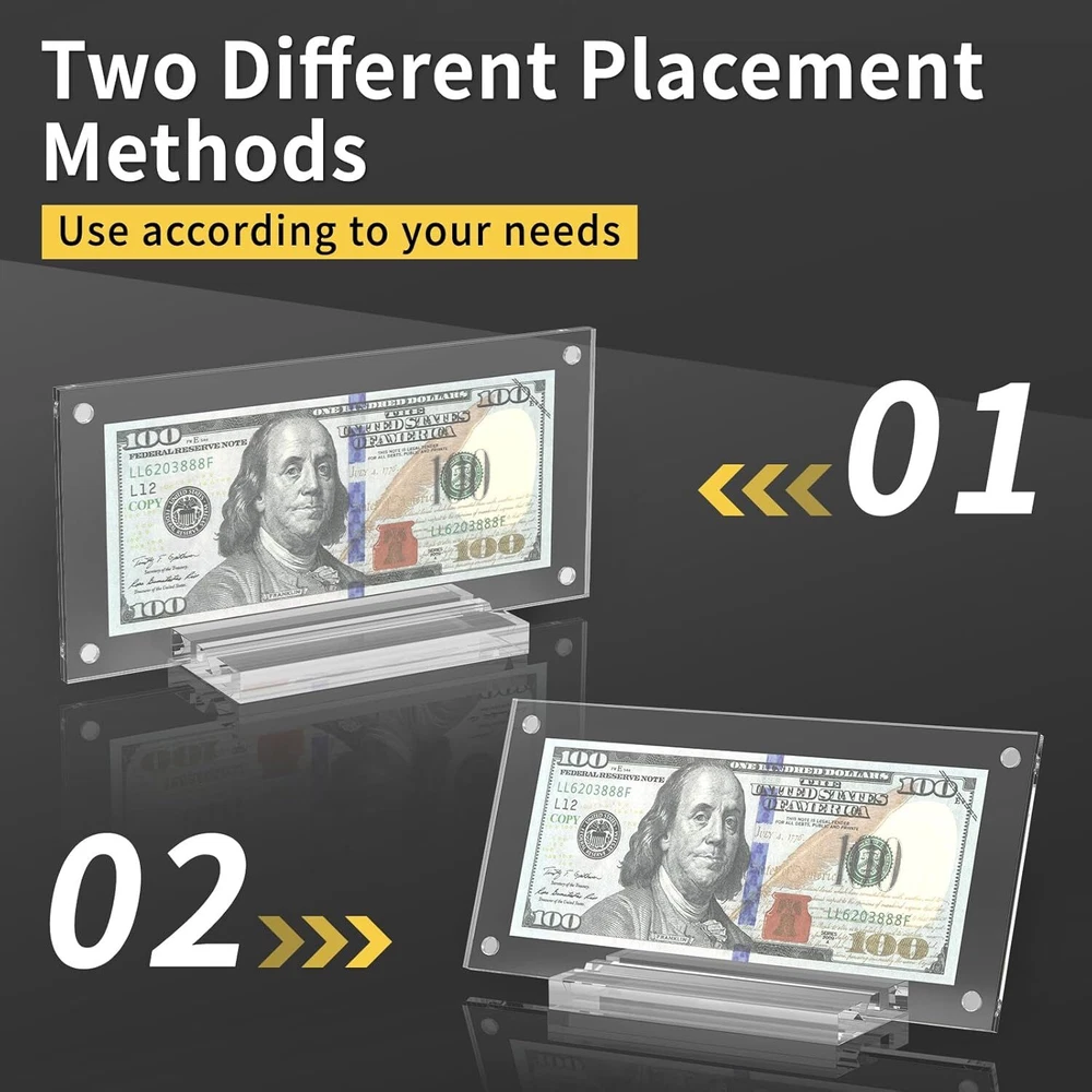 Clear dollar bill frame with base supports, designed for displaying photos, paper curre ncy, pictures, stamps, paintings, or other paper items and arts. Also suitable for real estate licenses and bank checks. This money frame enhances the visibility of your bills and is intended for tabletop or desktop display only. We have created vertical and slanted card slots for the display's base, providing you with additional angles to display your certificates, commemorative coins, and other items. Whether placed in a room or office corner, it will exude an exquisite and tasteful appearance. Our acrylic money holders have a practical magnetic design, making installation effortless and tool-free. Just align the panels and let the magnets handle the rest, saving you time and effort during assembly. This acrylic paper money display case features a double sided transparent window design, allowing for clear visibility from both sides. The case has smooth edges, excellent transparency, and clarity. It is ideal for storing banknotes, commemorative coins, and other items, while also providing an elegant and classic feel.
